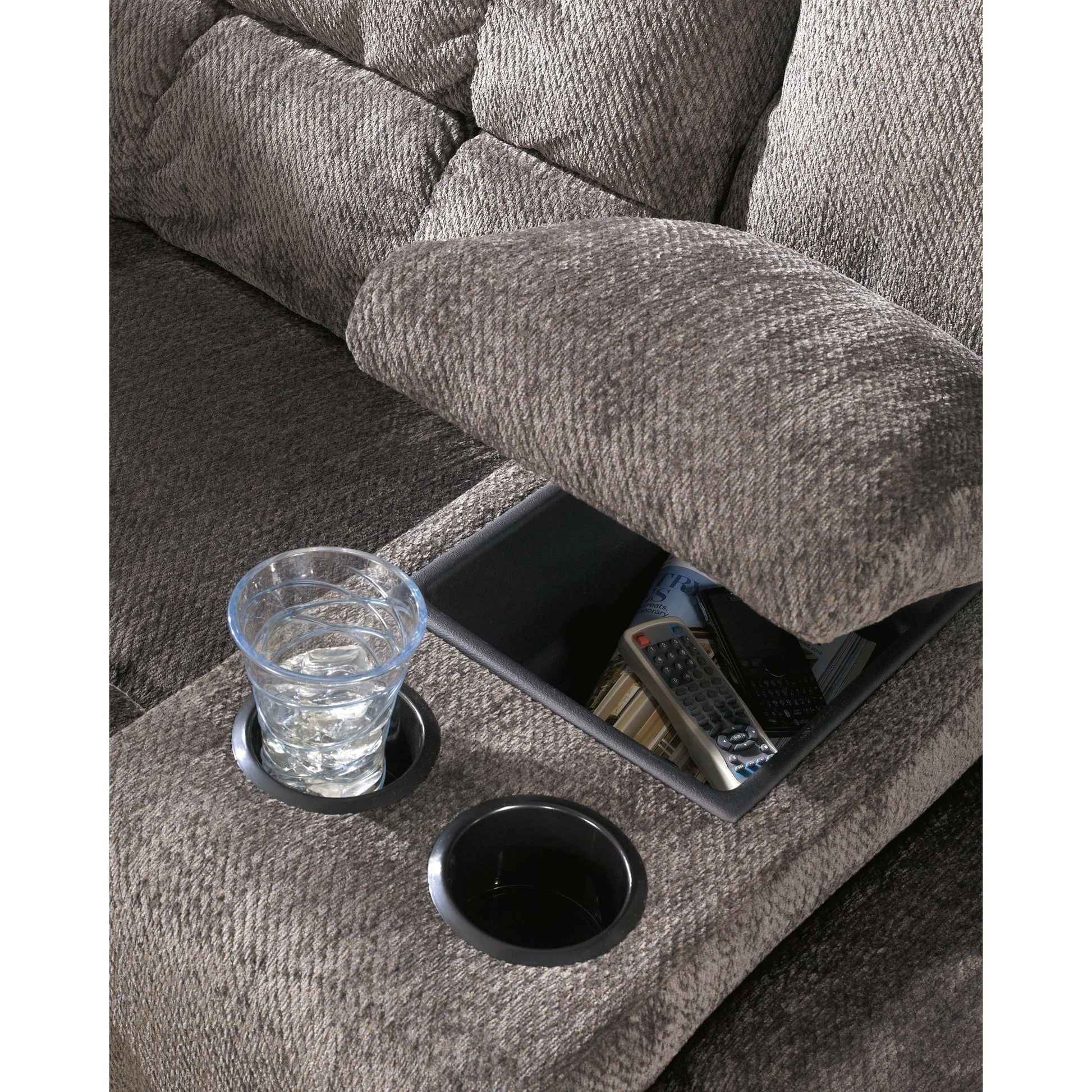 Comme si son dossier matelassé à tournure ne suffisait pas, cette causeuse est dotée d'accoudoirs généreusement rembourrés qui rehaussent le confort. La console centrale est équipée de porte-gobelets pratiques et d'un compartiment de rangement astucieux. Son revêtement en chenille ultra-doux confère à ce meuble un luxe incomparable.