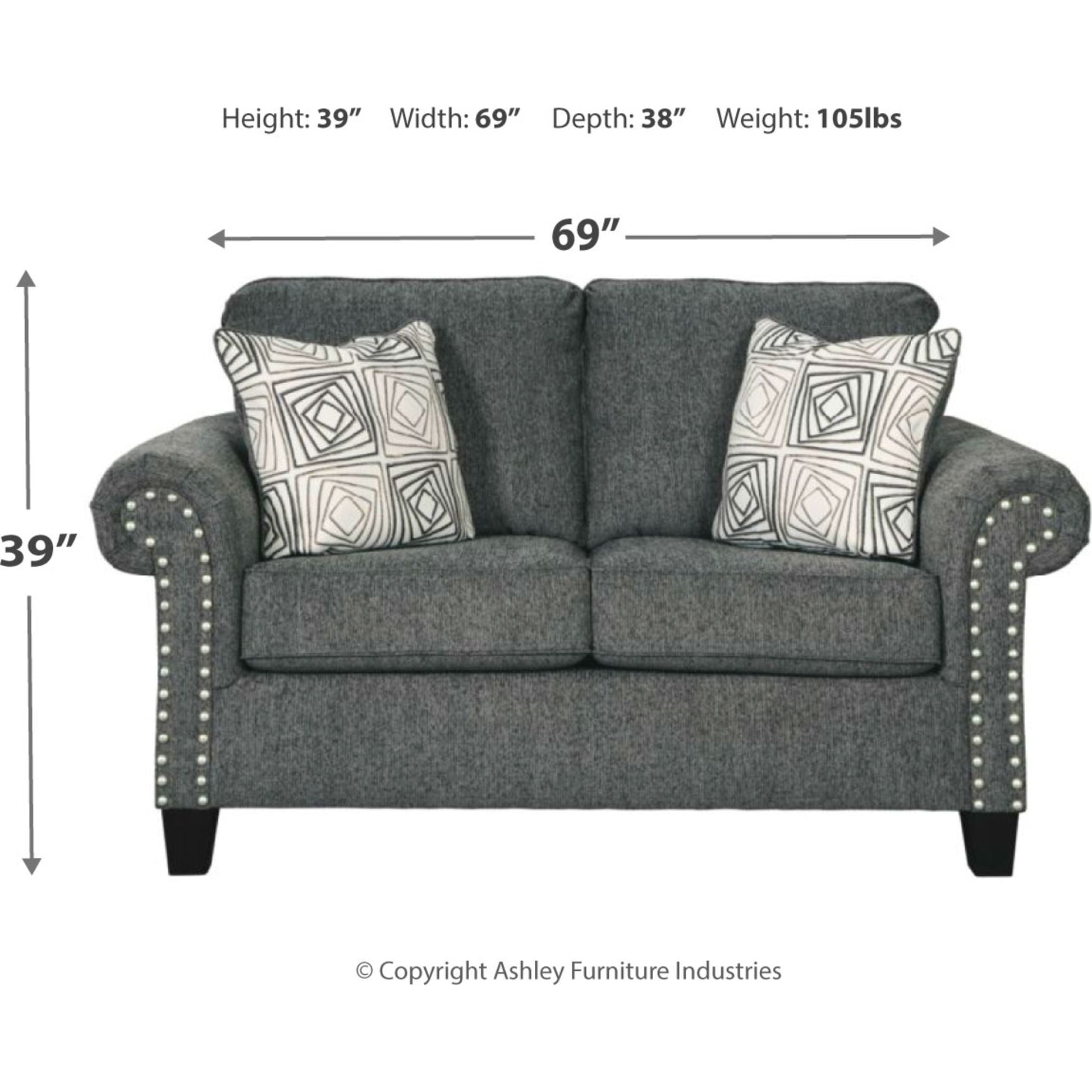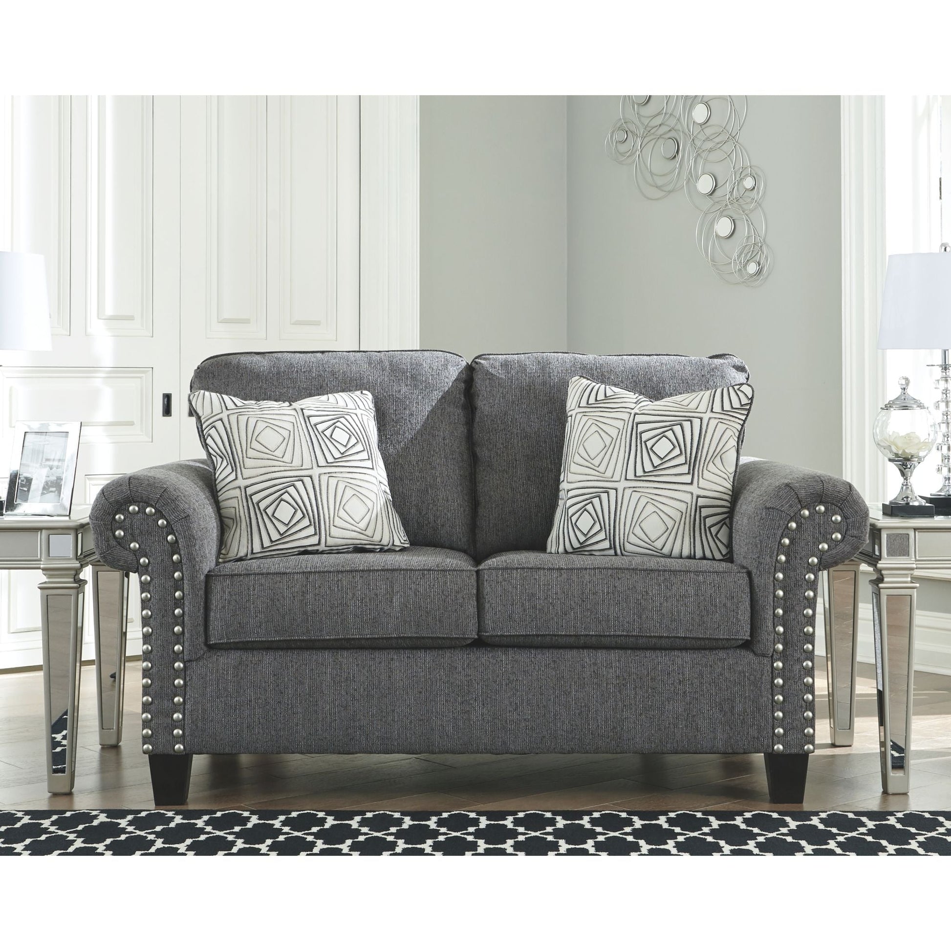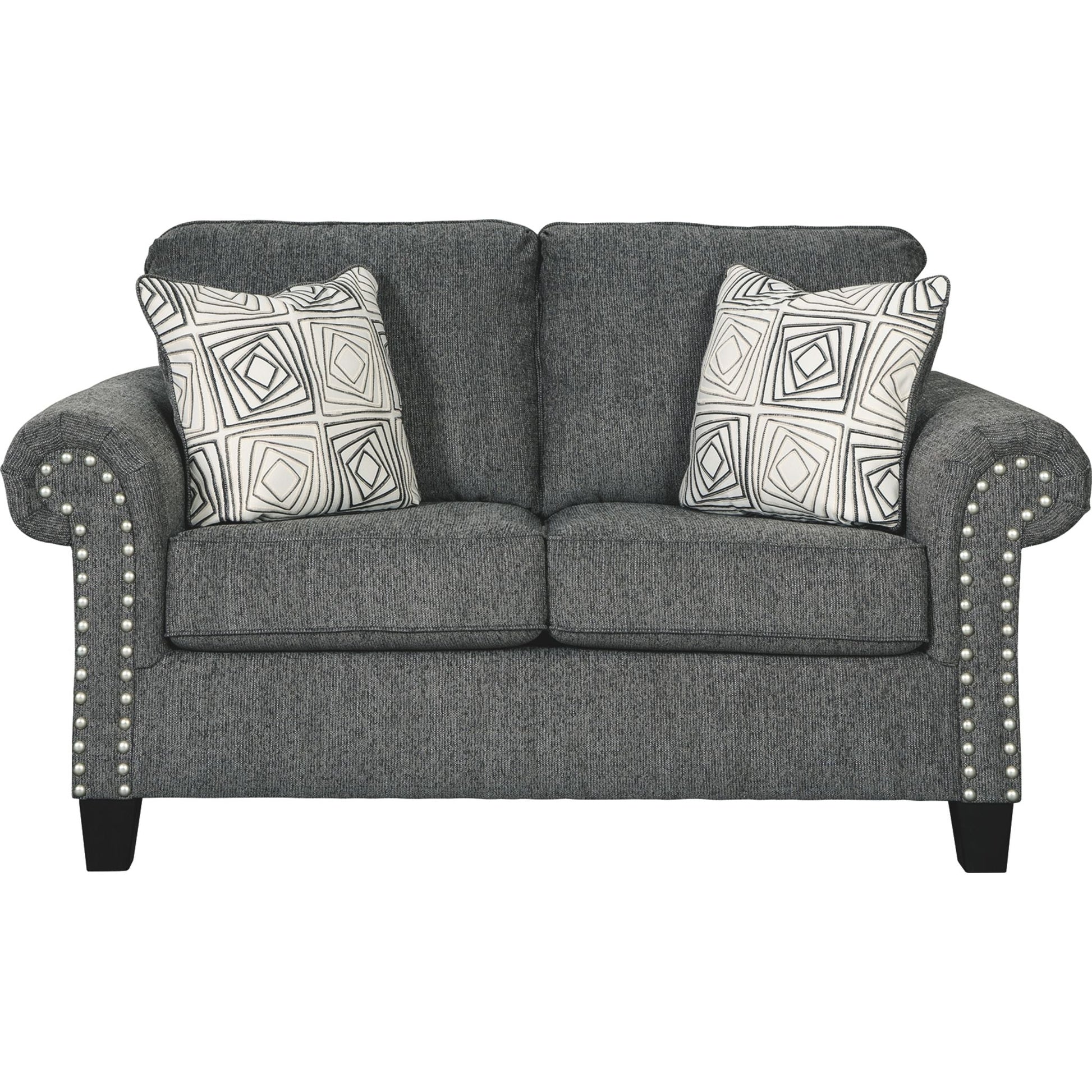 Un rêve contemporain. Cette causeuse a tout pour plaire. Son profil design est accentué par des accoudoirs roulés et une finition cloutée couleur étain. Revêtue d'un tissu chenille texturé, elle est à la hauteur de son style. Des coussins géométriques affichent un motif envoûtant. Des pieds fuselés complètent le style.