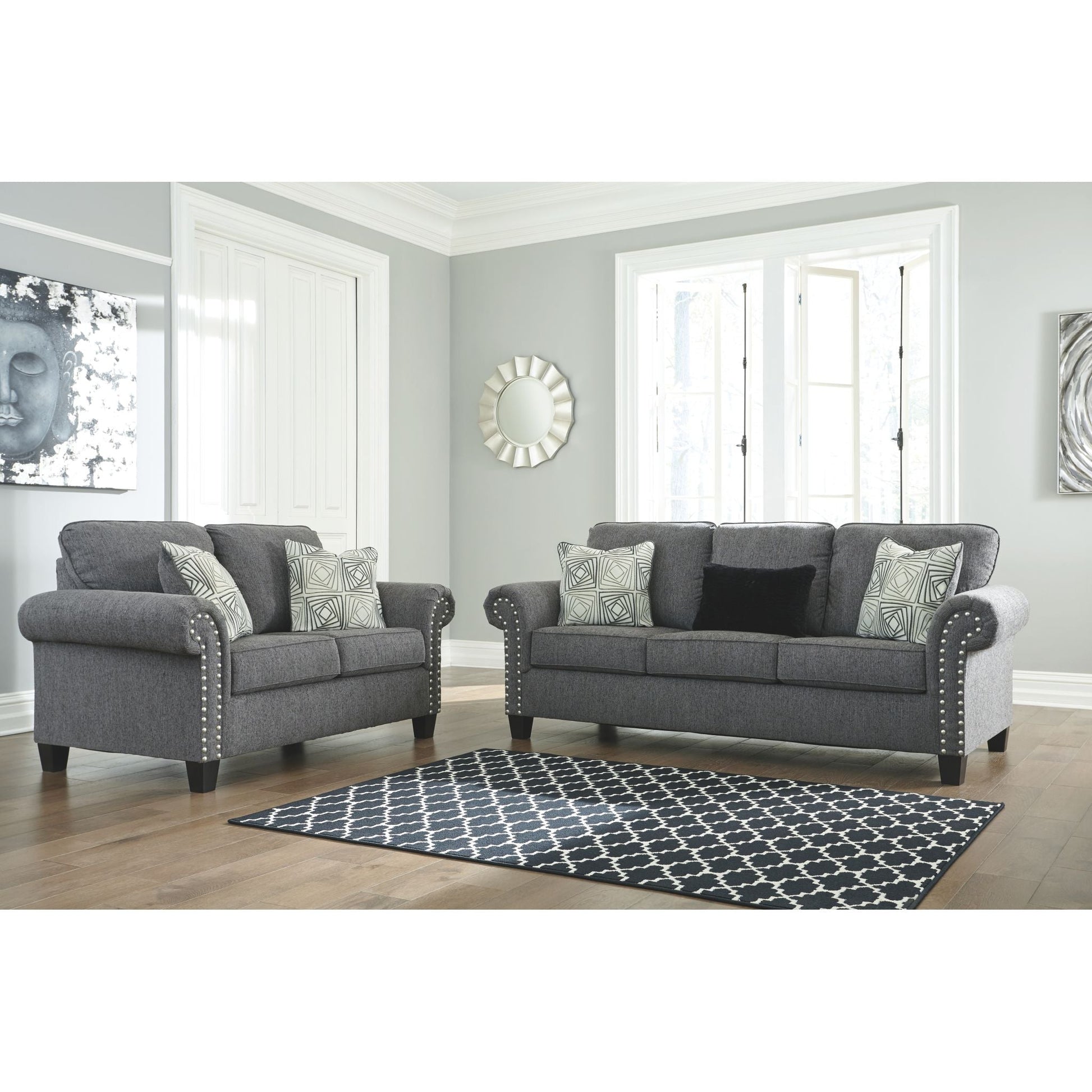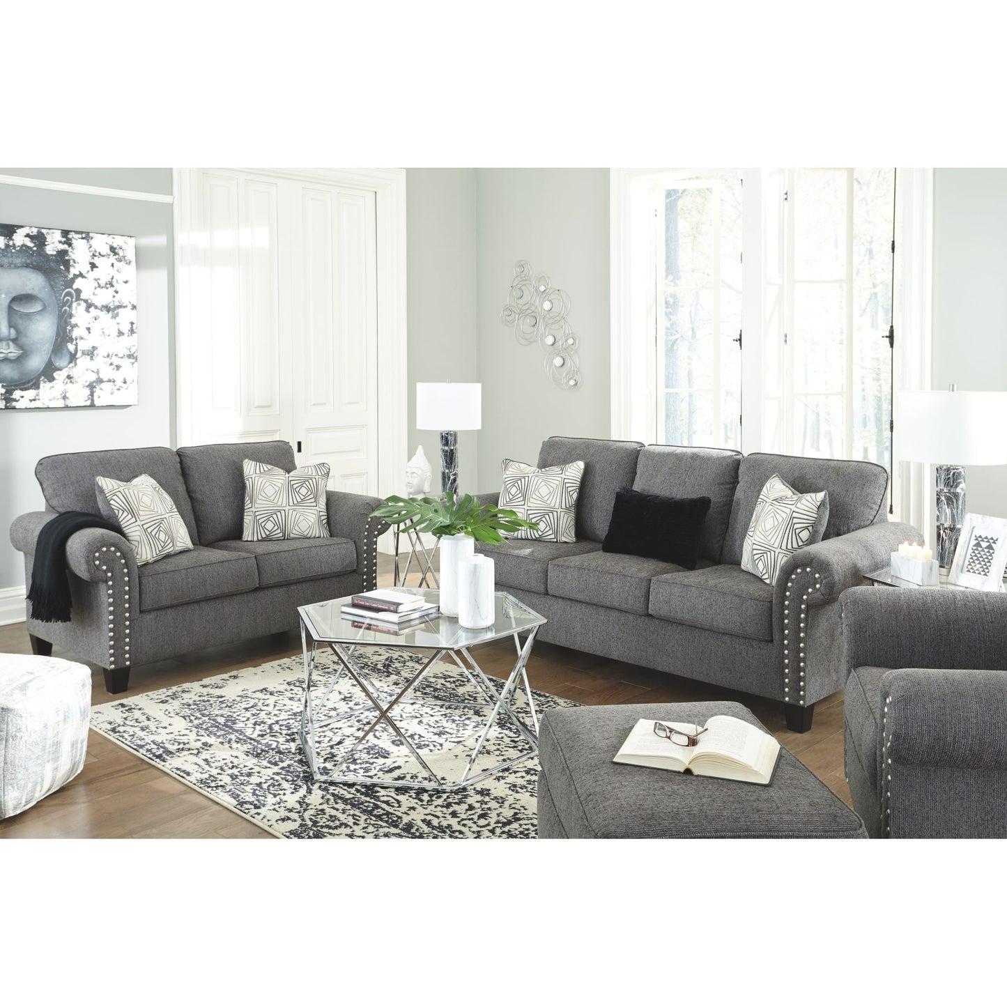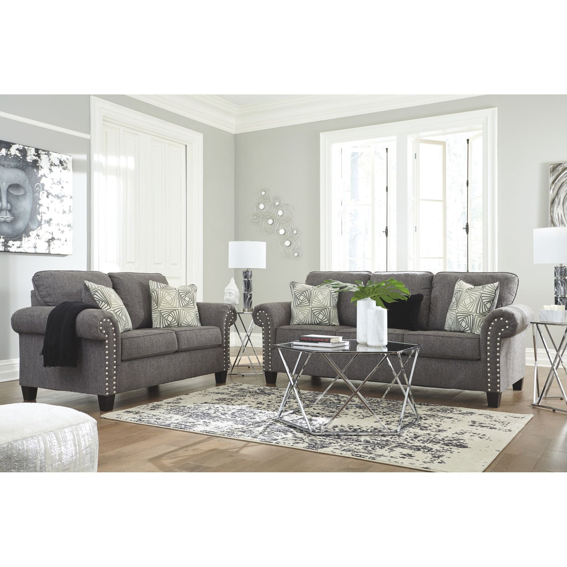 Un rêve contemporain. Cette causeuse a tout pour plaire. Son profil design est accentué par des accoudoirs roulés et une finition cloutée couleur étain. Revêtue d'un tissu chenille texturé, elle est à la hauteur de son style. Des coussins géométriques affichent un motif envoûtant. Des pieds fuselés complètent le style.