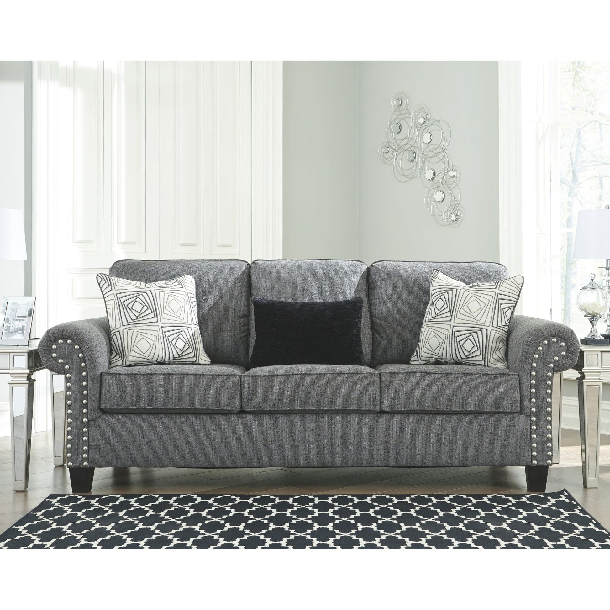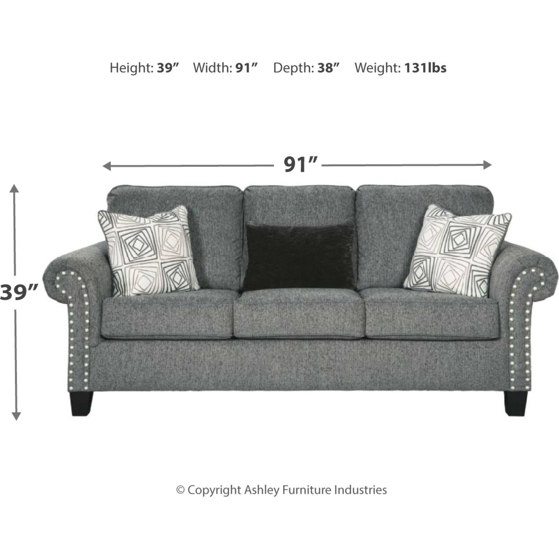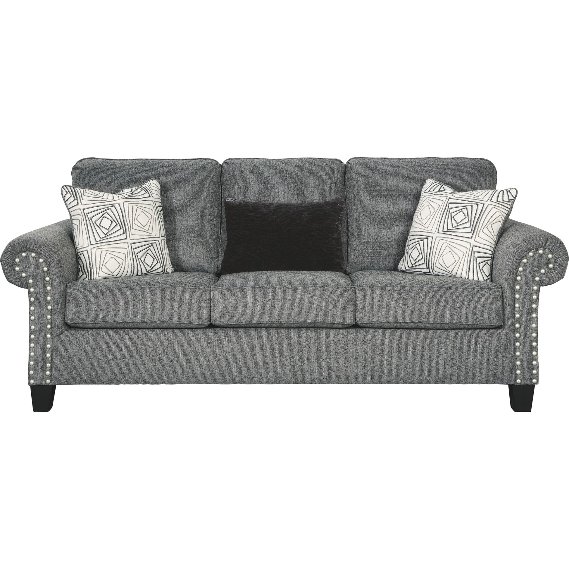 Un rêve contemporain. Ce canapé a tout pour plaire. Son profil design est accentué par des accoudoirs roulés et une finition cloutée couleur étain. Revêtu d'un tissu chenille texturé, il est à la hauteur de son style. Des coussins géométriques arborent un motif envoûtant. Un coussin rognon en fausse fourrure jacquard noire apporte une touche de luxe supplémentaire. Des pieds fuselés complètent le style.