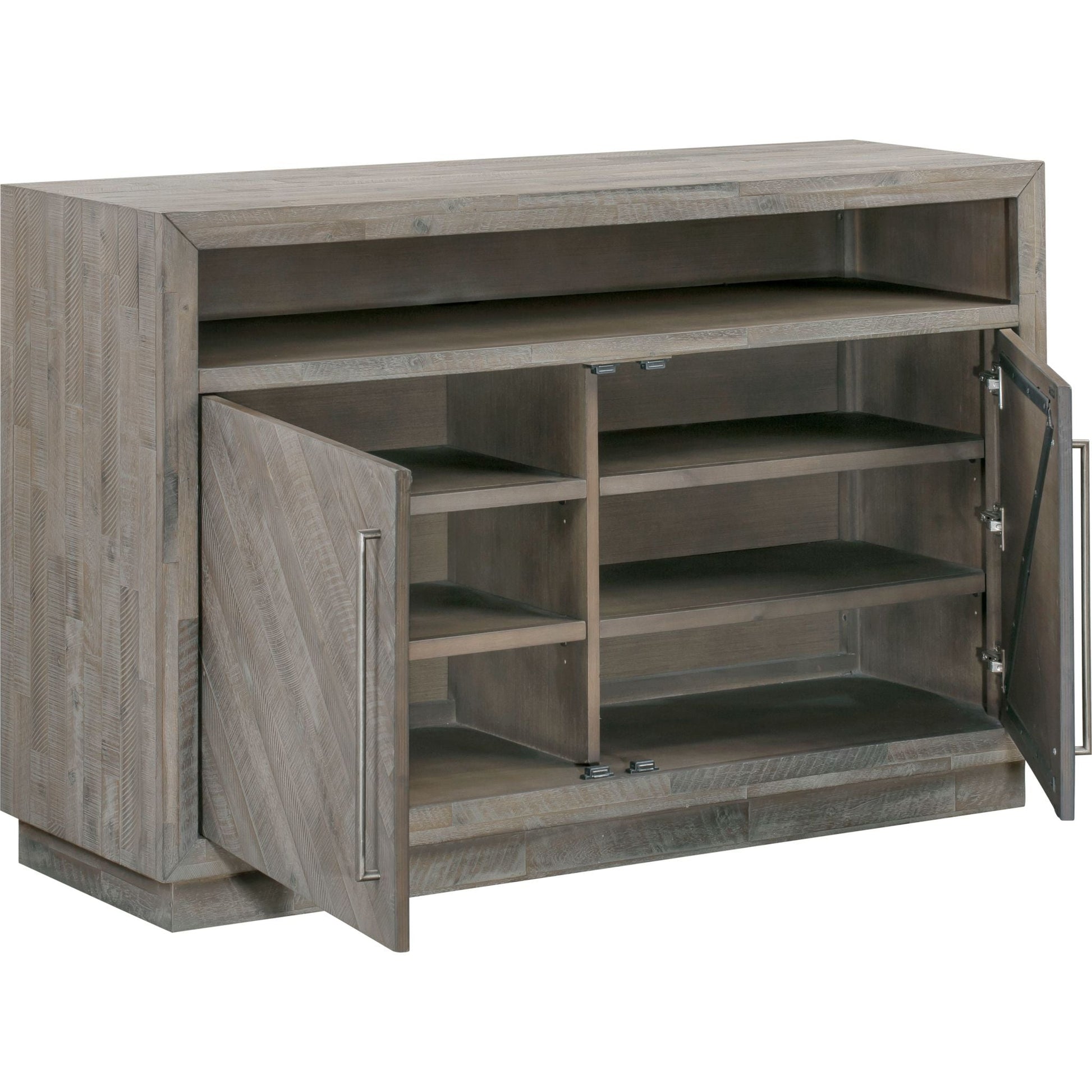 Rustique et contemporain. Le charme de la collection Alexandra réside dans l'acacia brut utilisé pour sa création. Les planches de bois massif sélectionnées à la main sont soigneusement poncées, teintées et blanchies à la chaux pour un effet bois flotté qui accentue le veinage et fait ressortir les nœuds et les marques naturelles du travail. Elles sont ensuite incrustées sur du contreplaqué pour créer un élégant motif à chevrons, et complétées par de fines poignées métalliques pour une touche contemporaine. Cette console multimédia, présentée en finition Rustic Latte, comprend un compartiment ouvert et deux portes avec étagères.