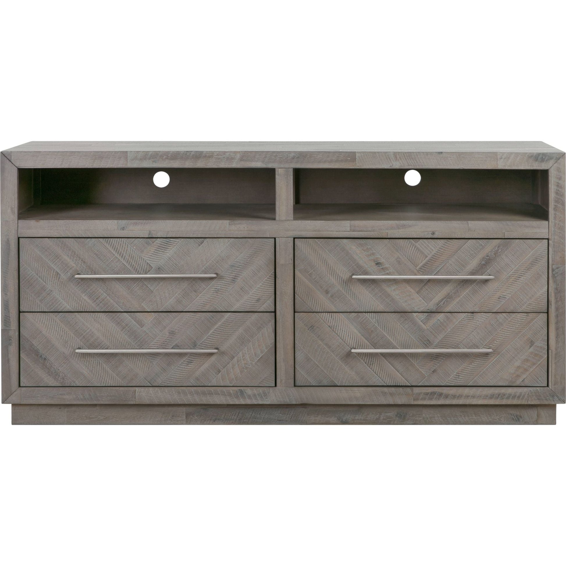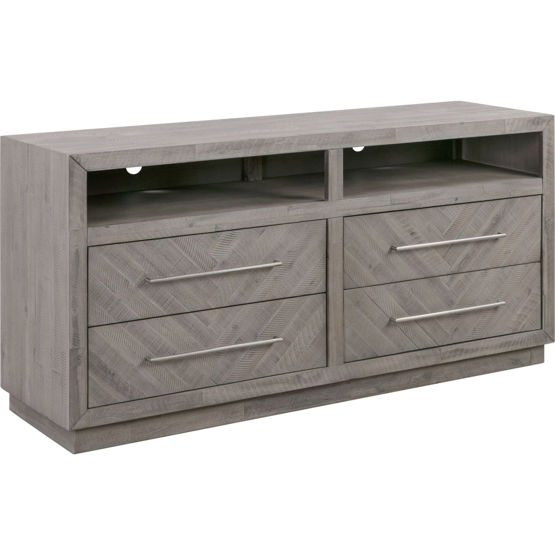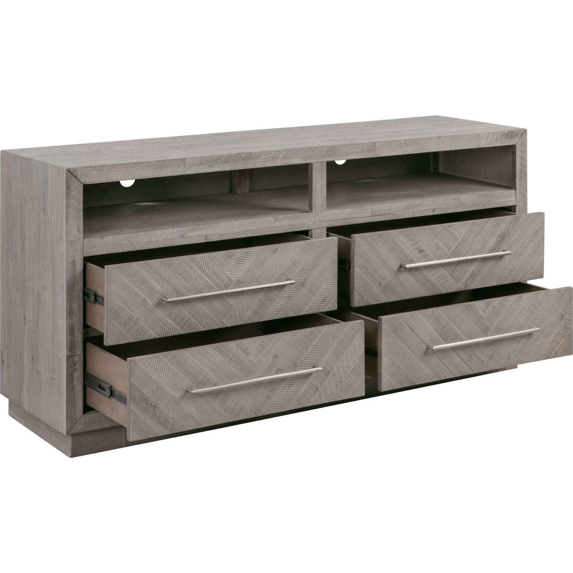 Rustique et contemporain. Le charme de la collection Alexandra réside dans l'acacia brut utilisé pour sa création. Les planches de bois massif sélectionnées à la main sont soigneusement poncées, teintées et blanchies à la chaux pour un effet bois flotté qui accentue le veinage et fait ressortir les nœuds et les marques naturelles du travail. Elles sont ensuite incrustées sur du contreplaqué pour créer un élégant motif à chevrons, et complétées par de fines poignées métalliques pour une touche contemporaine. Cette console multimédia, présentée en finition Rustic Latte, comprend deux compartiments ouverts et quatre tiroirs.