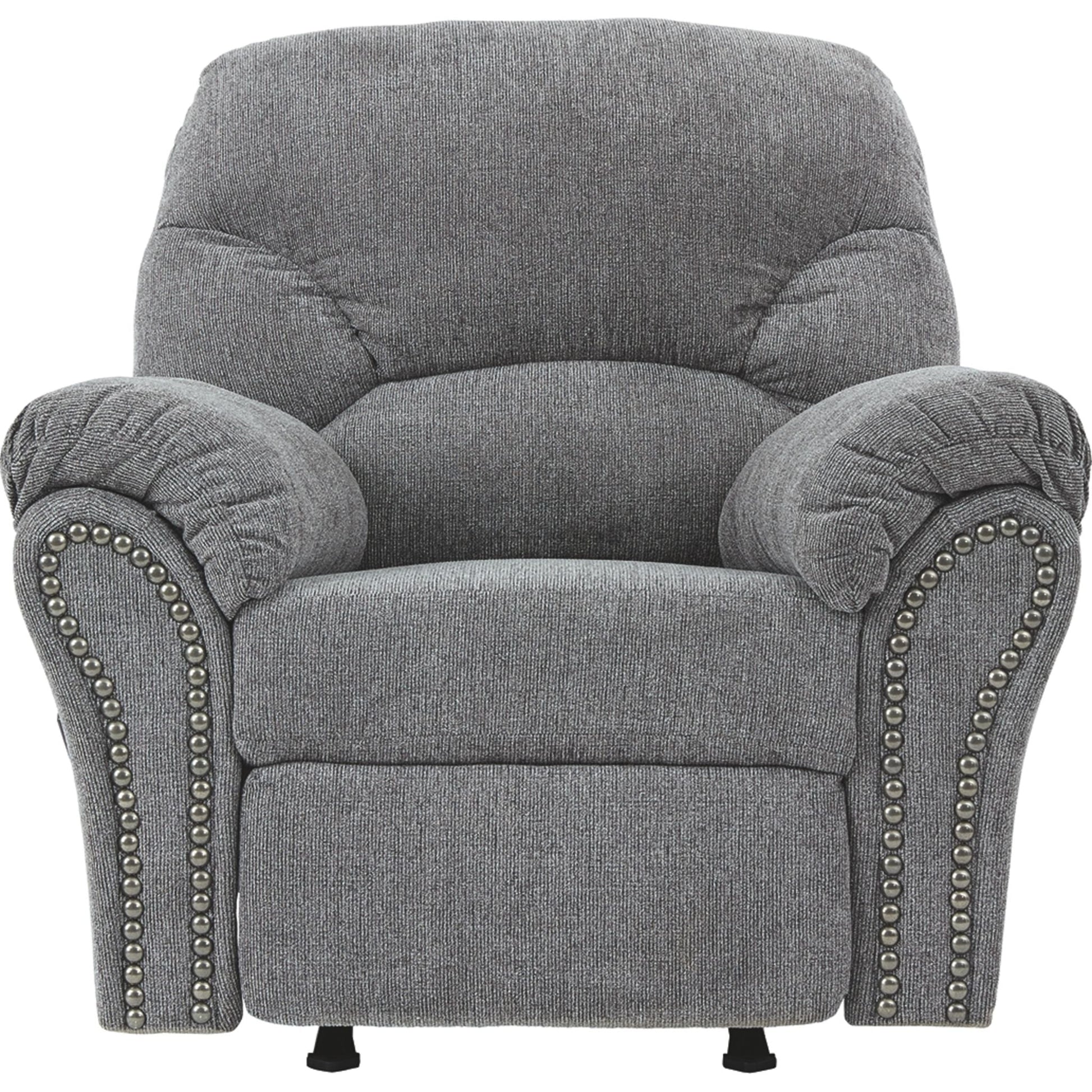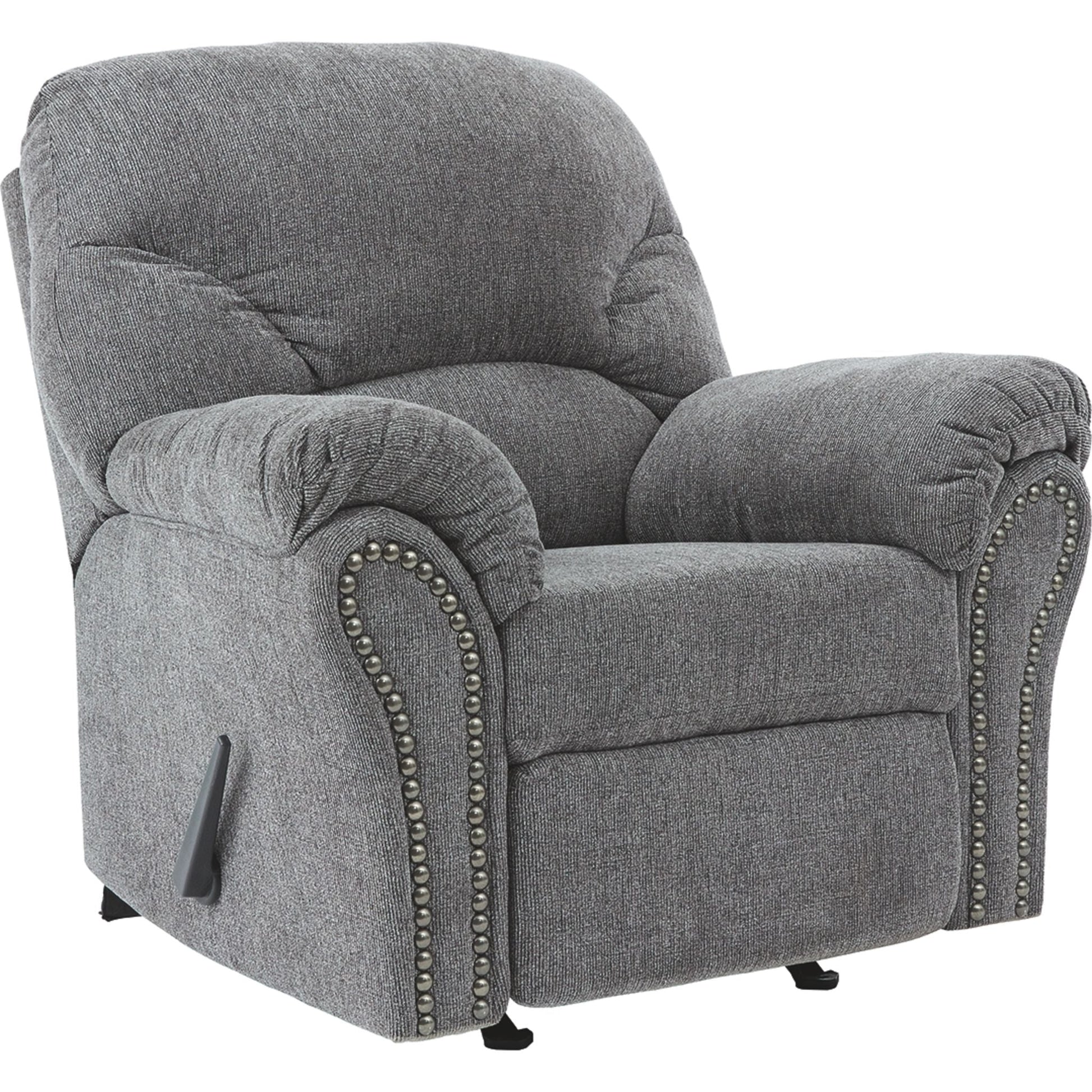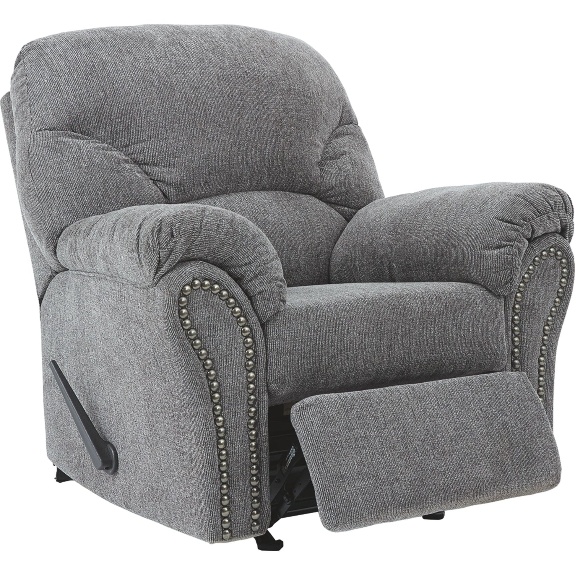 Pourquoi sacrifier le confort au style (ou le style au confort) quand vous pouvez profiter du meilleur des deux avec ce fauteuil inclinable à bascule gris étain. Son élégant dossier divisé et ses accoudoirs gainés de coussins vous permettront de vous endormir en toute simplicité. Les accoudoirs élégamment évasés sont mis en valeur par une finition cloutée en nickel noir qui leur confère une touche de caractère.