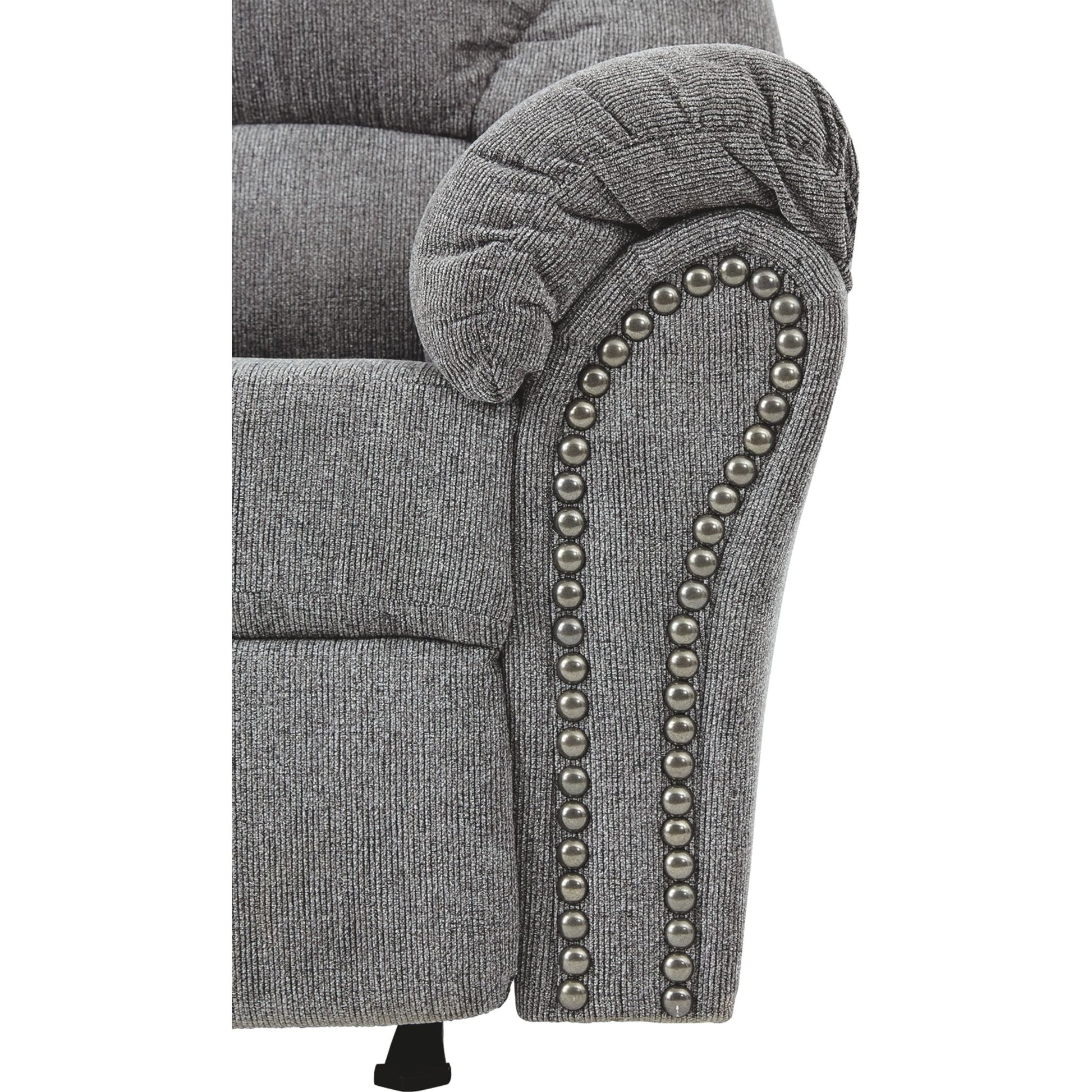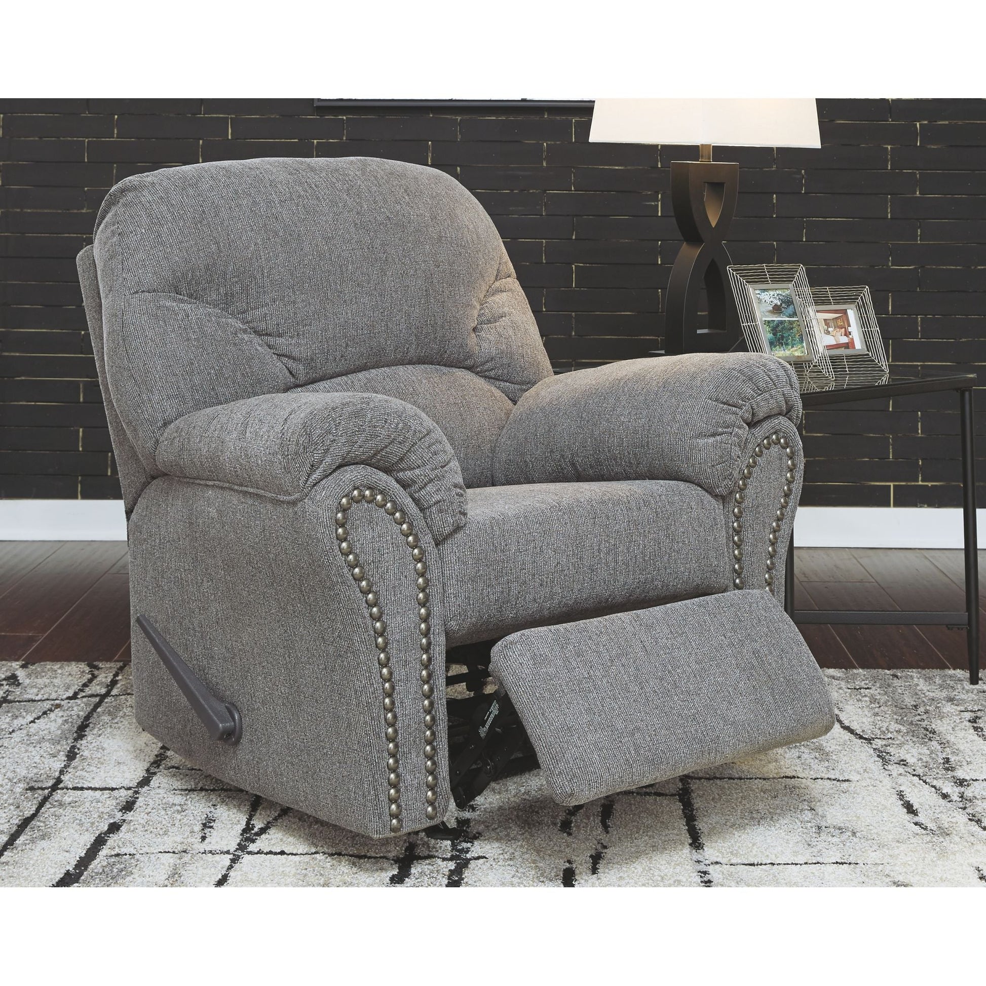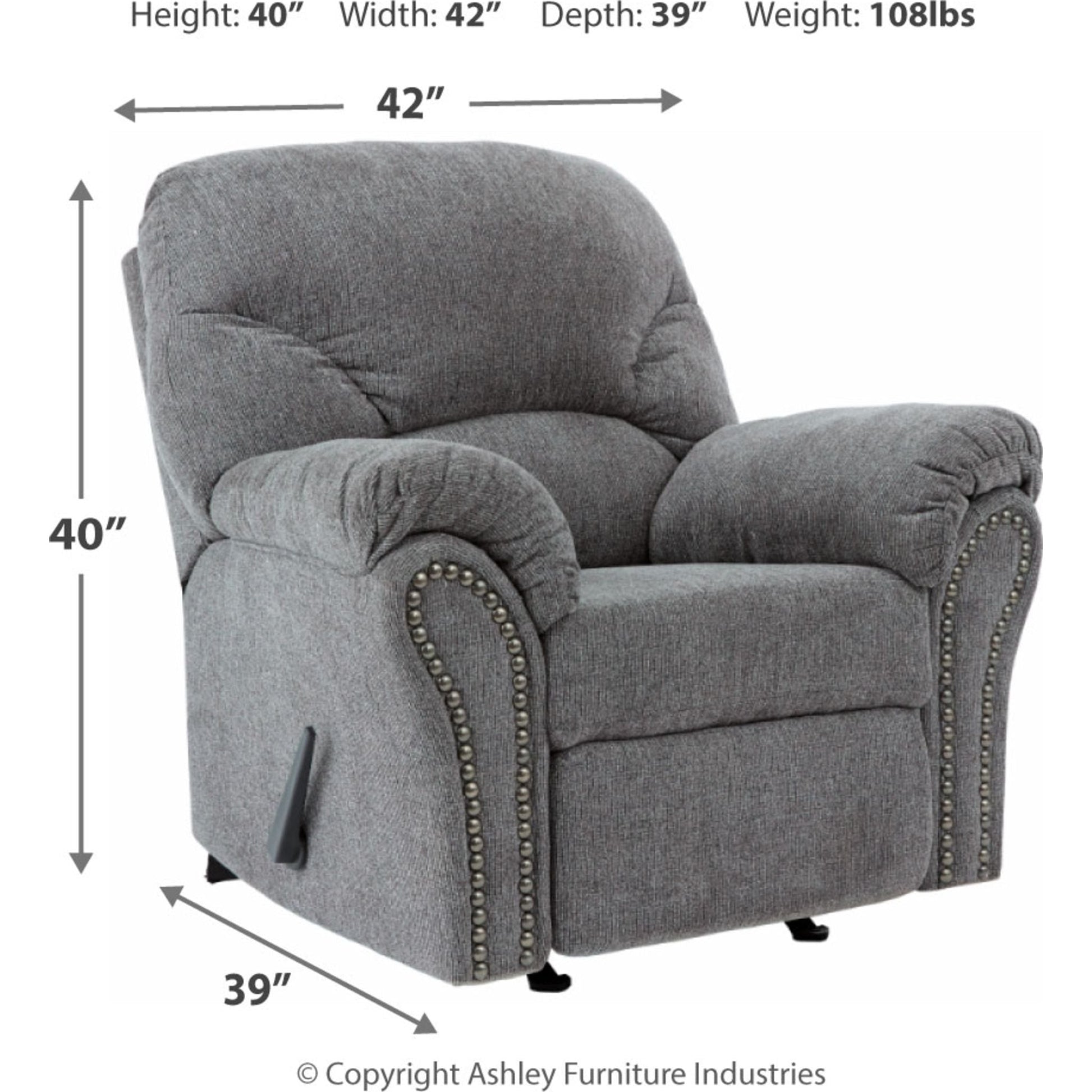 Pourquoi sacrifier le confort au style (ou le style au confort) quand vous pouvez profiter du meilleur des deux avec ce fauteuil inclinable à bascule gris étain. Son élégant dossier divisé et ses accoudoirs gainés de coussins vous permettront de vous endormir en toute simplicité. Les accoudoirs élégamment évasés sont mis en valeur par une finition cloutée en nickel noir qui leur confère une touche de caractère.