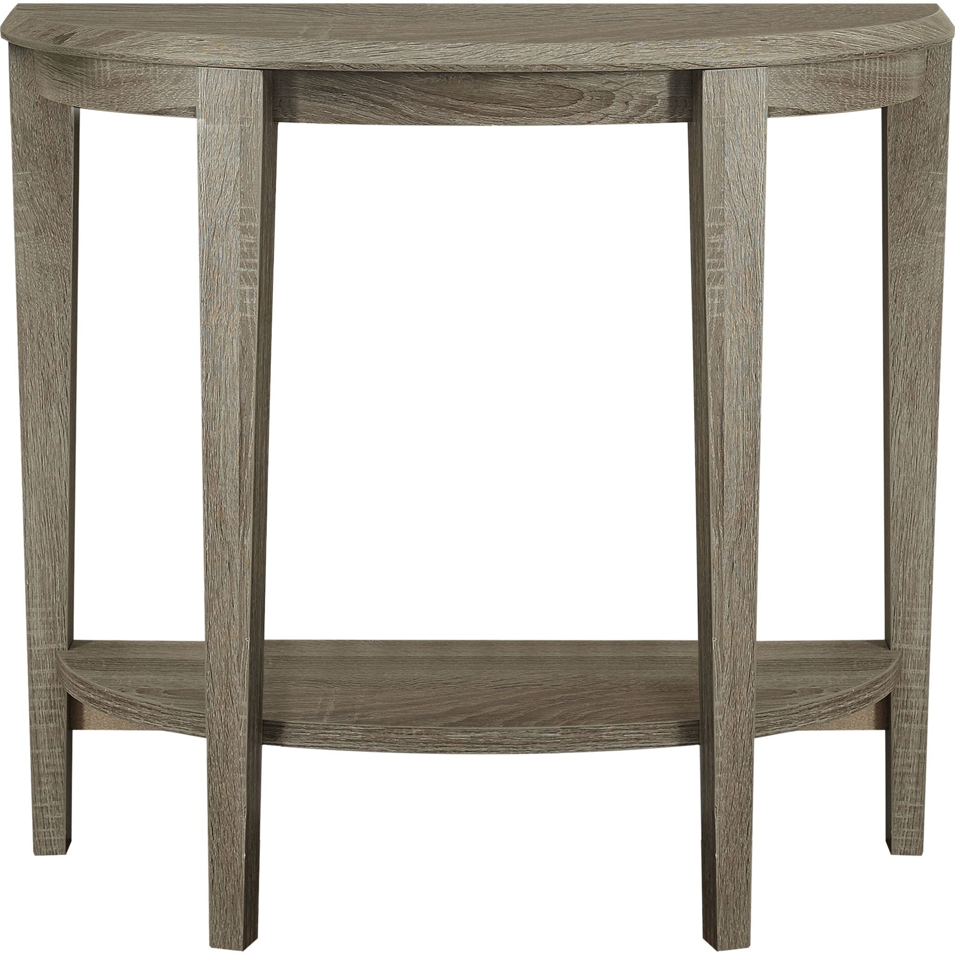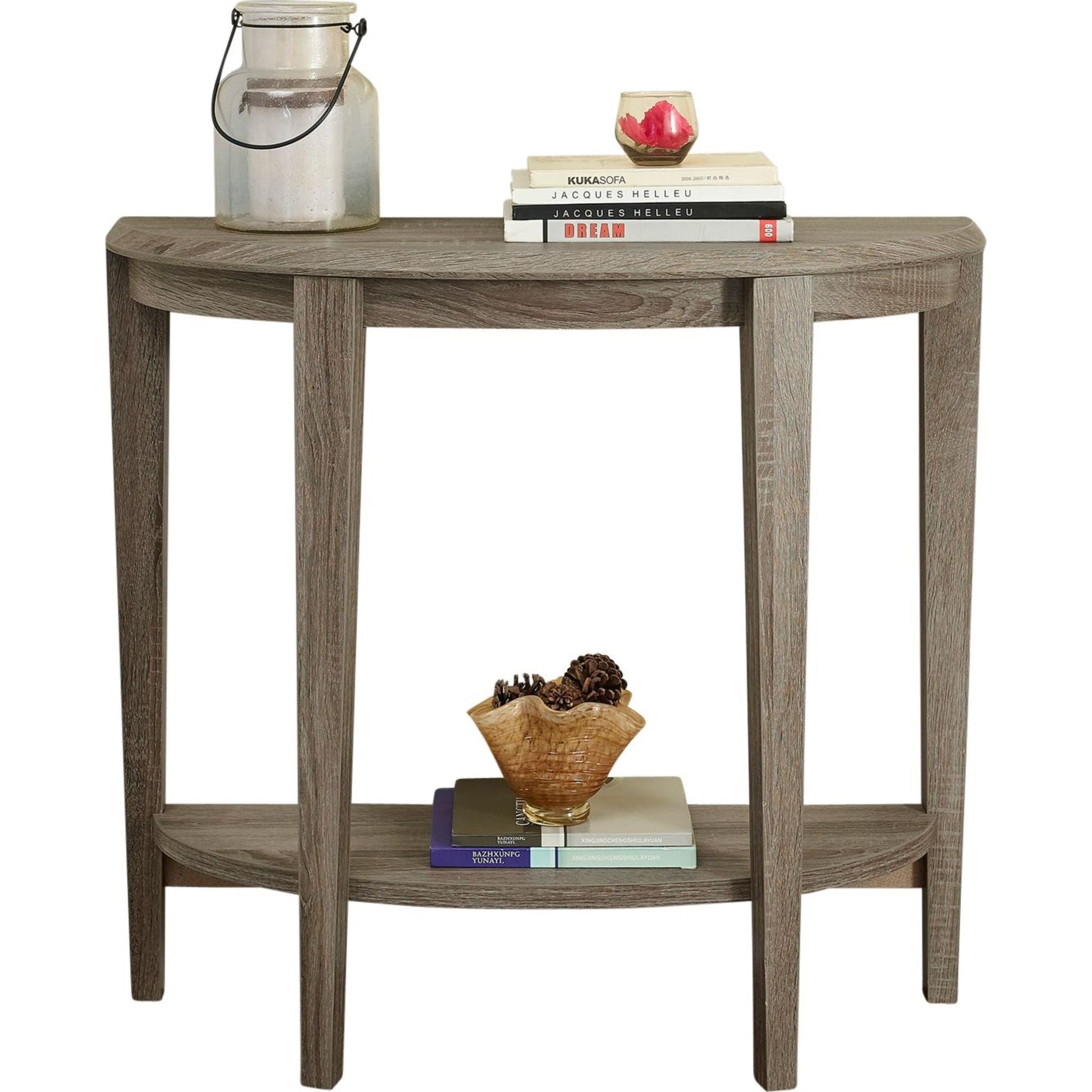 Cette console à deux niveaux en demi-lune s'intègrera parfaitement à tous les espaces avec raffinement. Avec sa forme semi-circulaire qui s'intègre parfaitement au mur et sa tablette inférieure offrant un second espace de rangement, cette table d'appoint optimise l'espace d'exposition disponible dans un salon ou dans des pièces étroites comme un couloir ou une entrée. Sa façade incurvée offre une alternative élégante aux consoles rectangulaires. Cette version contemporaine du design classique en demi-lune allie des détails élégants, comme un plateau et une ceinture biseautés, à une construction robuste avec une finition imitation bois taupe foncé.