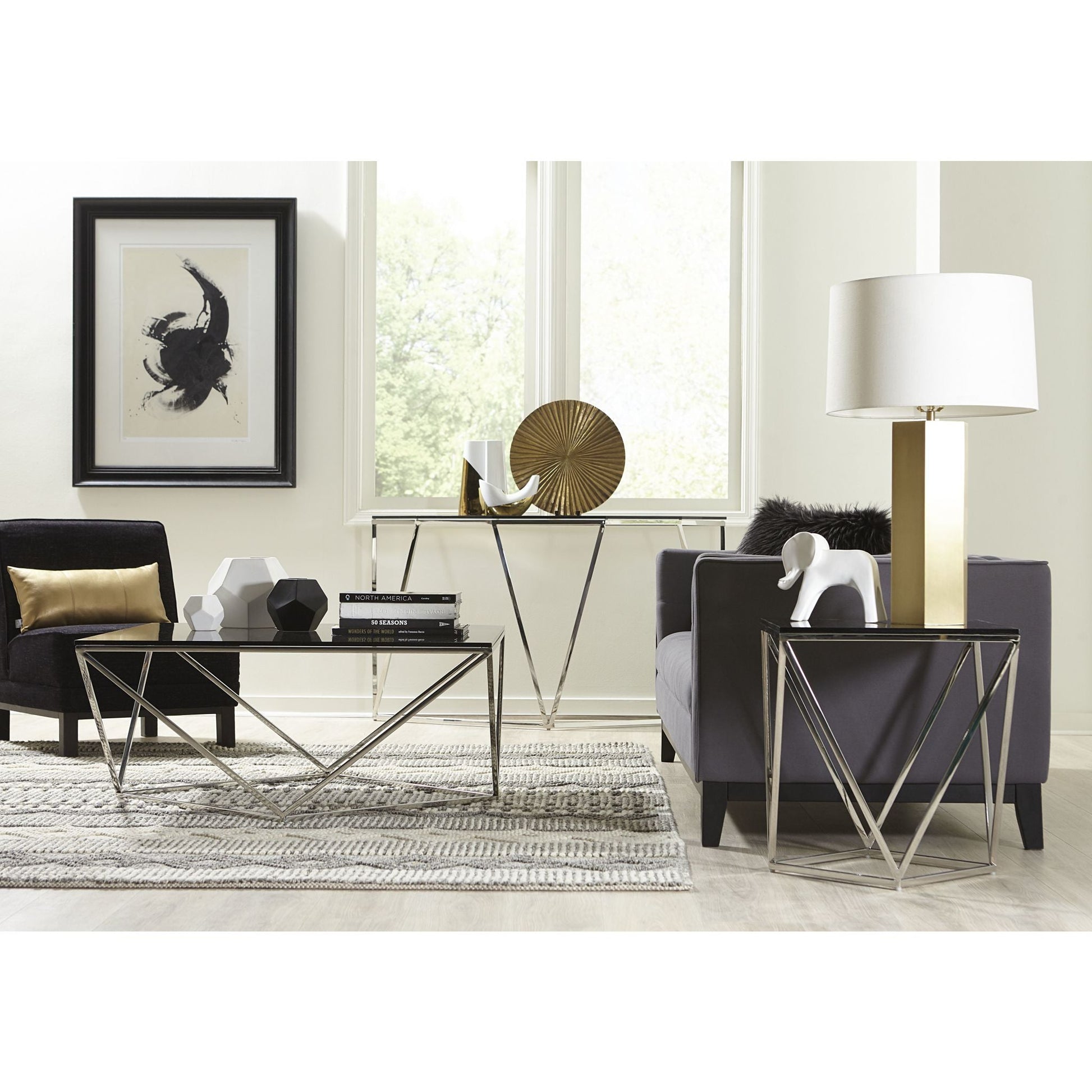 Modernisez votre espace avec la collection Aria de Modus Furniture. Les carrés décalés de cette collection se rejoignent aux angles pour former un agencement géométrique simple mais saisissant. La formation facettée est rehaussée d'acier inoxydable poli et de verre fumé pour une esthétique résolument moderne et glamour.