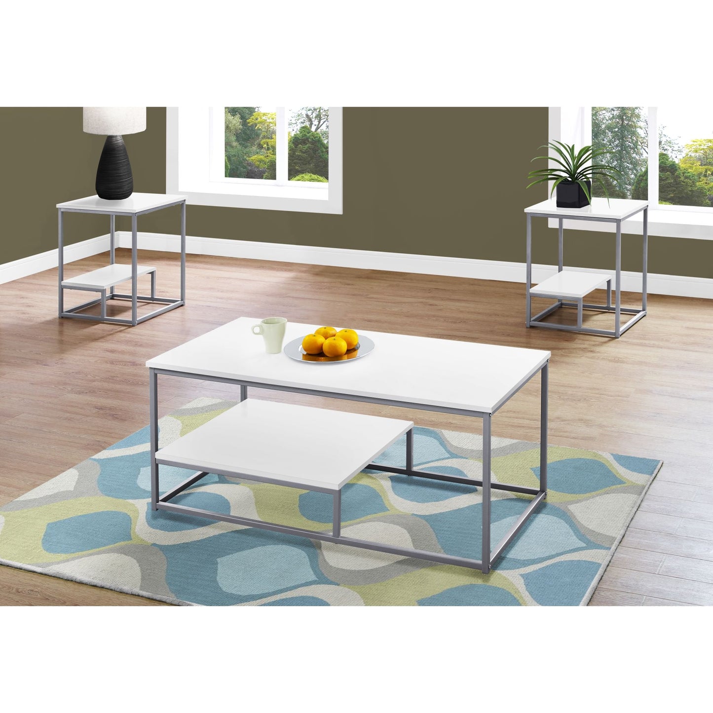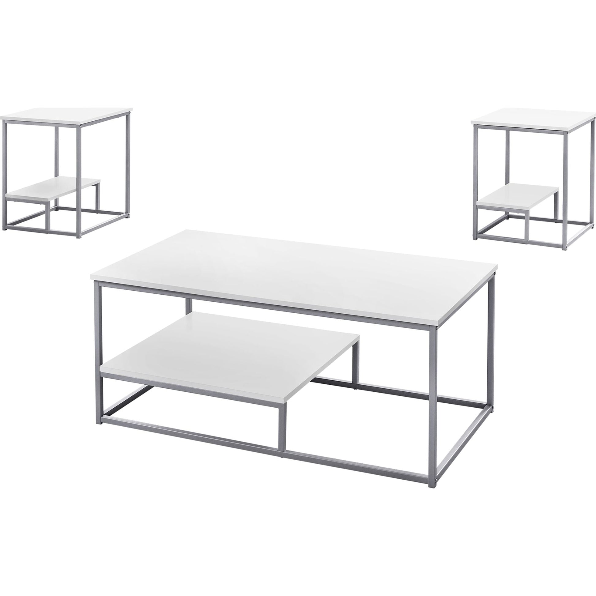 Apportez une touche de modernité à votre espace de vie avec cet ensemble unique de 3 tables basses. Leur design contemporain épuré, leur finition blanche élégante et leurs finitions en métal argenté offrent un plateau spacieux et une demi-étagère inférieure surélevée pour un rangement et une présentation supplémentaires. Les tables d'appoint assorties sont idéales pour poser une lampe, des tableaux ou d'autres objets décoratifs, tandis que la table basse deviendra un élément central de votre salon, bureau ou salle familiale.