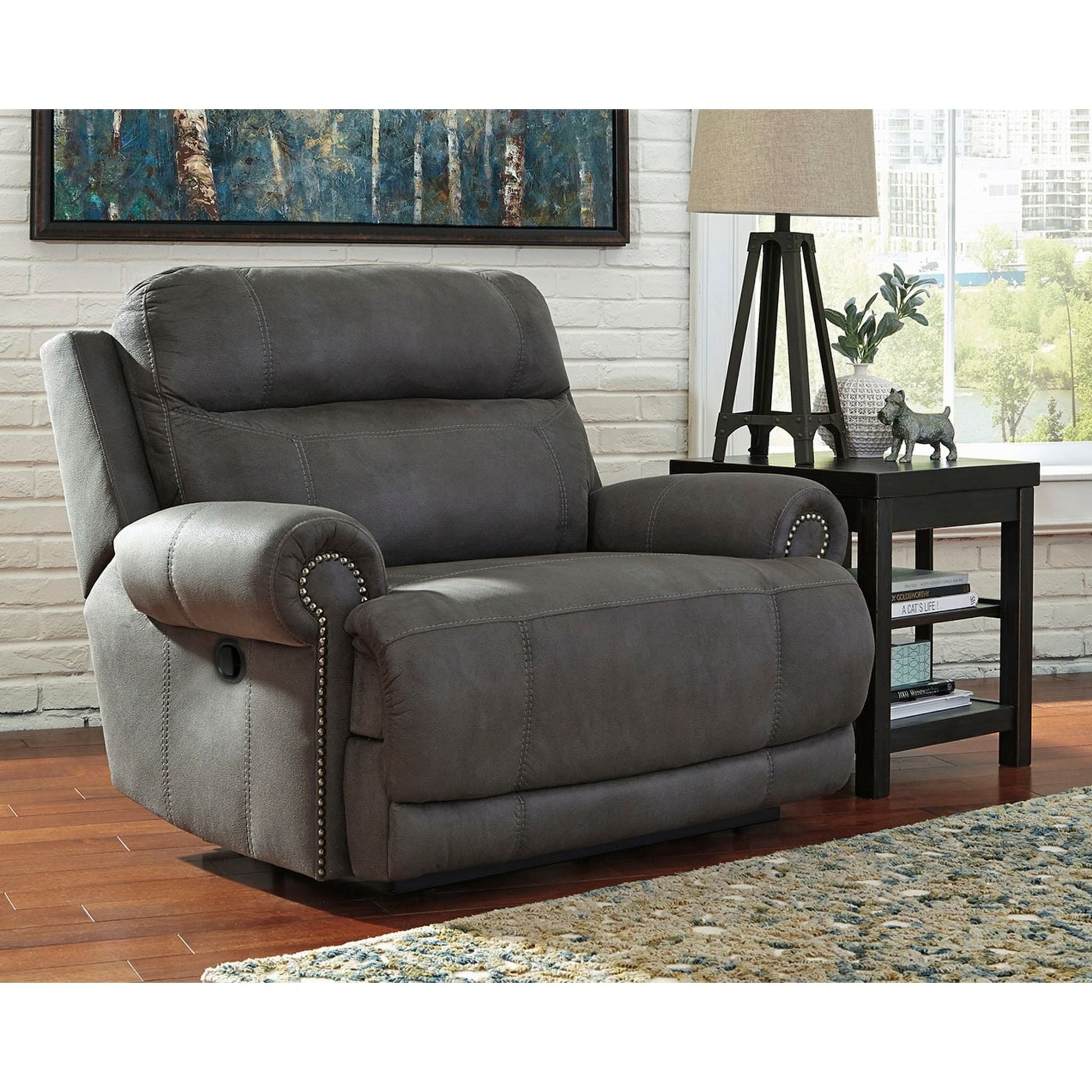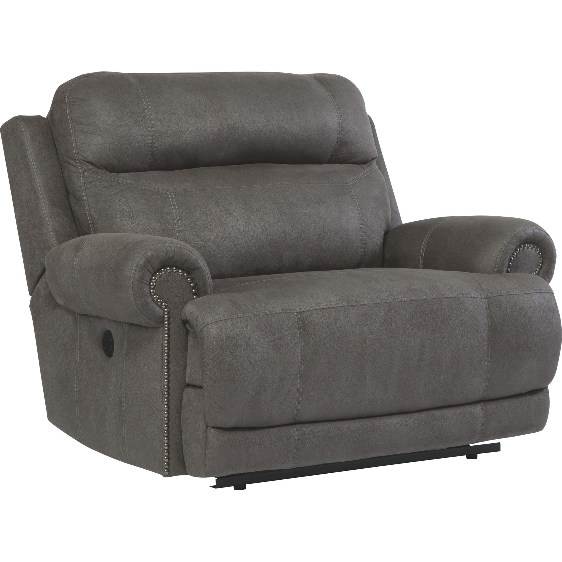 Tout en minimisant l'encombrement et en évitant l'aspect « gonflé » que l'on pourrait attendre d'un fauteuil inclinable, ce fauteuil inclinable sans cloison ne lésine pas sur le style contemporain. Des touches subtiles, comme des surpiqûres géantes sportives, une bordure cloutée et un effet « vieilli » sur le revêtement, confèrent à ce beau meuble un charme soigné et une sensation de fraîcheur.