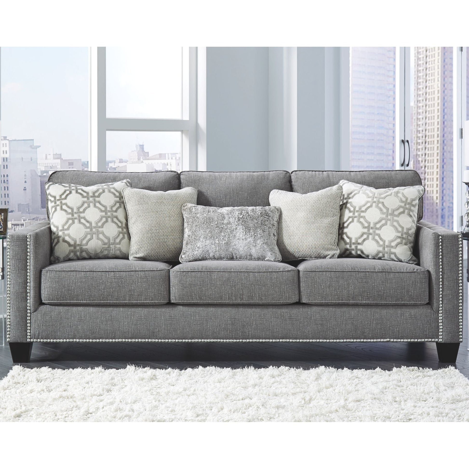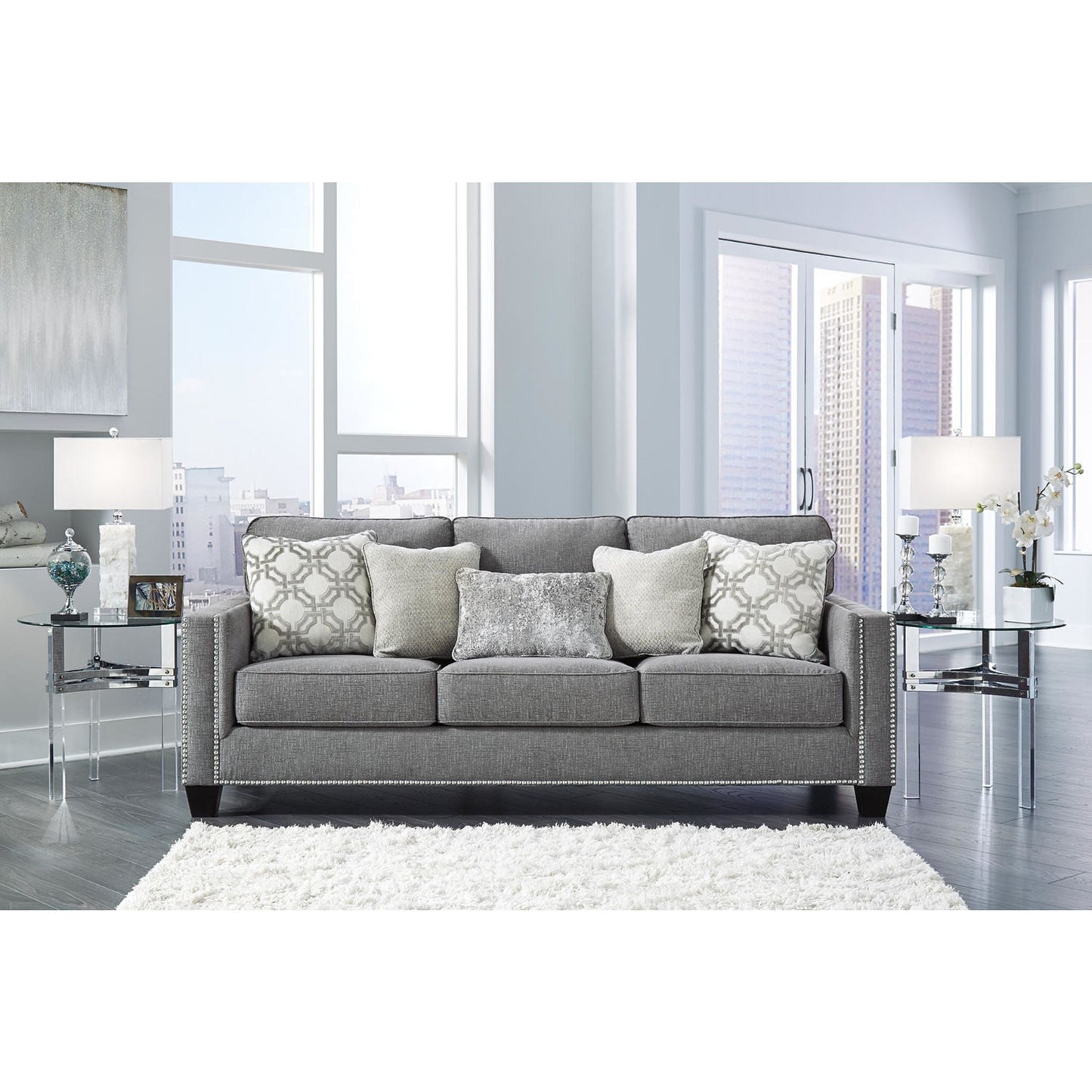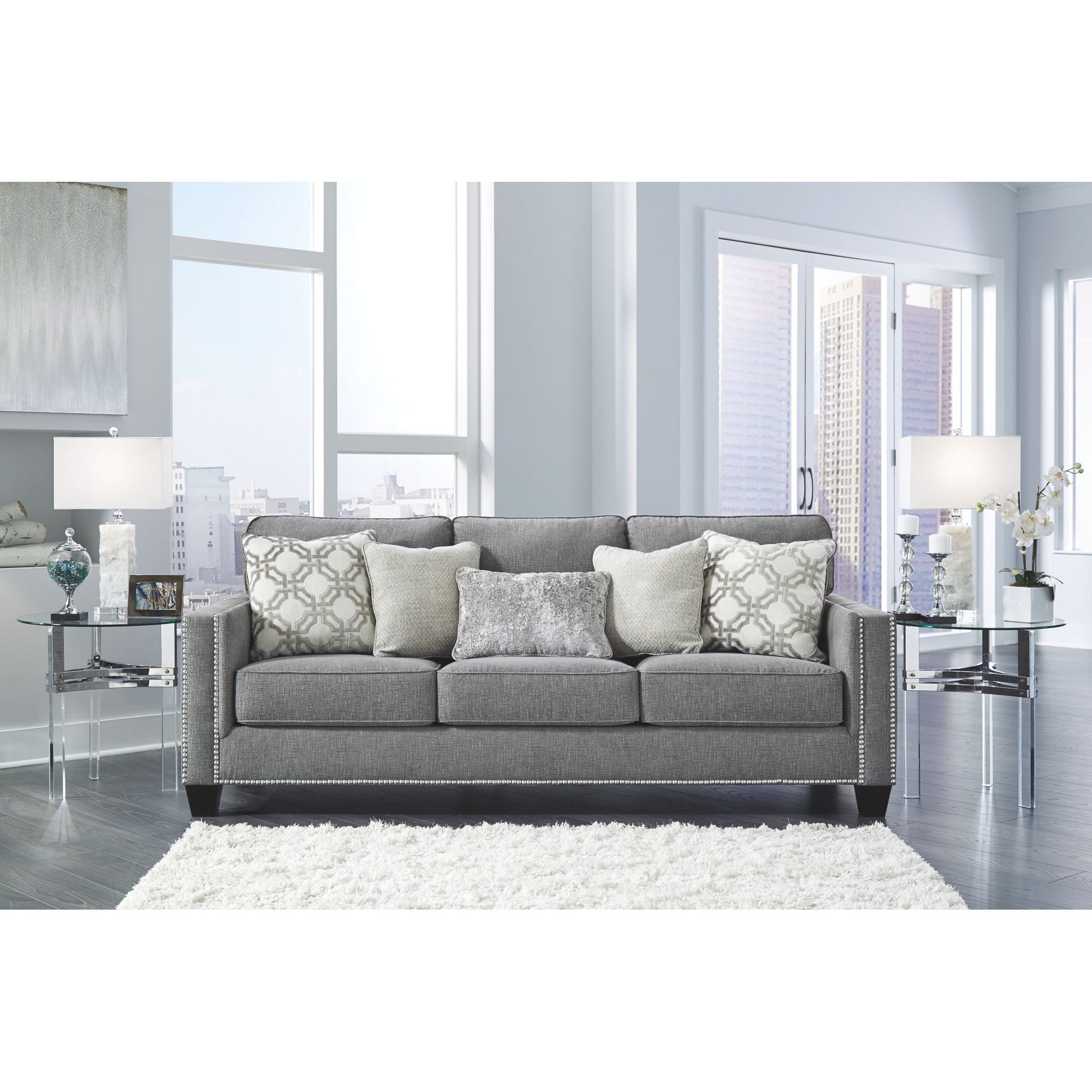 La première impression est primordiale, et ce canapé place la barre très haut. Son tissu chenille gris attire tous les regards par son moelleux, tout simplement fabuleux de haut en bas. Ses lignes épurées évoquent une esthétique rafraîchissante, accentuée par une bordure cloutée couleur nickel pour un effet saisissant. Des coussins aux motifs abstraits contemporains et un coussin rognon en velours écrasé apportent des textures délicieuses. Ce canapé est une ode saisissante à la mode.