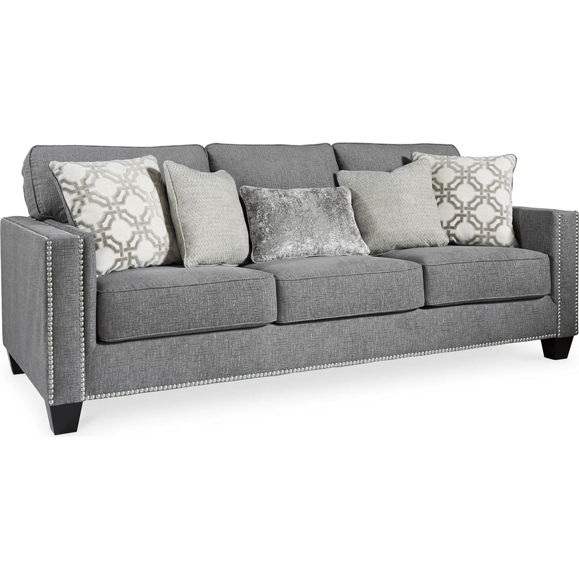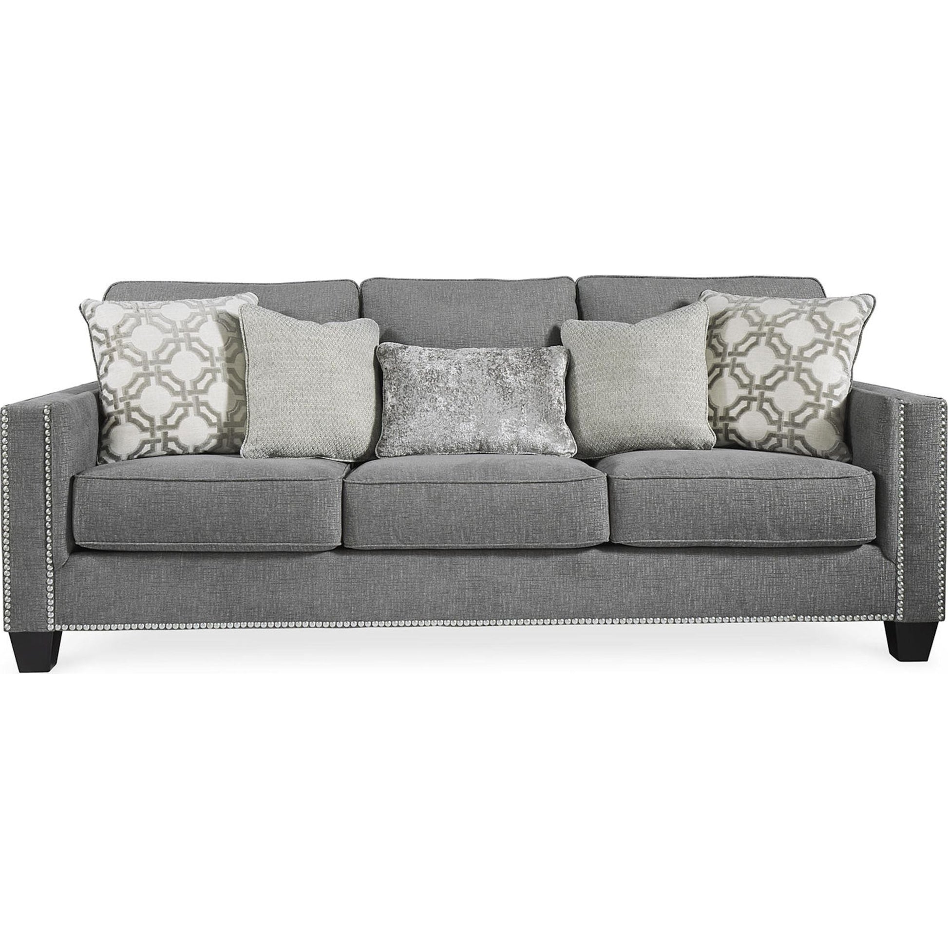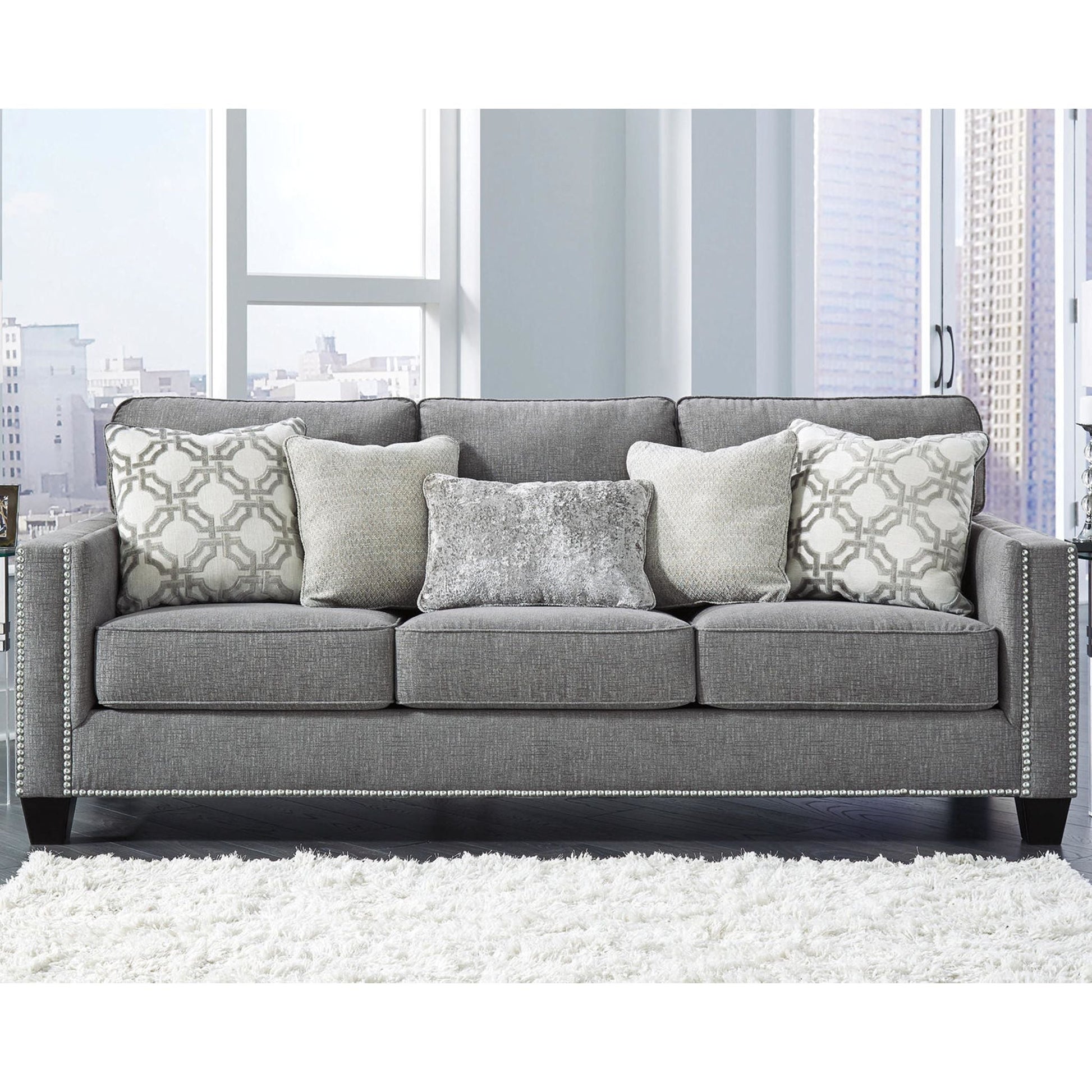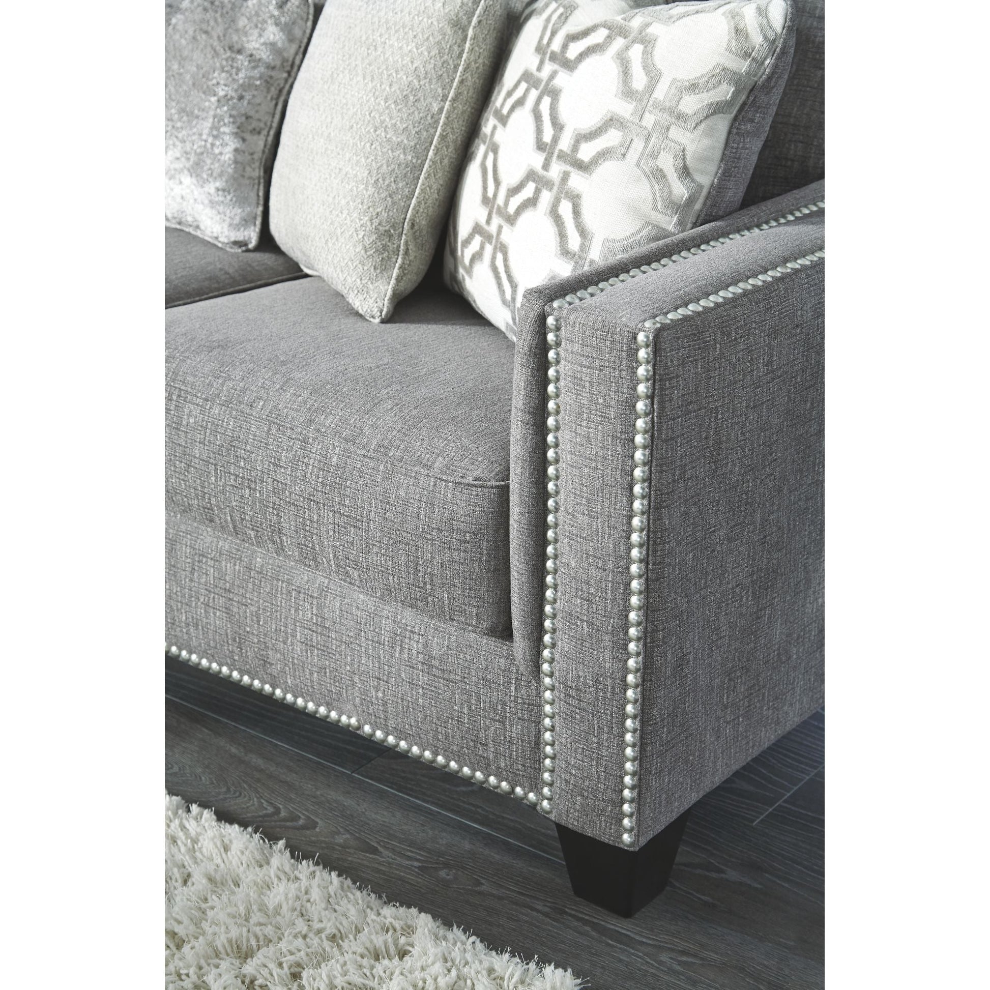 La première impression est primordiale, et ce canapé place la barre très haut. Son tissu chenille gris attire tous les regards par son moelleux, tout simplement fabuleux de haut en bas. Ses lignes épurées évoquent une esthétique rafraîchissante, accentuée par une bordure cloutée couleur nickel pour un effet saisissant. Des coussins aux motifs abstraits contemporains et un coussin rognon en velours écrasé apportent des textures délicieuses. Ce canapé est une ode saisissante à la mode.