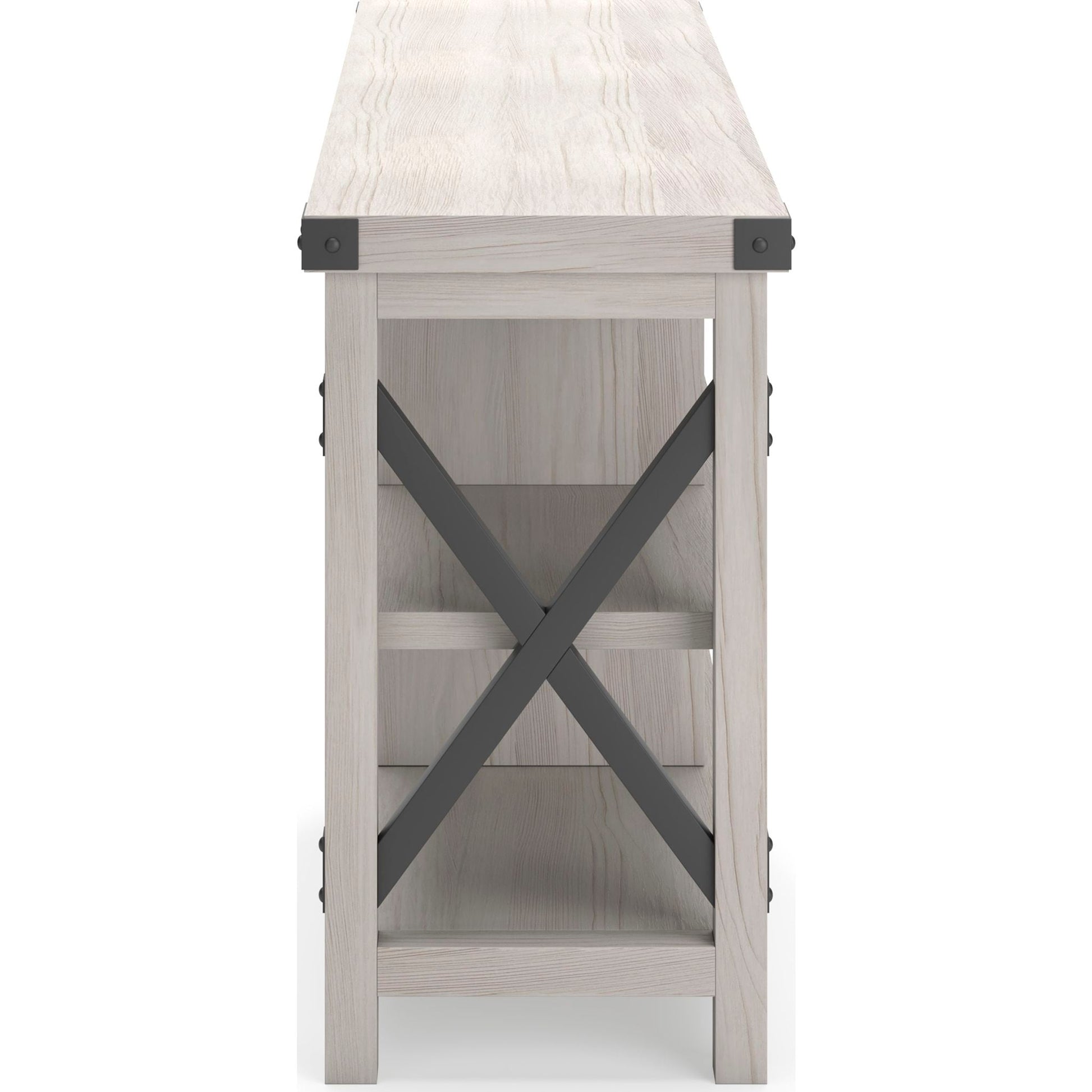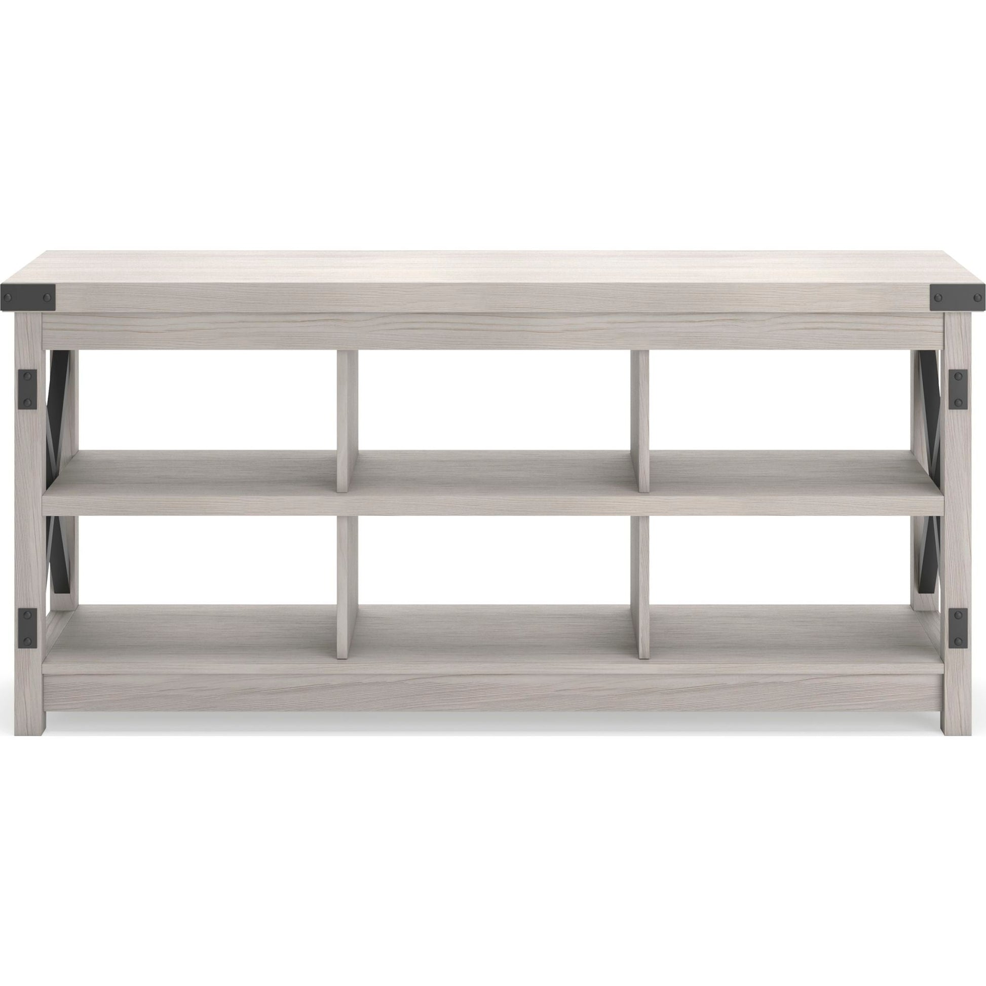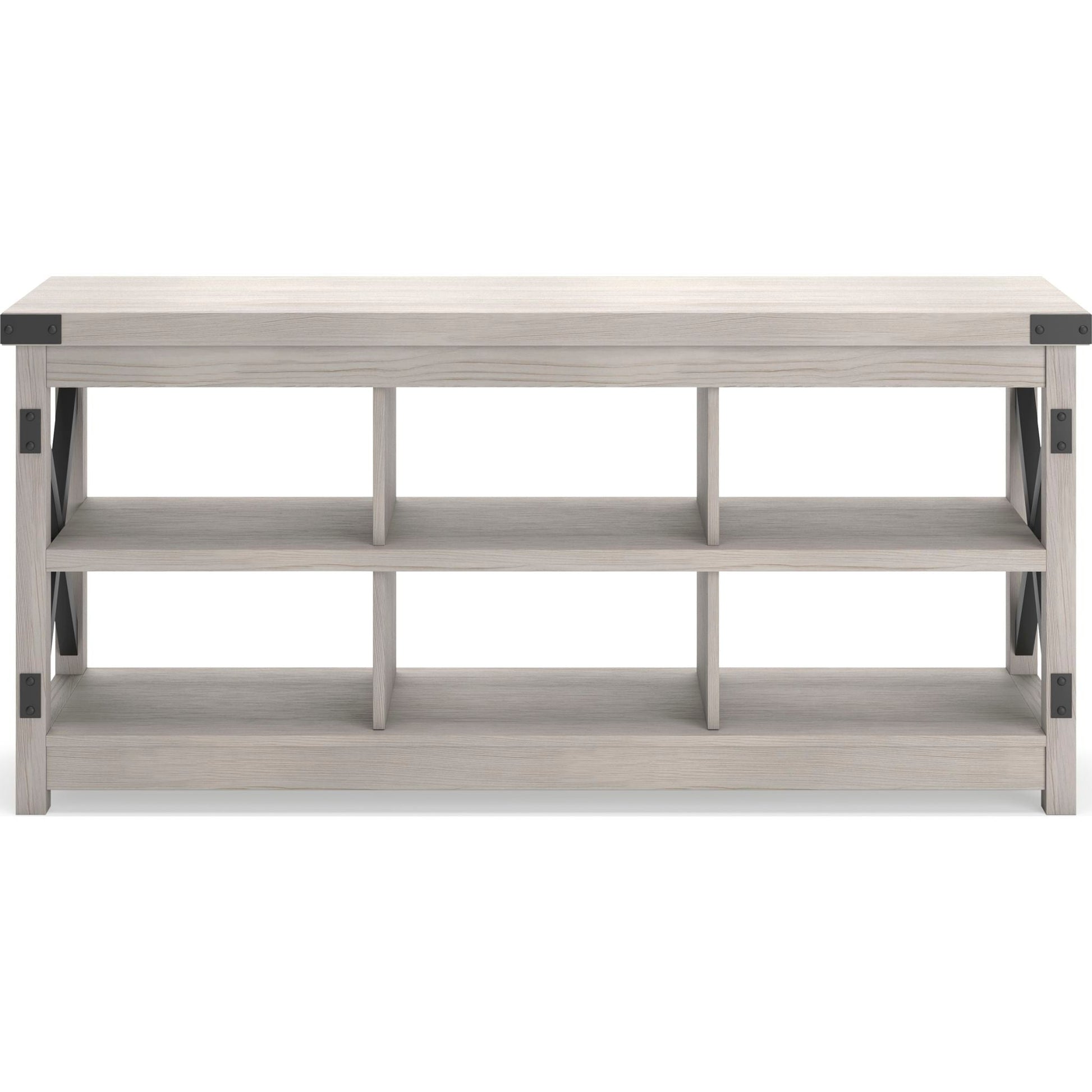 Avec sa finition blanchie à la chaux et ses six espaces de rangement ouverts, ce meuble TV offre un style transitionnel qui s'intègre parfaitement à tous les styles, du chic urbain au style campagnard moderne. Des éléments en croix à chaque extrémité, contrastés par des touches de noir, lui confèrent un charme simple.