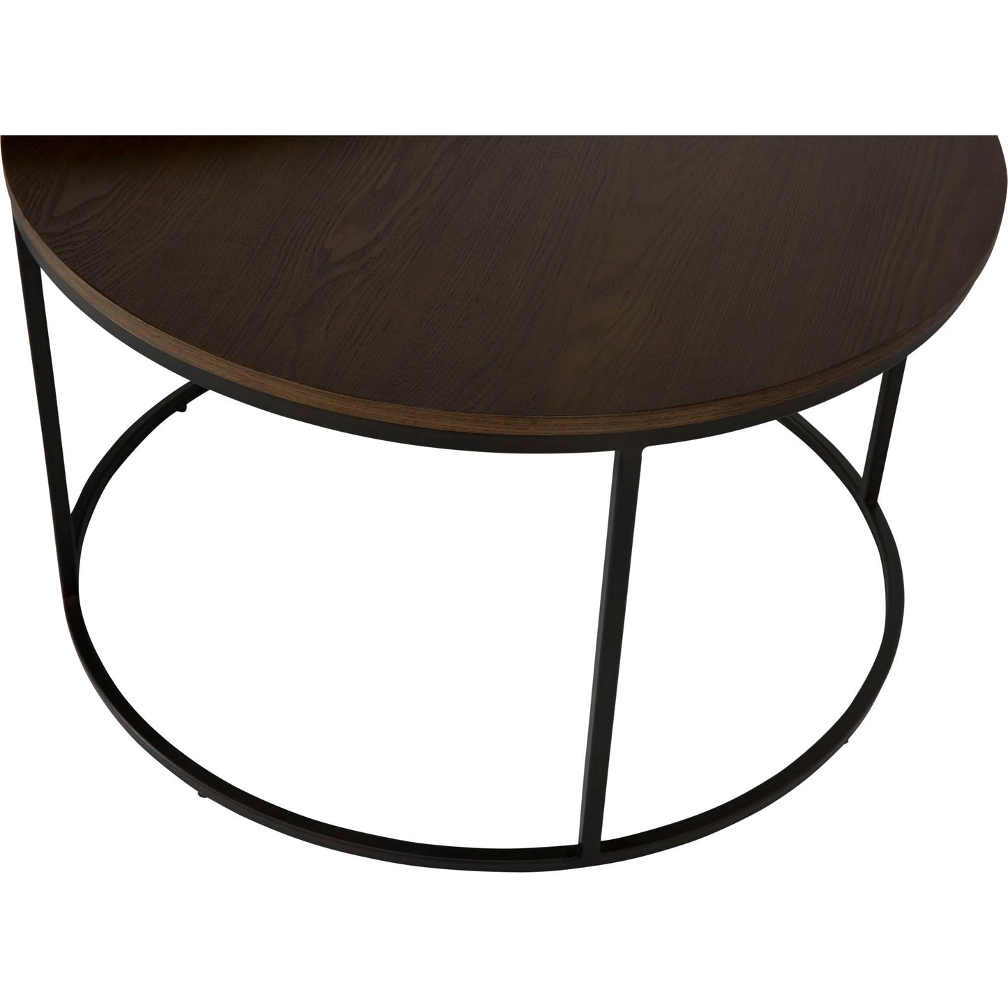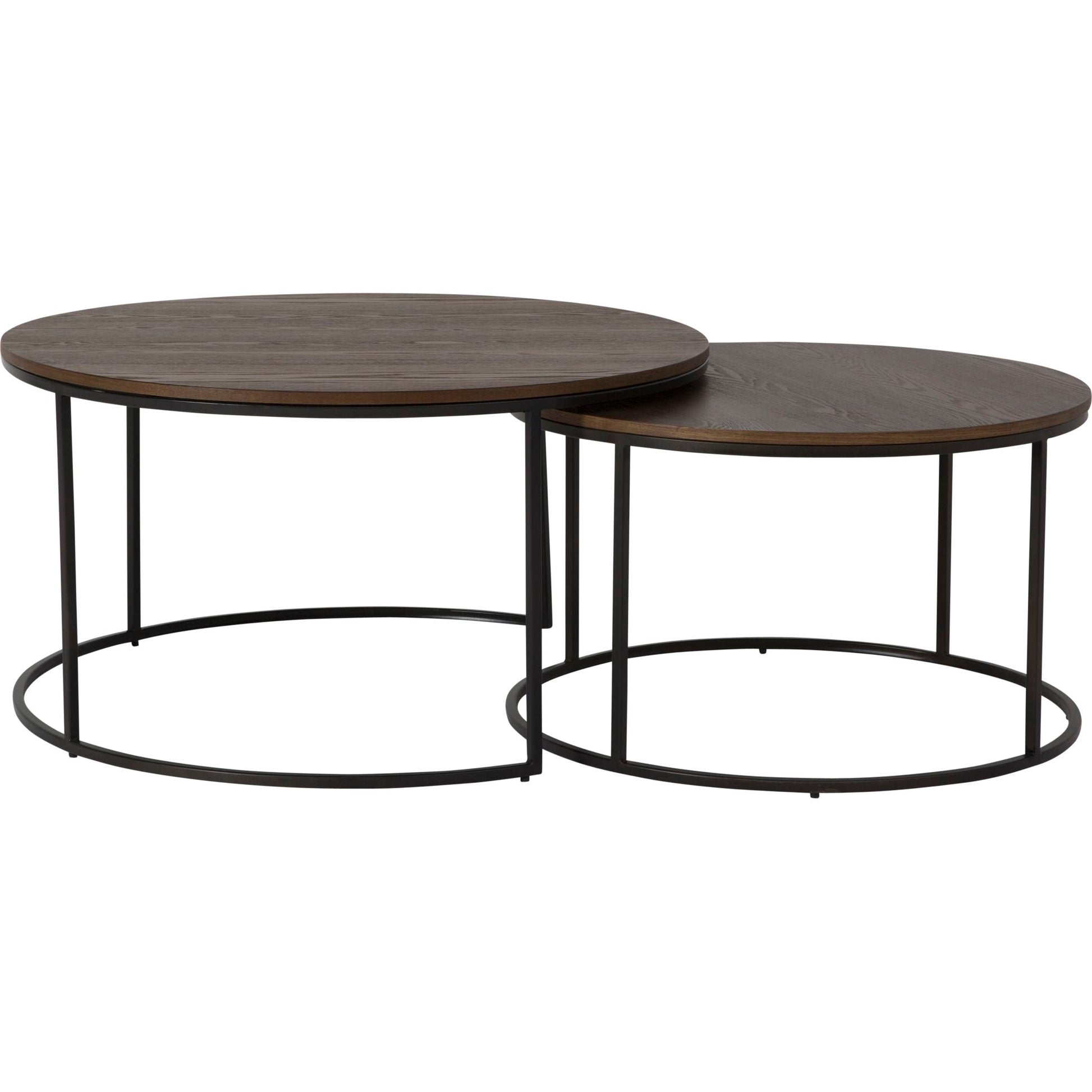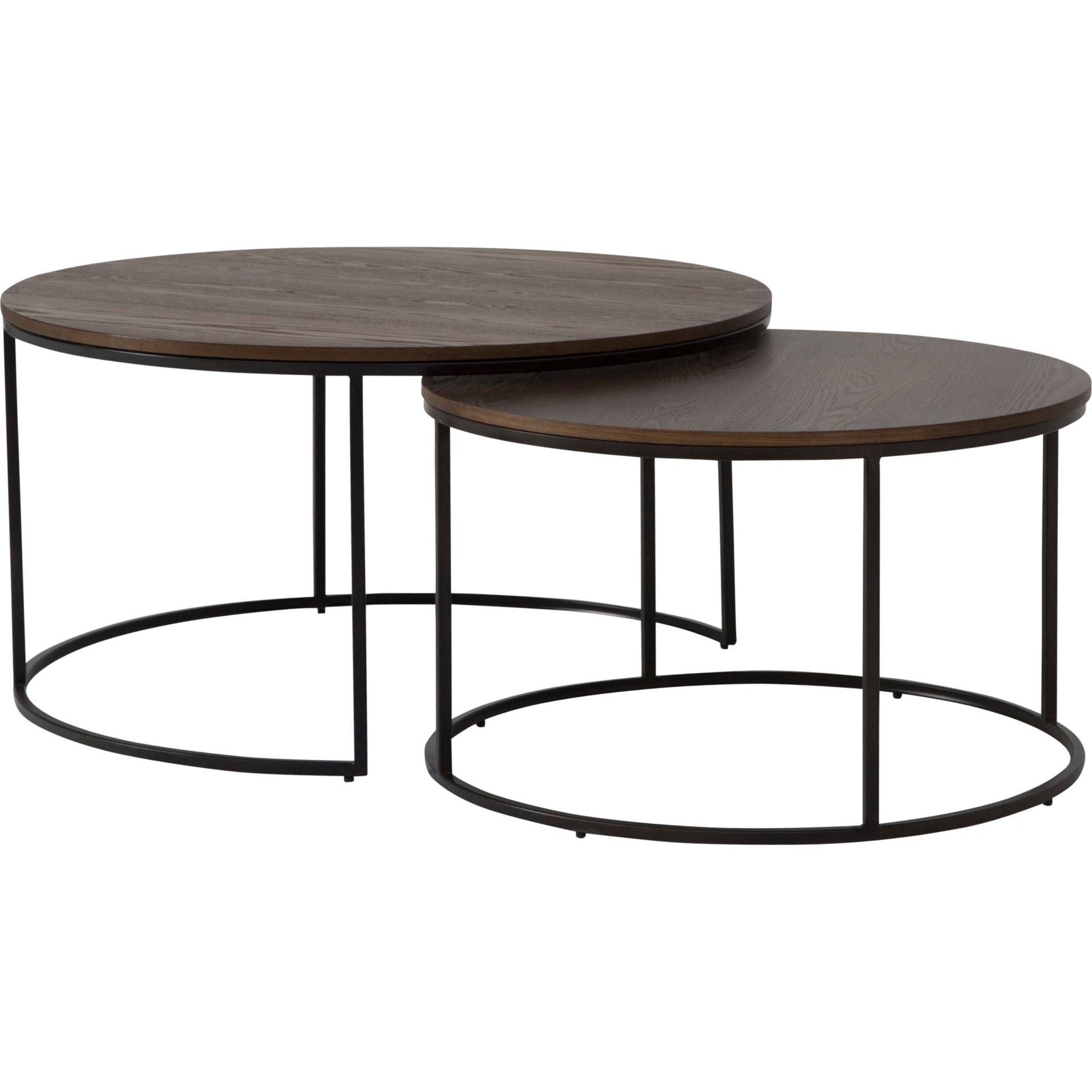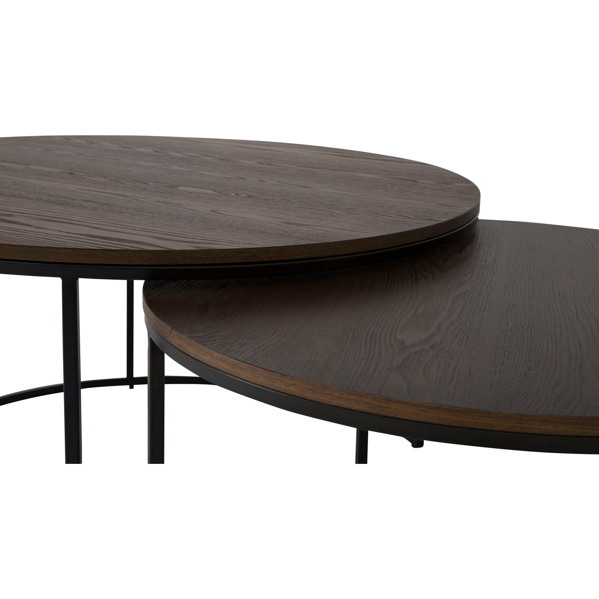 Tables gigognes rondes en bois et métalPlateau en placage de frêne finition naturelle rustiquePiètement en métal finition noire