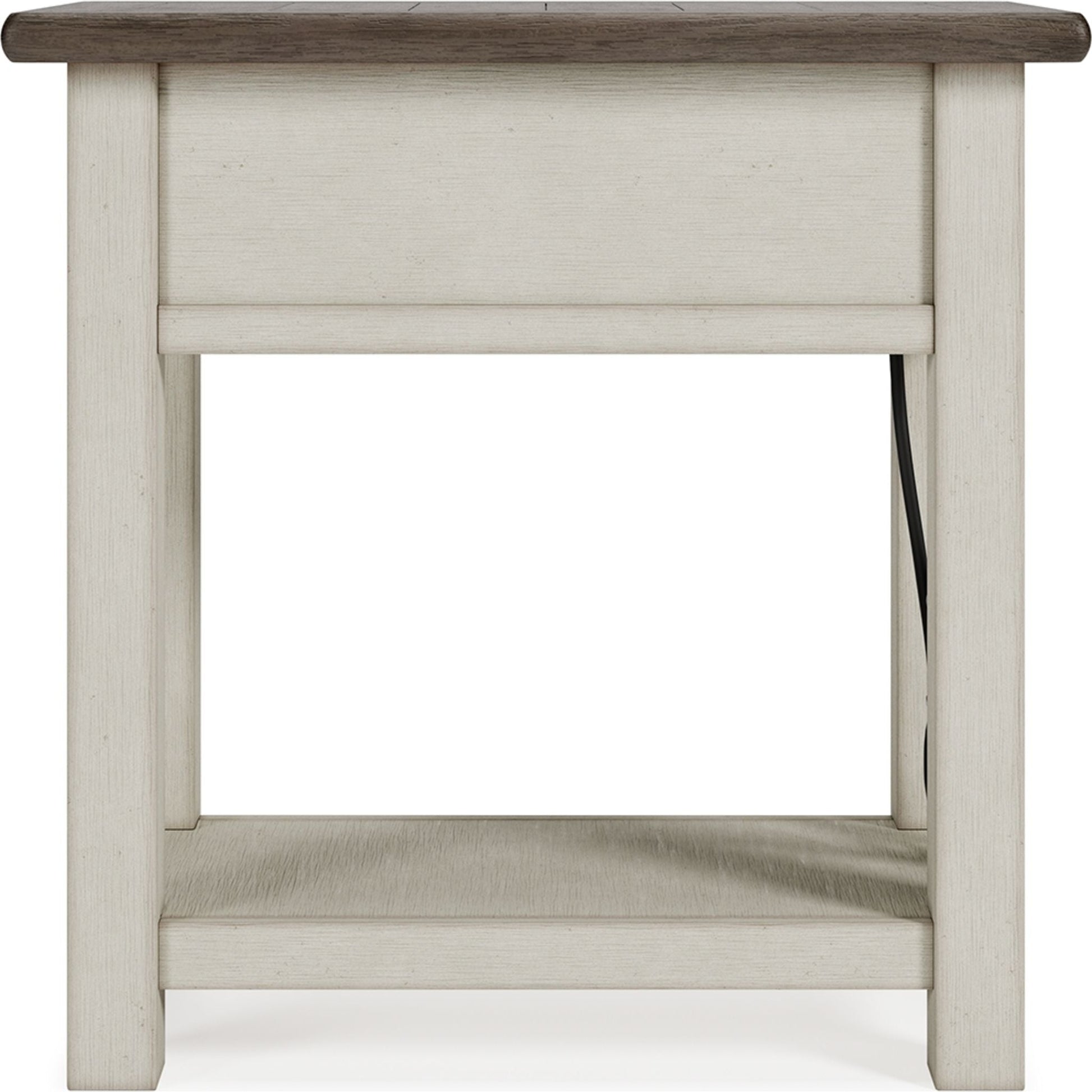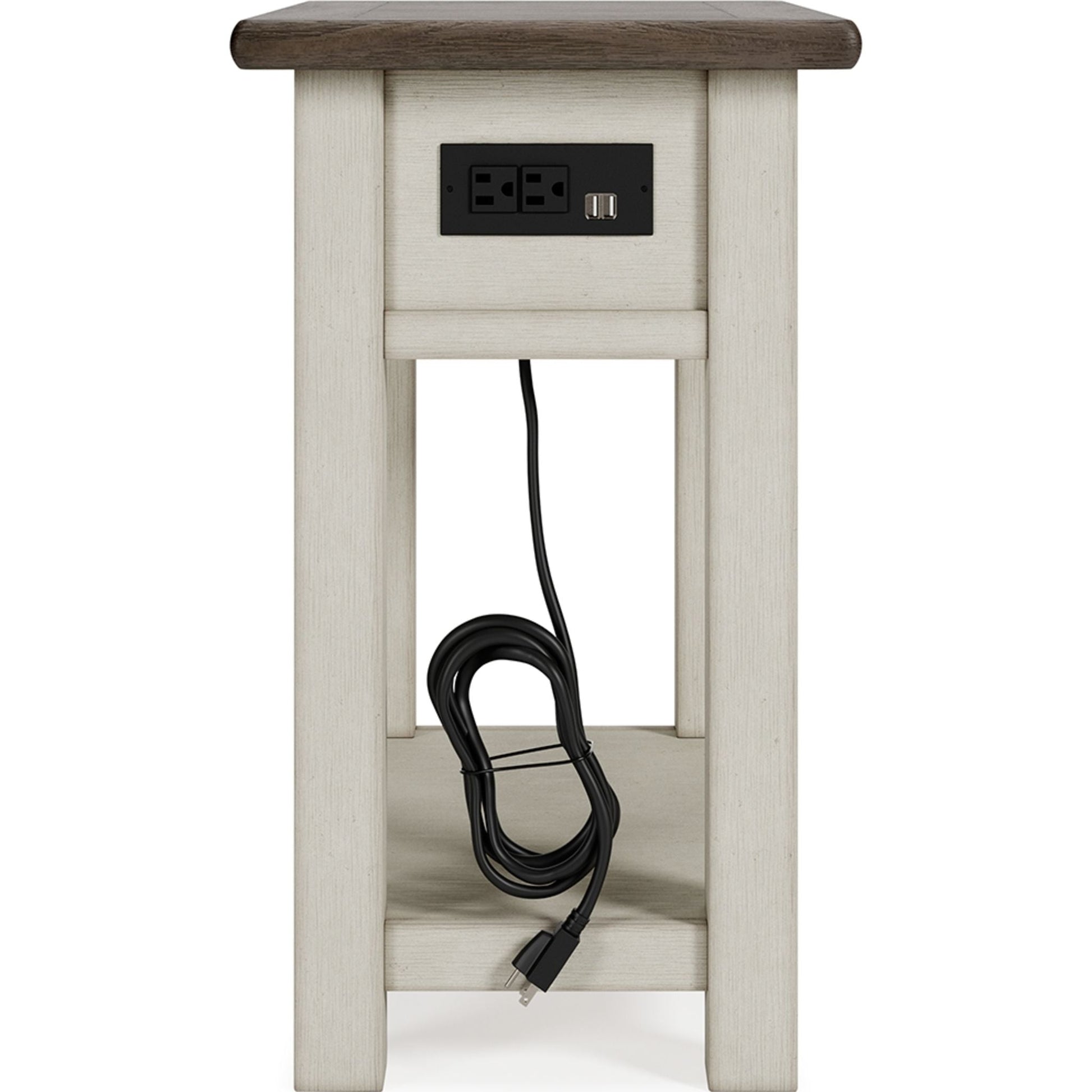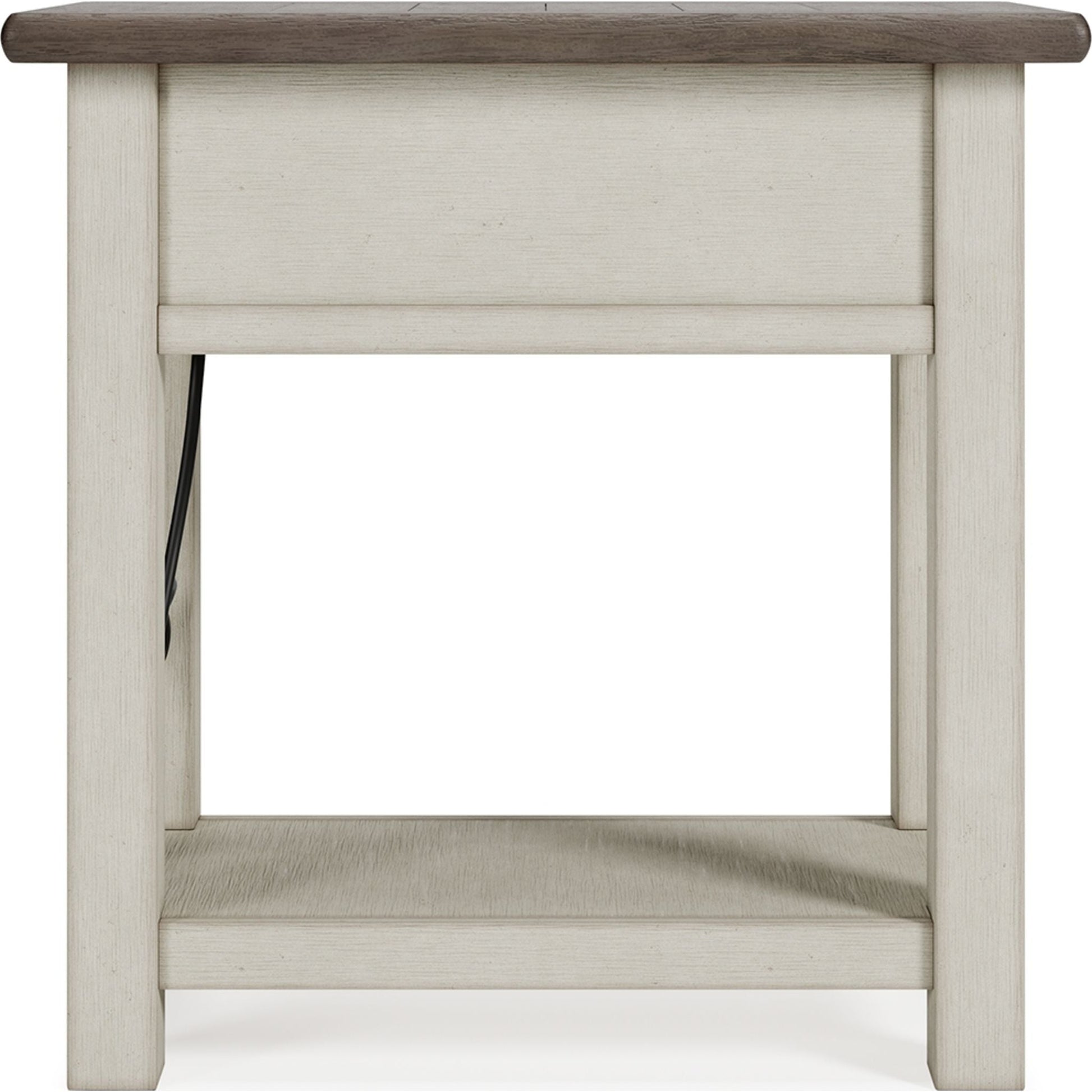 Que votre style soit campagnard, shabby chic ou cottage, cette table d'appoint saura vous impressionner. Sa finition bicolore associe le chêne patiné au blanc antique pour un caractère encore plus authentique. Son plateau à planches et cadre, ses finitions noires à facettes et son tiroir coulissant pour télécommandes et autres accessoires sont des atouts de charme. Son alimentation intégrée avec deux ports USB est idéale pour garder vos appareils à portée de main.