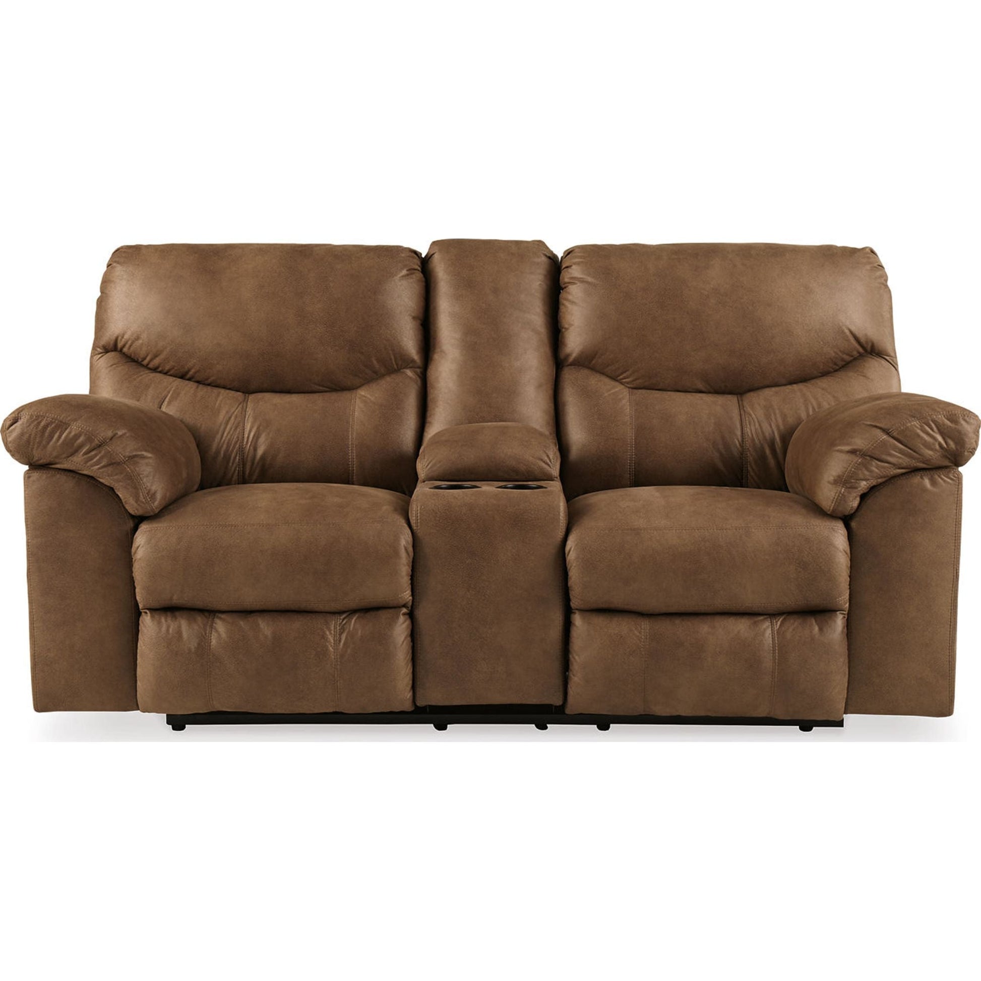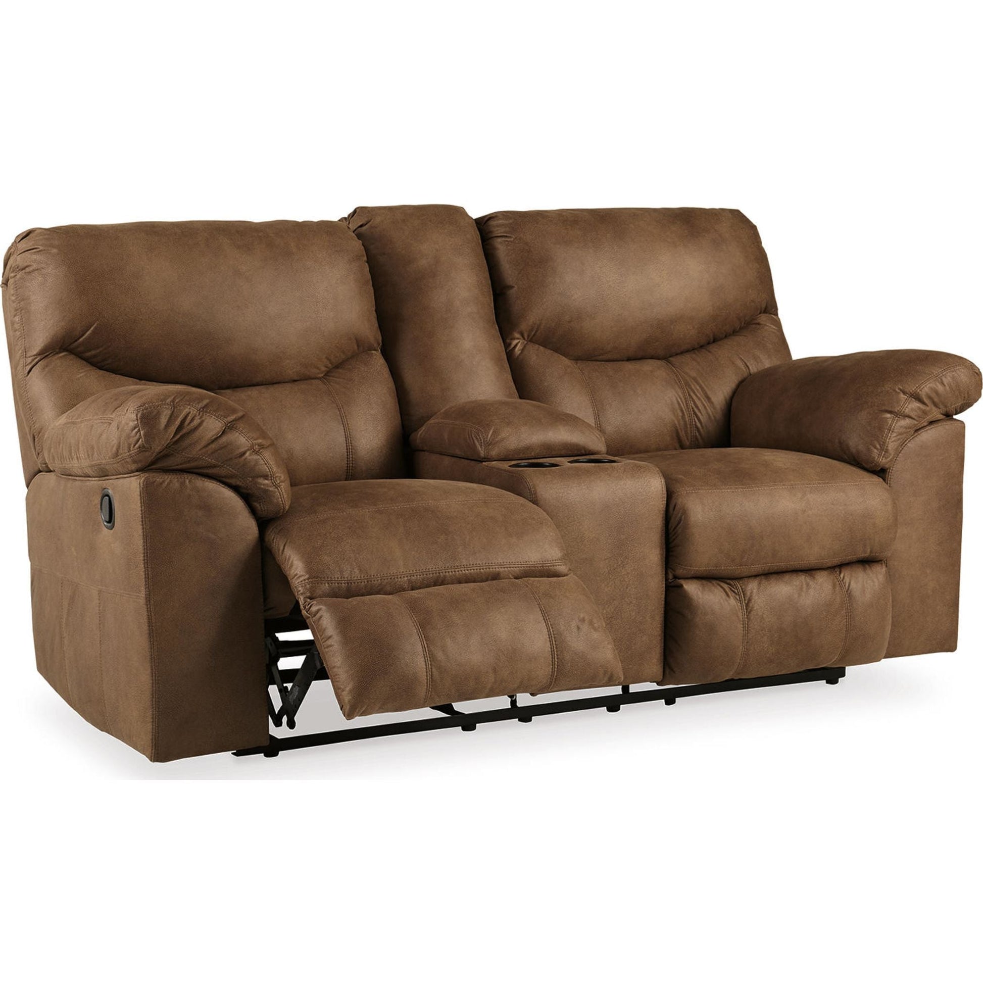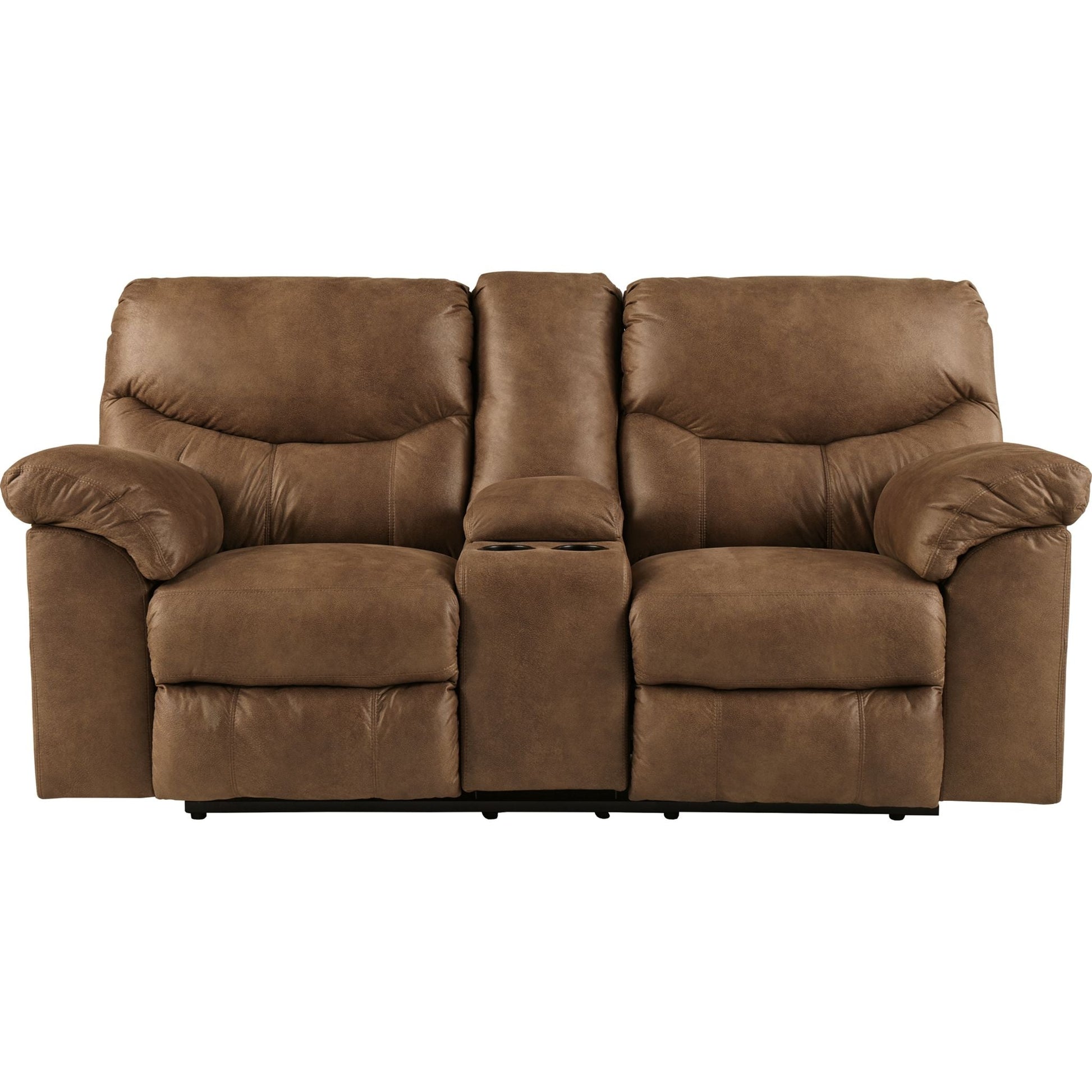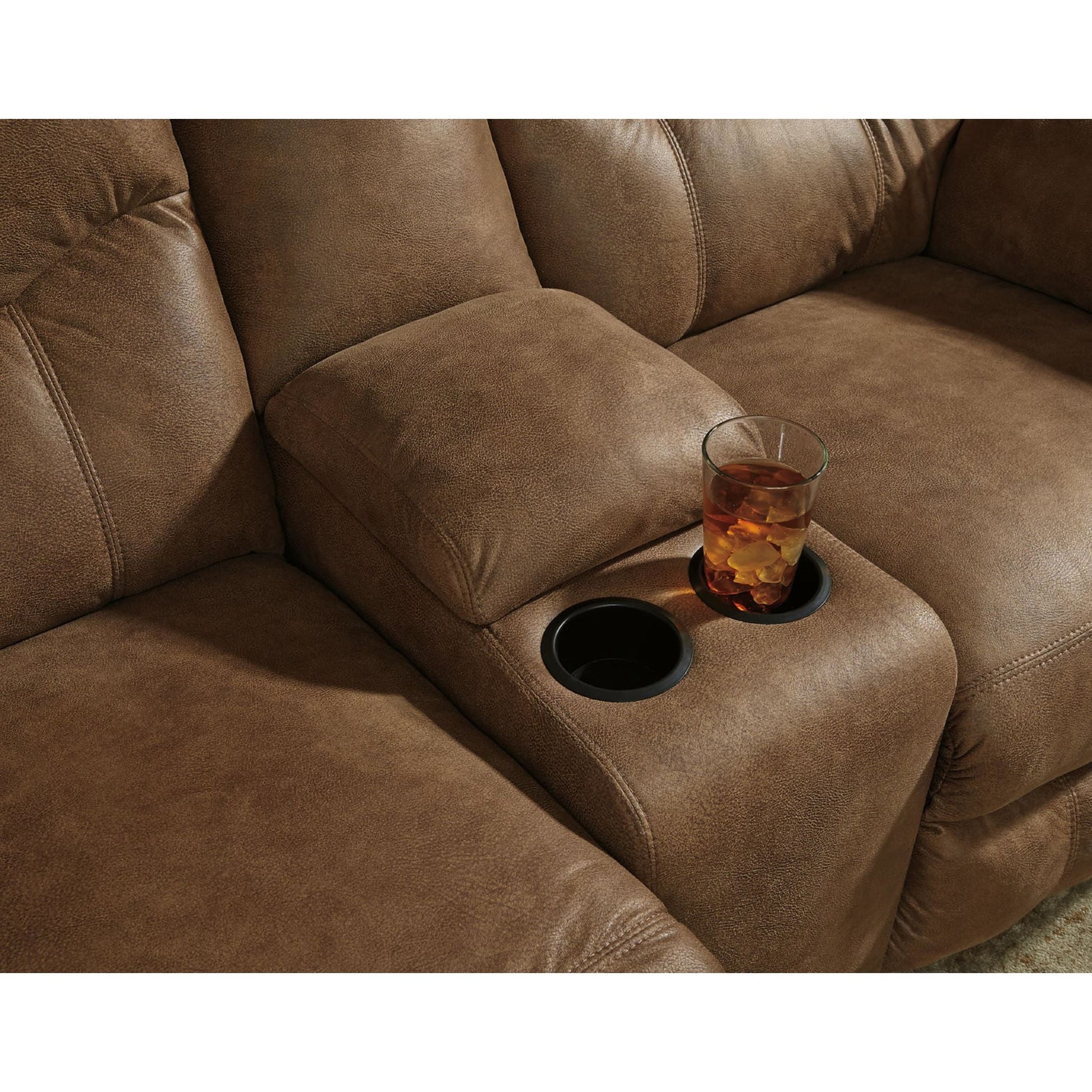 Adoptez le look tendance du cuir sans le prix exorbitant de cette causeuse inclinable avec console. Riche en variations de tons, son revêtement moelleux et moelleux ressemble à s'y méprendre à du cuir véritable. Et quel confort ! Les accoudoirs doublement rembourrés et les somptueux coussins enveloppent et soutiennent parfaitement. Des surpiqûres distinctives accentuent le style contemporain de cette causeuse inclinable. Des porte-gobelets et des rangements dissimulés complètent l'expérience.