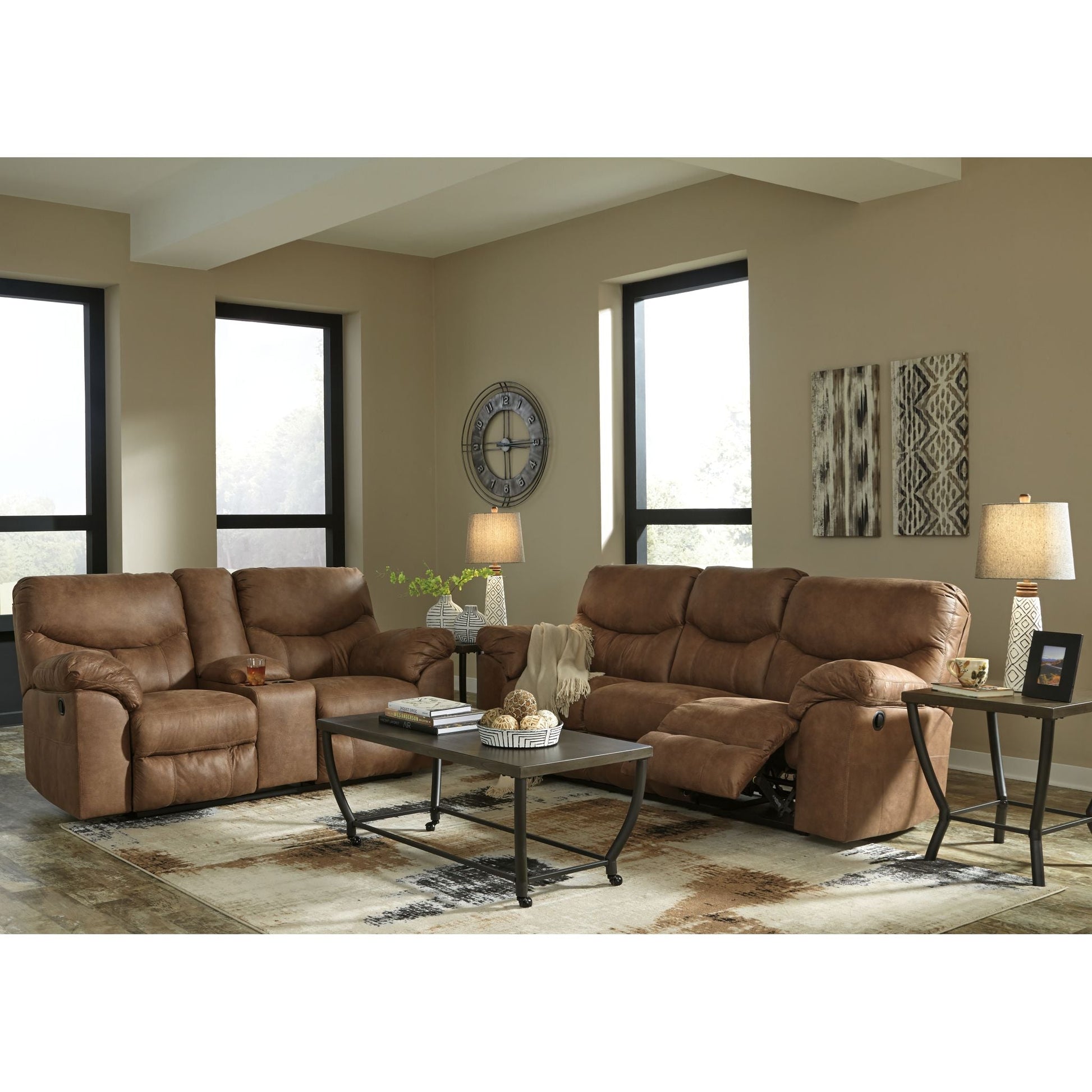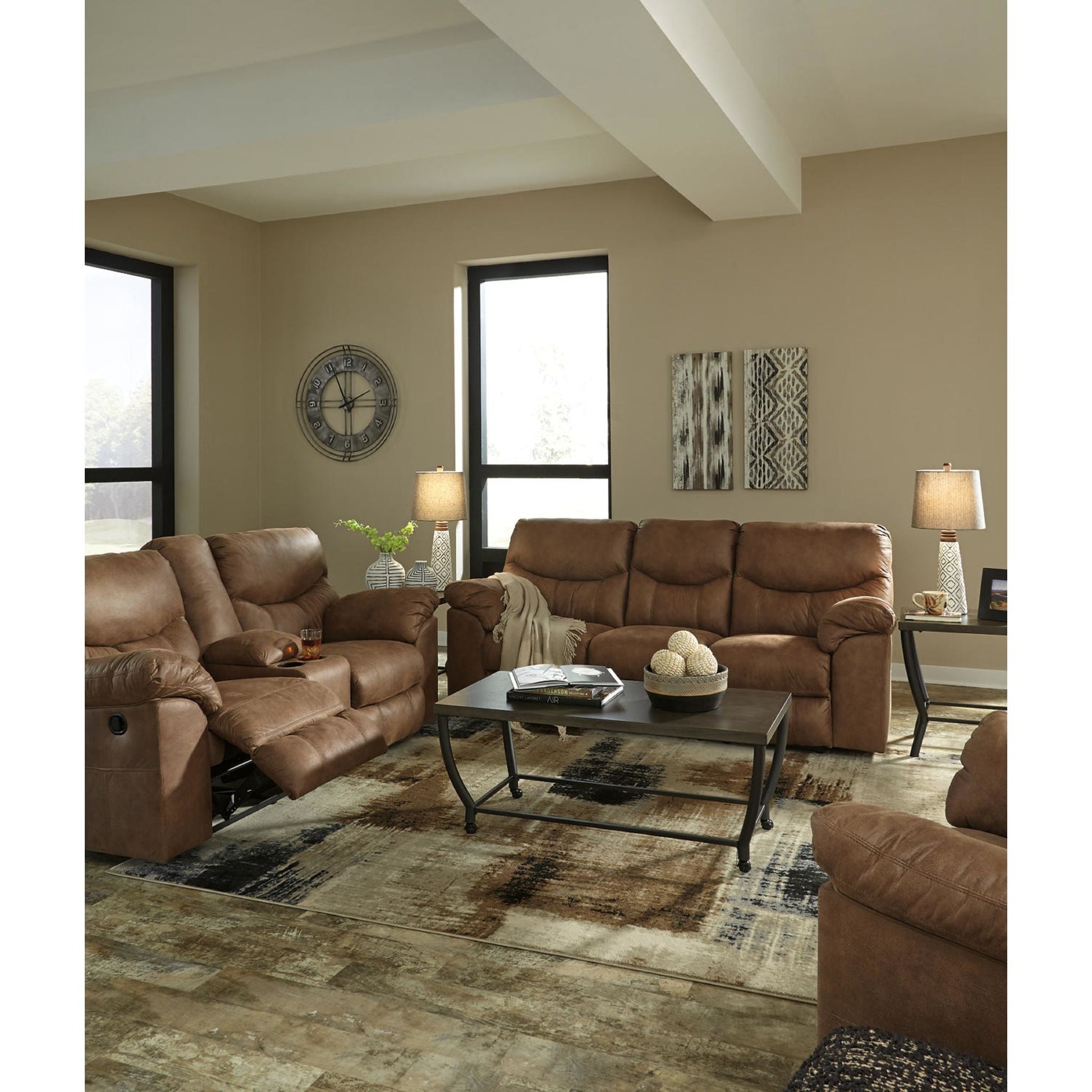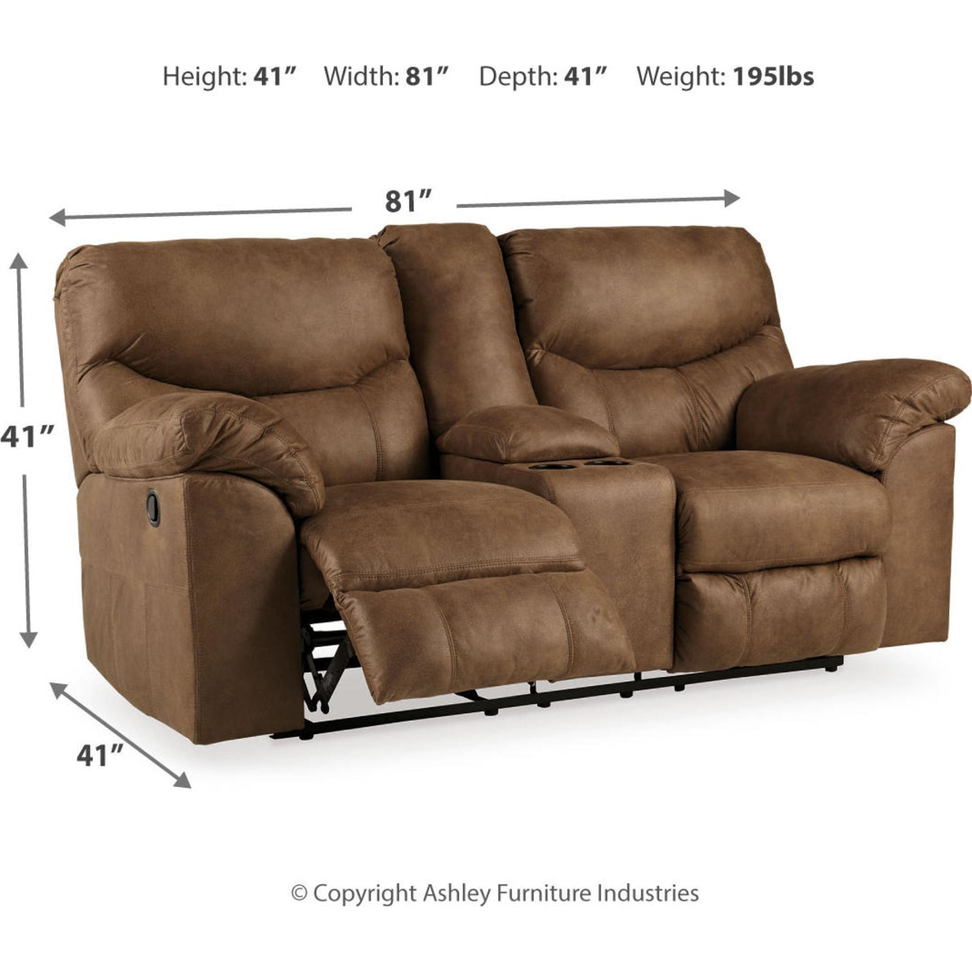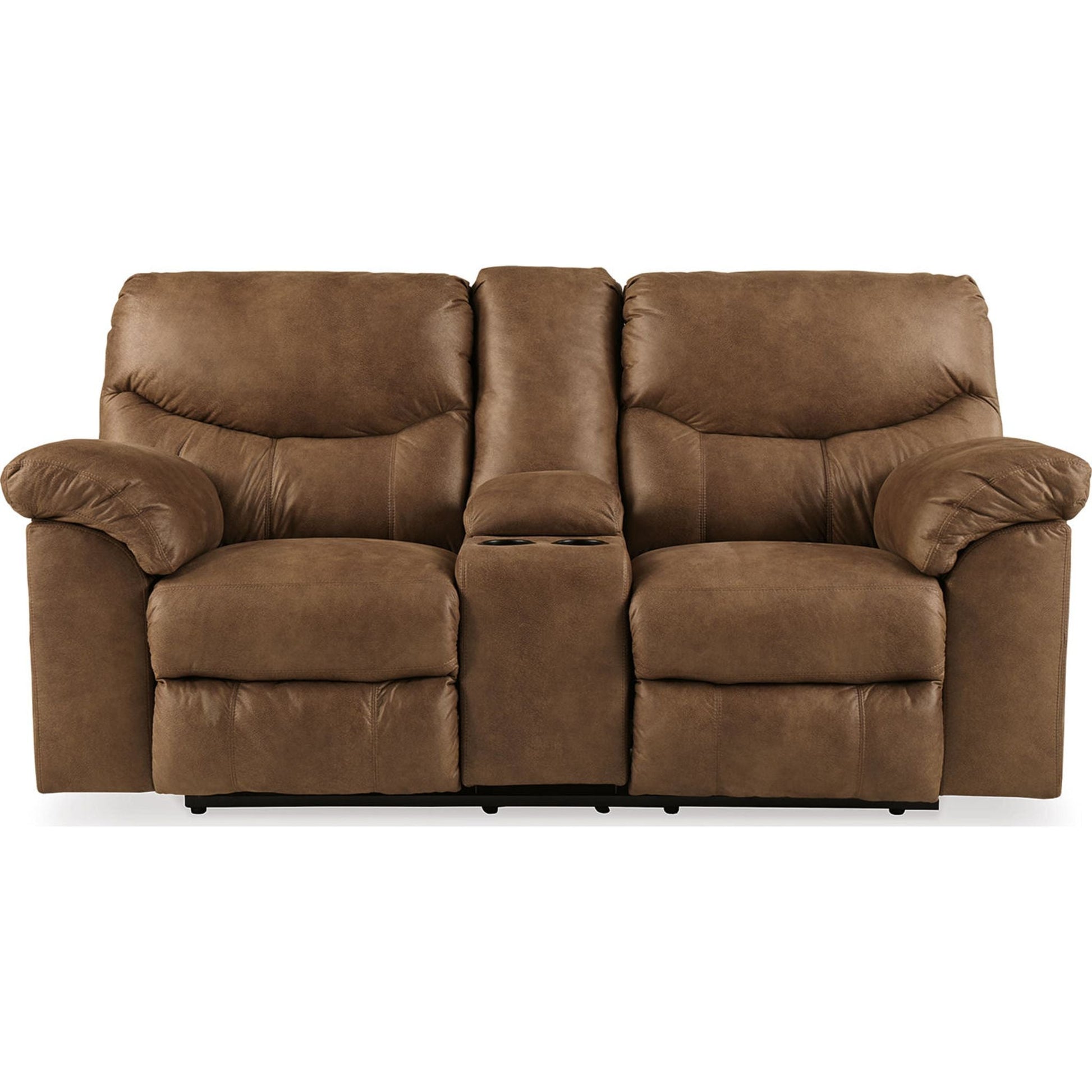 Adoptez le look tendance du cuir sans le prix exorbitant de cette causeuse inclinable avec console. Riche en variations de tons, son revêtement moelleux et moelleux ressemble à s'y méprendre à du cuir véritable. Et quel confort ! Les accoudoirs doublement rembourrés et les somptueux coussins enveloppent et soutiennent parfaitement. Des surpiqûres distinctives accentuent le style contemporain de cette causeuse inclinable. Des porte-gobelets et des rangements dissimulés complètent l'expérience.