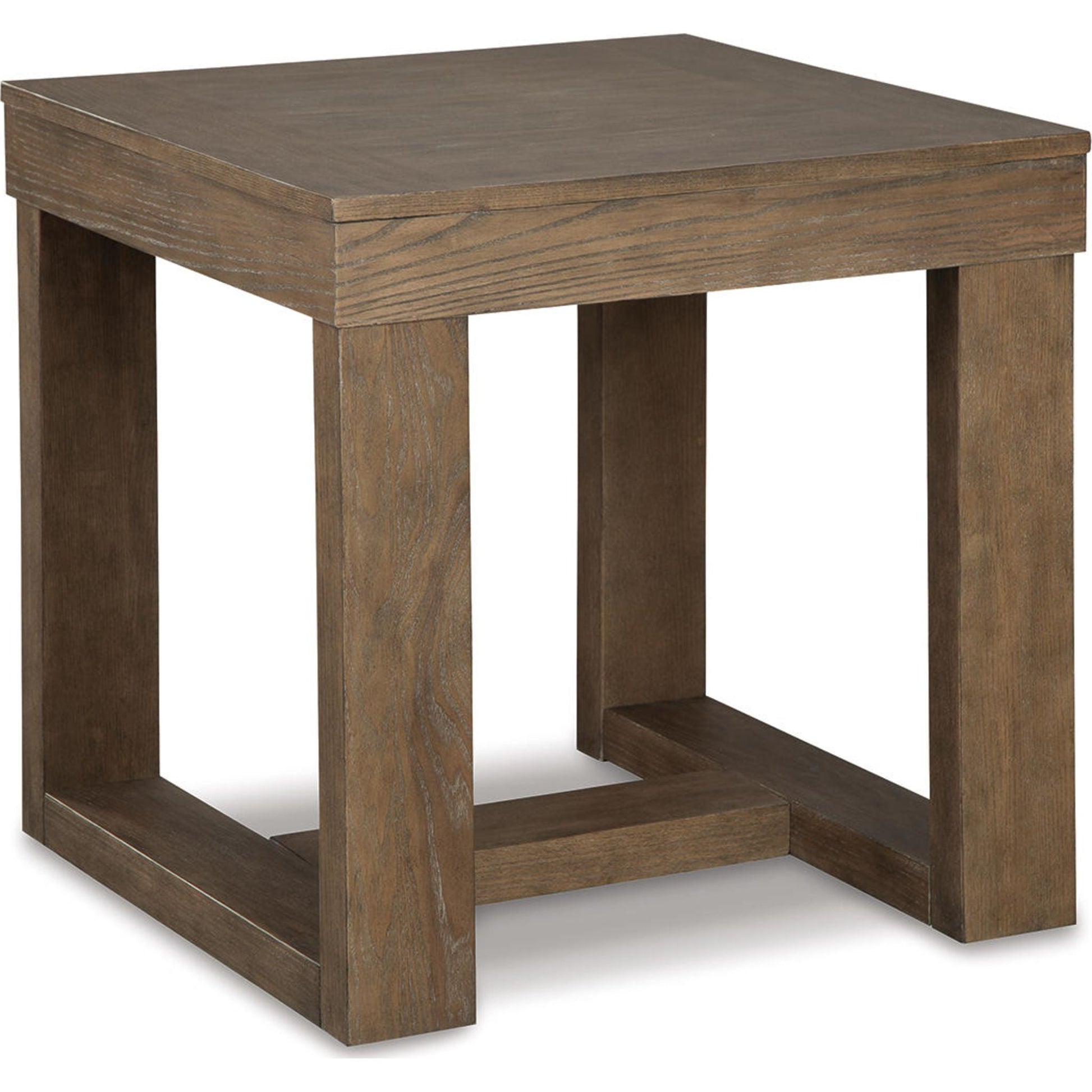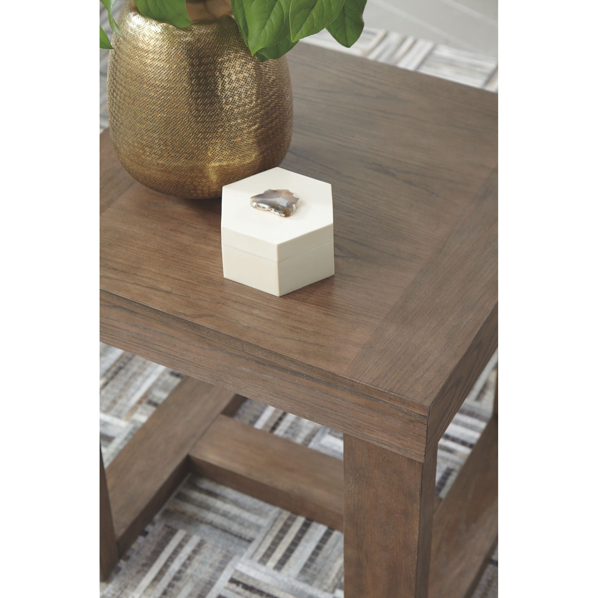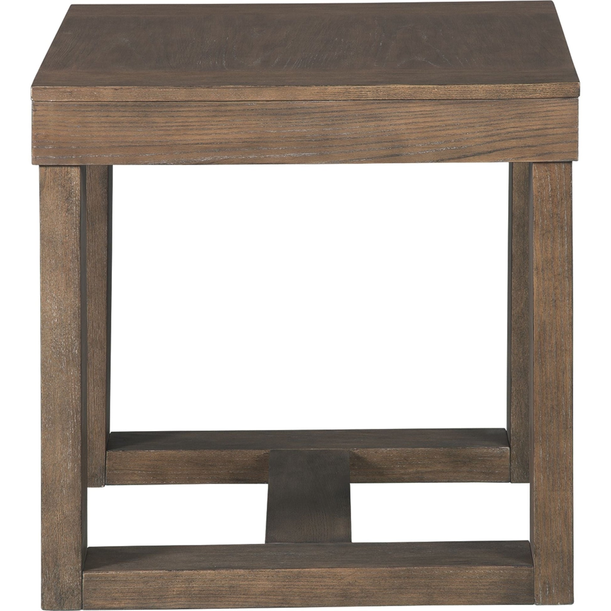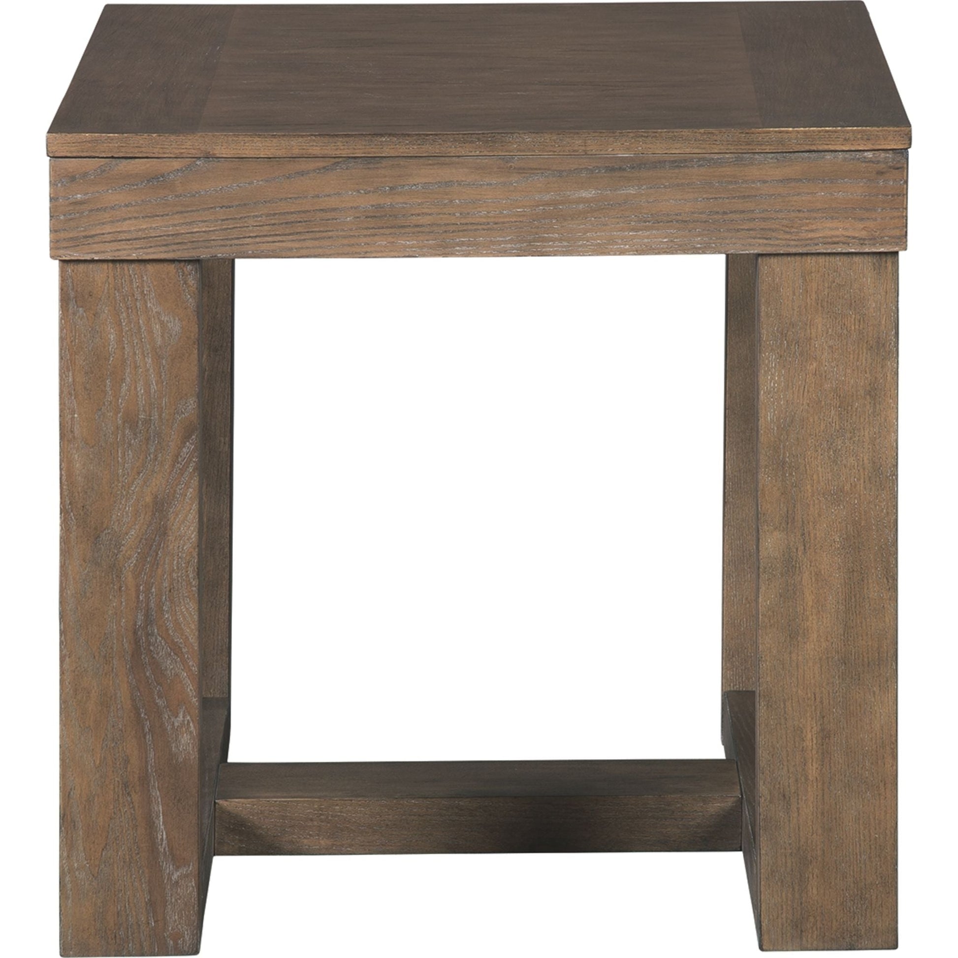 Cette table d'appoint design incarne la tendance du carré. Son profil audacieux et massif est rehaussé d'un effet planche et d'une finition brun-gris texturée pour un look contemporain et une ambiance chaleureuse et accueillante.