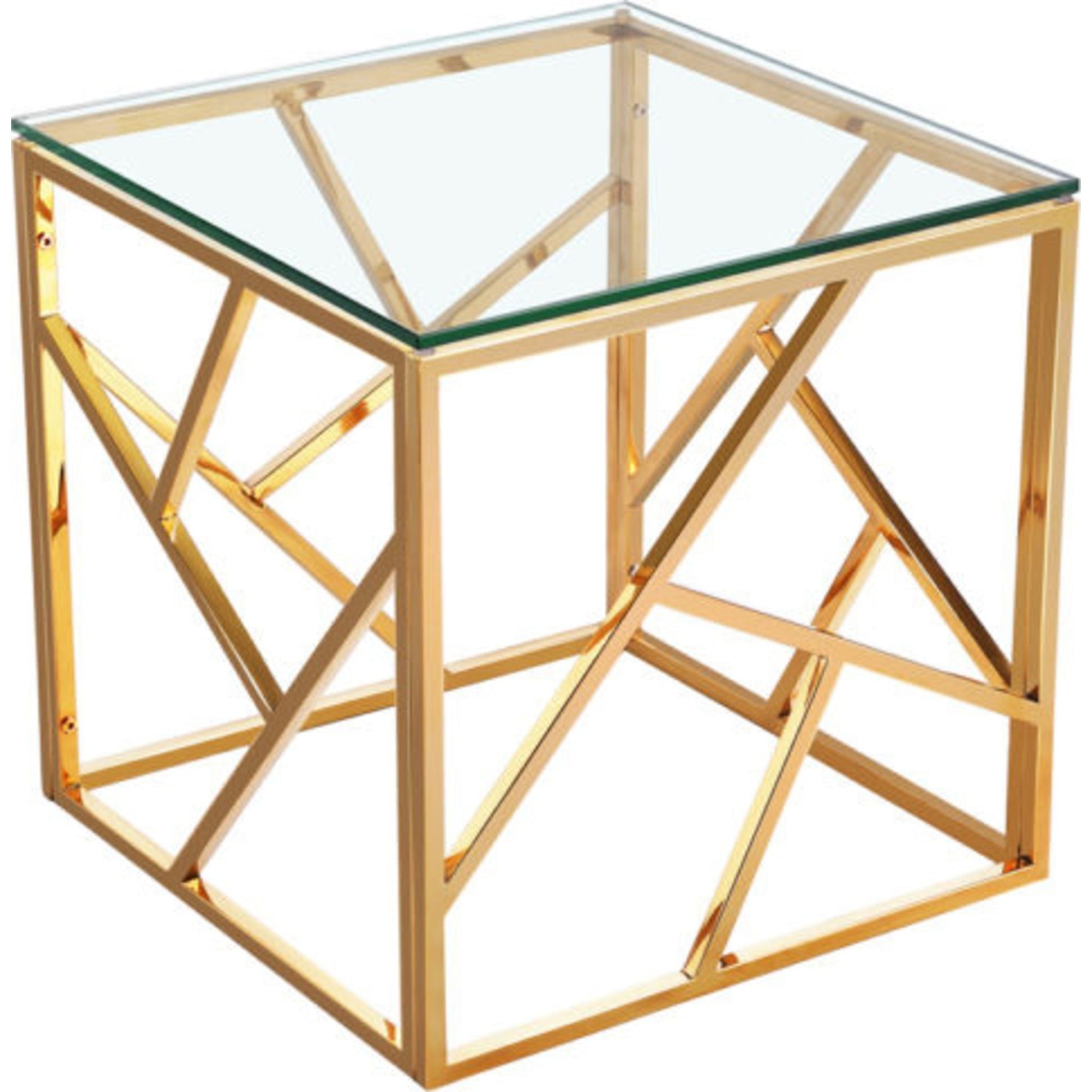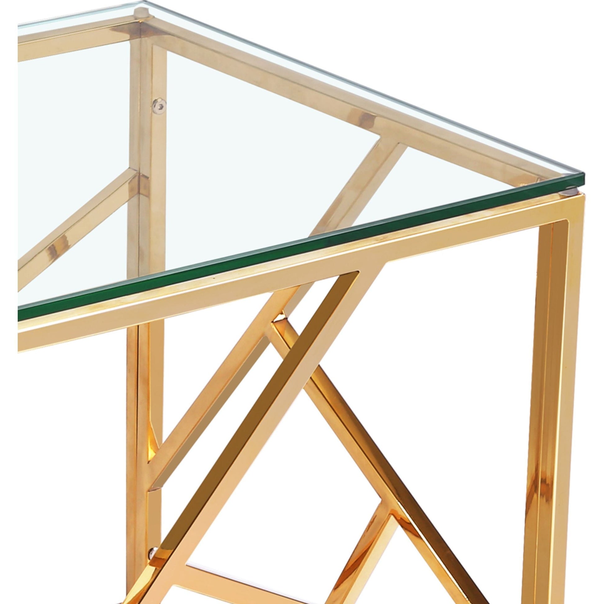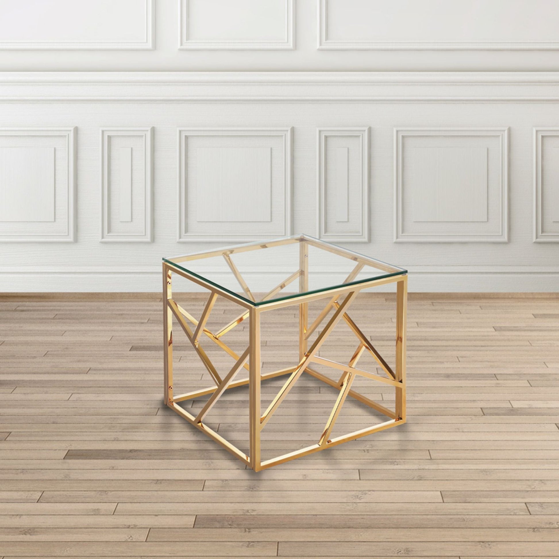 Sublimez votre espace avec la table d'appoint Carole. Dotée d'un motif géométrique ouvert, la table d'appoint Carole offre une finition élégante et raffinée. Son verre trempé rectangulaire repose sur un piètement en métal doré, associant deux matériaux pour créer un ensemble élégant. L'interaction du verre et du métal confère à cette table d'appoint Carole dorée un look contemporain. Elle est idéale pour compléter la décoration de votre salon ou pour ancrer un coin salon dans la salle de télévision ou de divertissement. Associez cette table d'appoint rectangulaire à des meubles somptueux aux couleurs neutres ou foncées et à un tapis doux. Intégrez des accessoires aux touches métalliques et brillantes, comme une peinture murale aux accents de feuilles d'or, pour un espace glamour et moderne, empreint de texture et de charme. Le verre trempé est robuste et sûr à utiliser. Il suffit de le nettoyer avec un chiffon doux et humide, puis de l'essuyer pour une surface impeccable. La table d'appoint Carole est dotée d'un piètement en métal doré. Le piètement en métal présente un motif géométrique. Le plateau en verre trempé souligne son design élégant.
