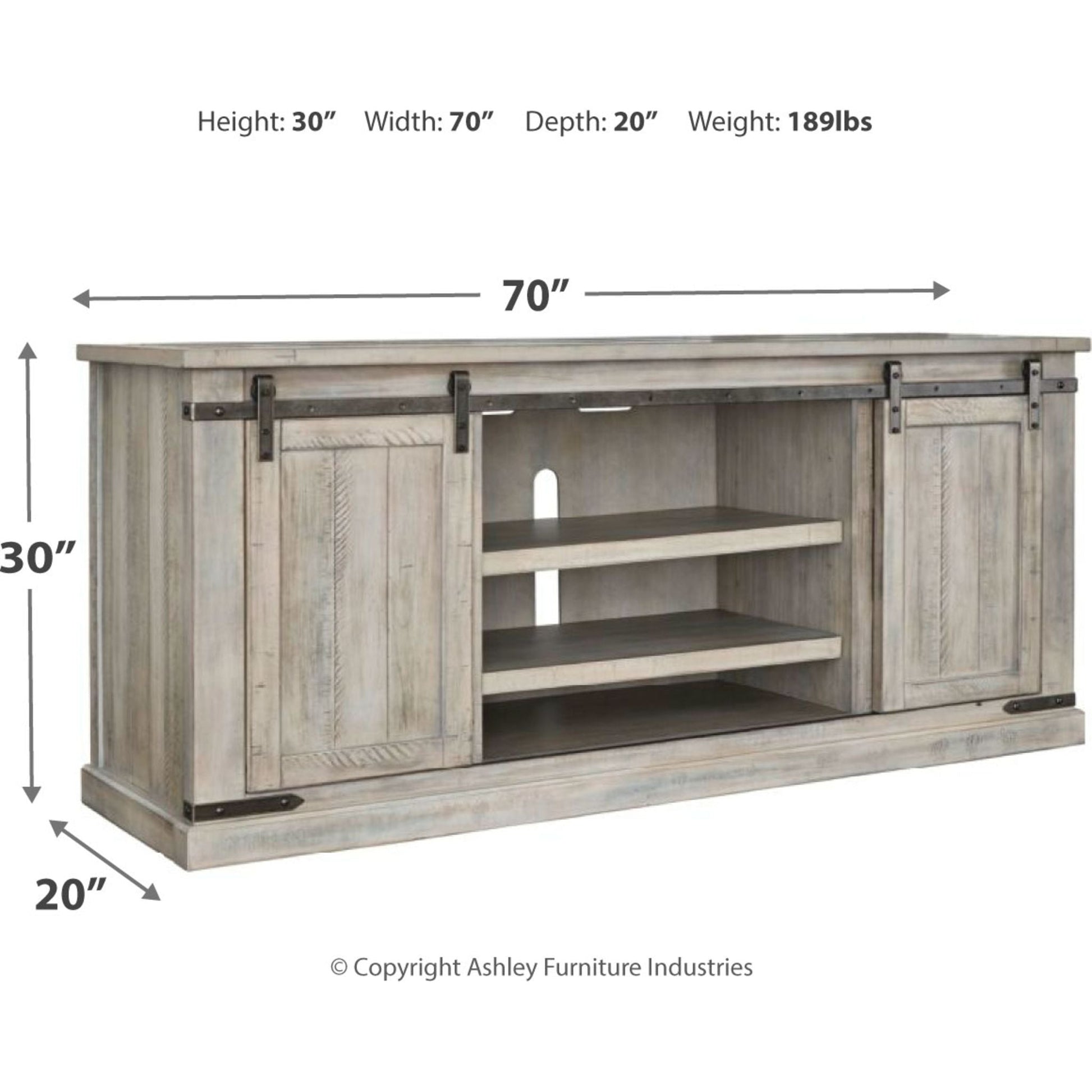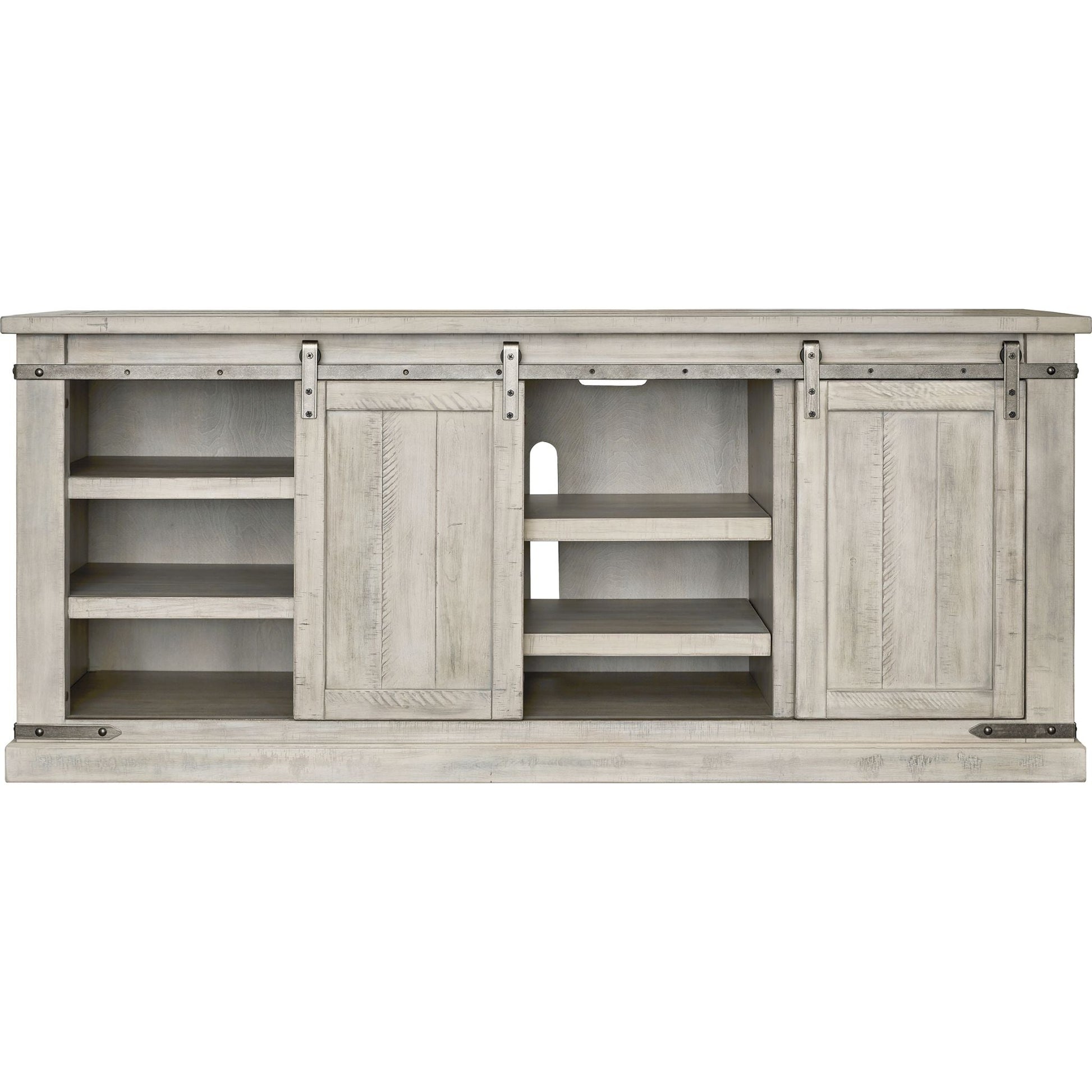 Interprétation éclatante du style rustique moderne (avec ses portes de grange coulissantes), ce meuble TV s'accorde parfaitement avec votre style décontracté et riche. Son profil épuré et chaleureux est rehaussé d'une finition blanchie complexe, avec un charmant effet vieilli et effet planche. La quincaillerie en métal gris vieilli apporte une touche sophistiquée.