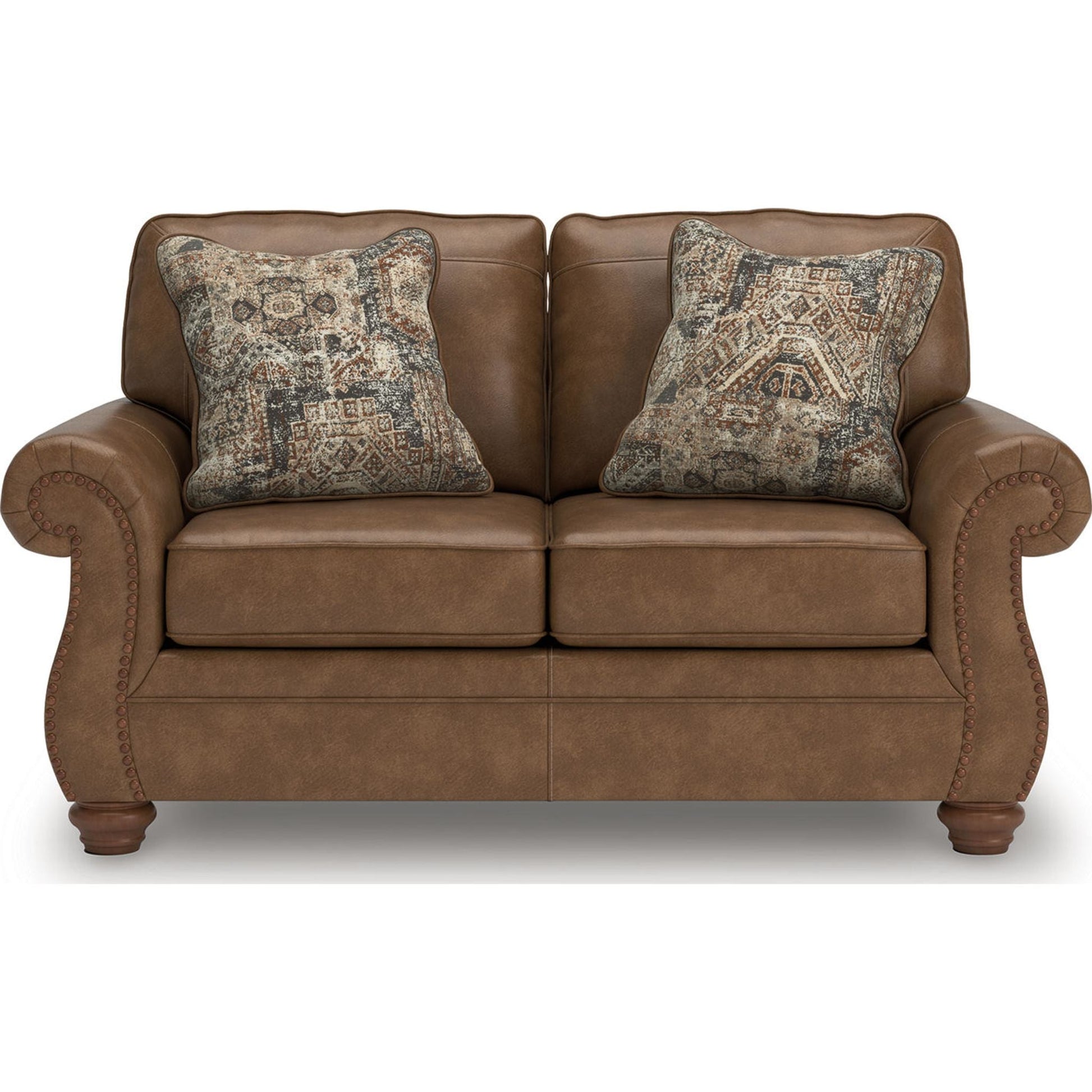Avec cette causeuse, chacun trouvera la meilleure place. Sa garniture cloutée apporte la touche finale aux accoudoirs traditionnels que vous appréciez. Des coussins confortables et durables, enveloppés d'un similicuir à la fois rustique et sophistiqué, vous invitent à la détente. Des coussins en chenille au motif vieilli ajoutent une touche de confort supplémentaire. Les pieds tournés de la causeuse témoignent d'un style et d'une qualité irréprochables.