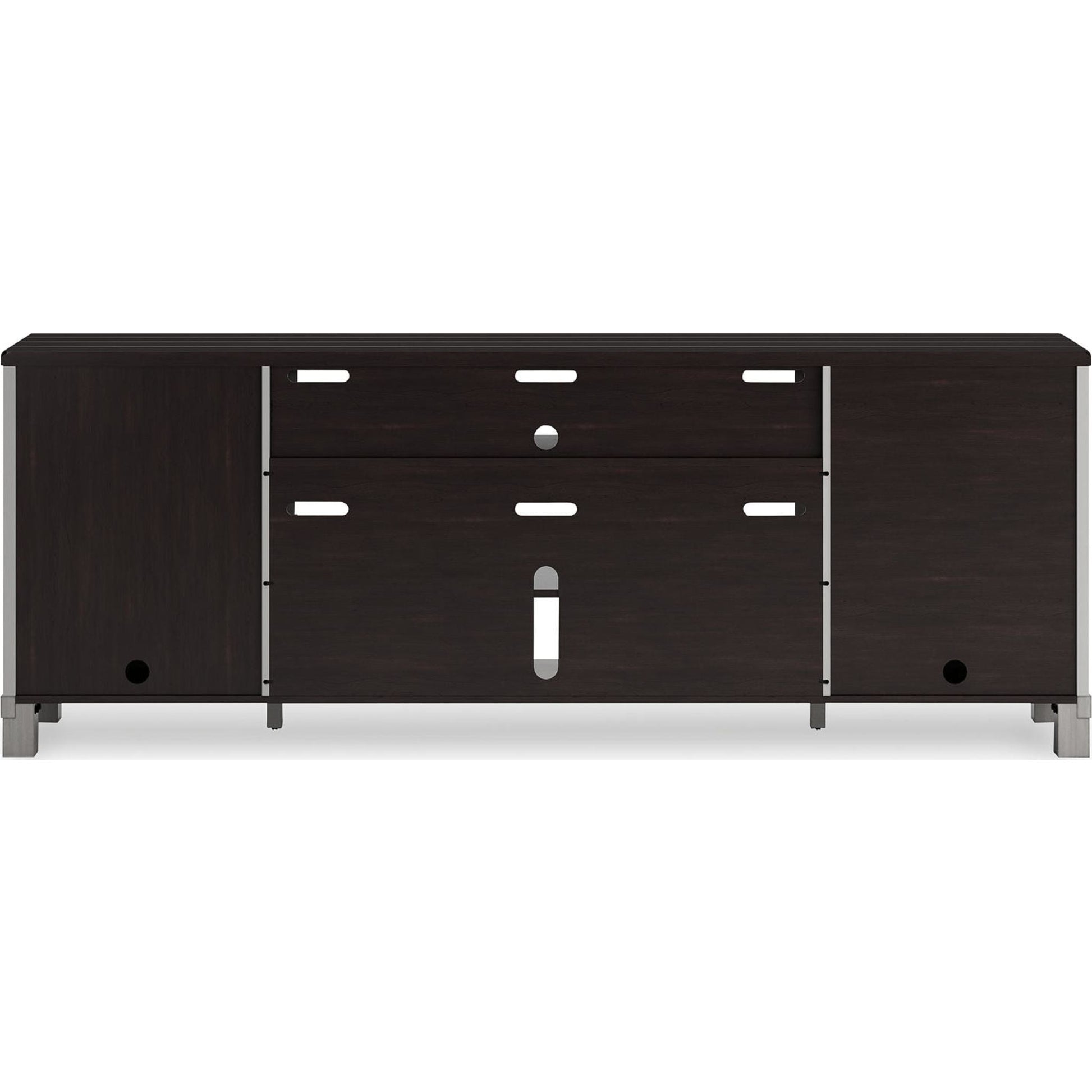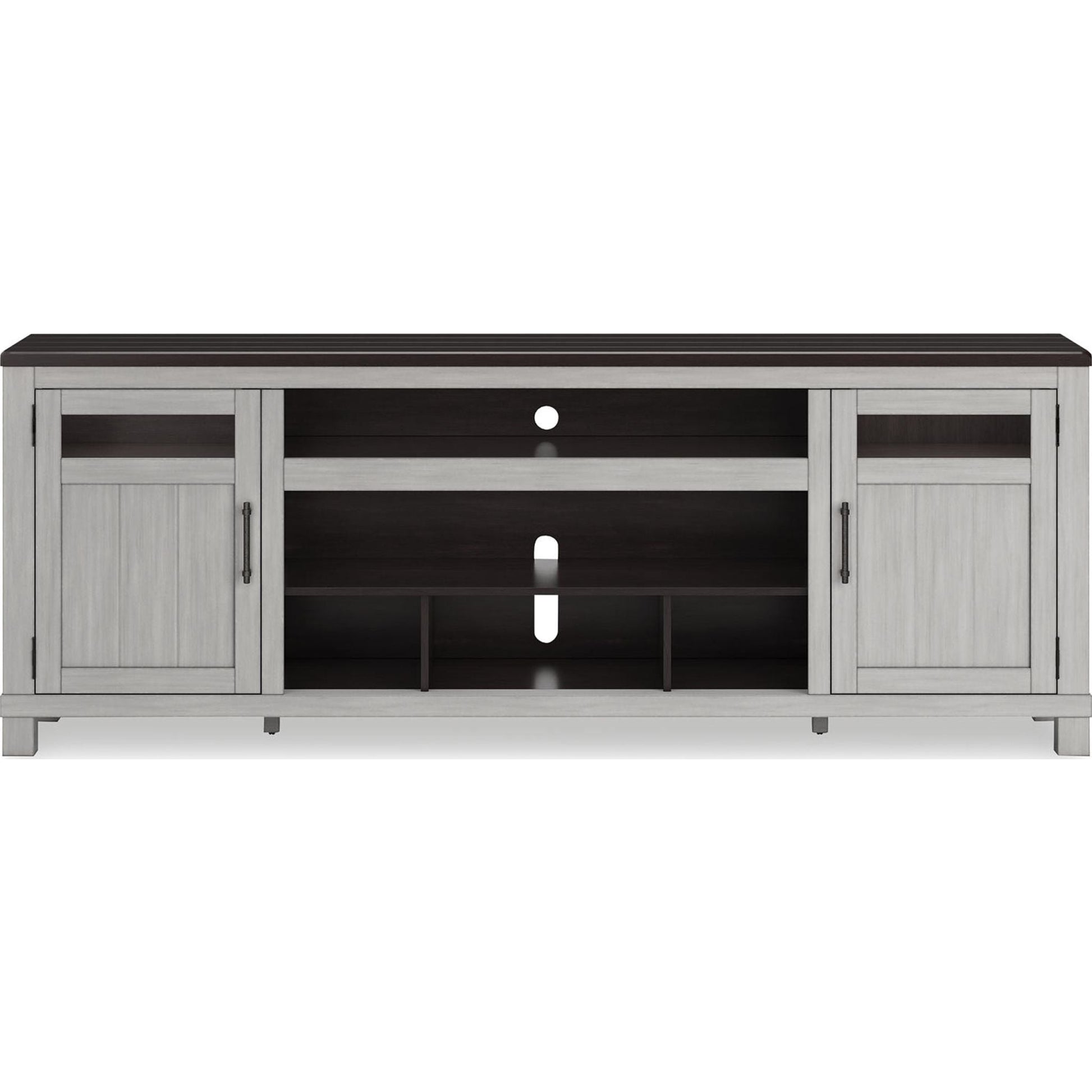 Adoptez une allure rustique avec ce meuble TV. Magnifiquement conçu pour résister à l'épreuve du temps, il présente un effet planches et une finition bicolore épurée qui lui confèrent une atmosphère vintage relaxante. Doté de deux armoires (chacune avec une étagère réglable) et d'un compartiment ouvert, il offre un vaste espace de rangement pour tous vos appareils électroniques. Pour une expérience encore plus agréable, l'insert de cheminée (vendu séparément) apporte une touche de chaleur et une ambiance agréable à votre salon.
