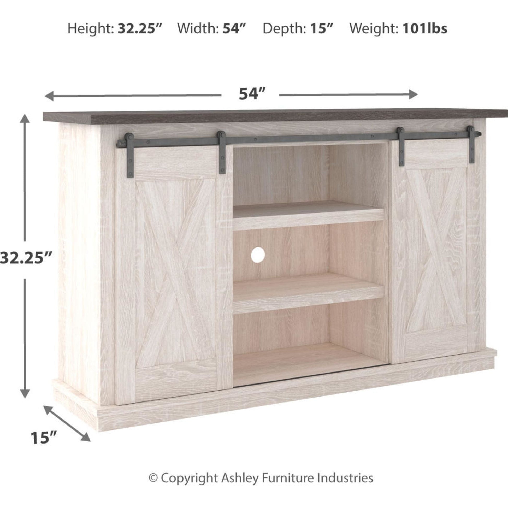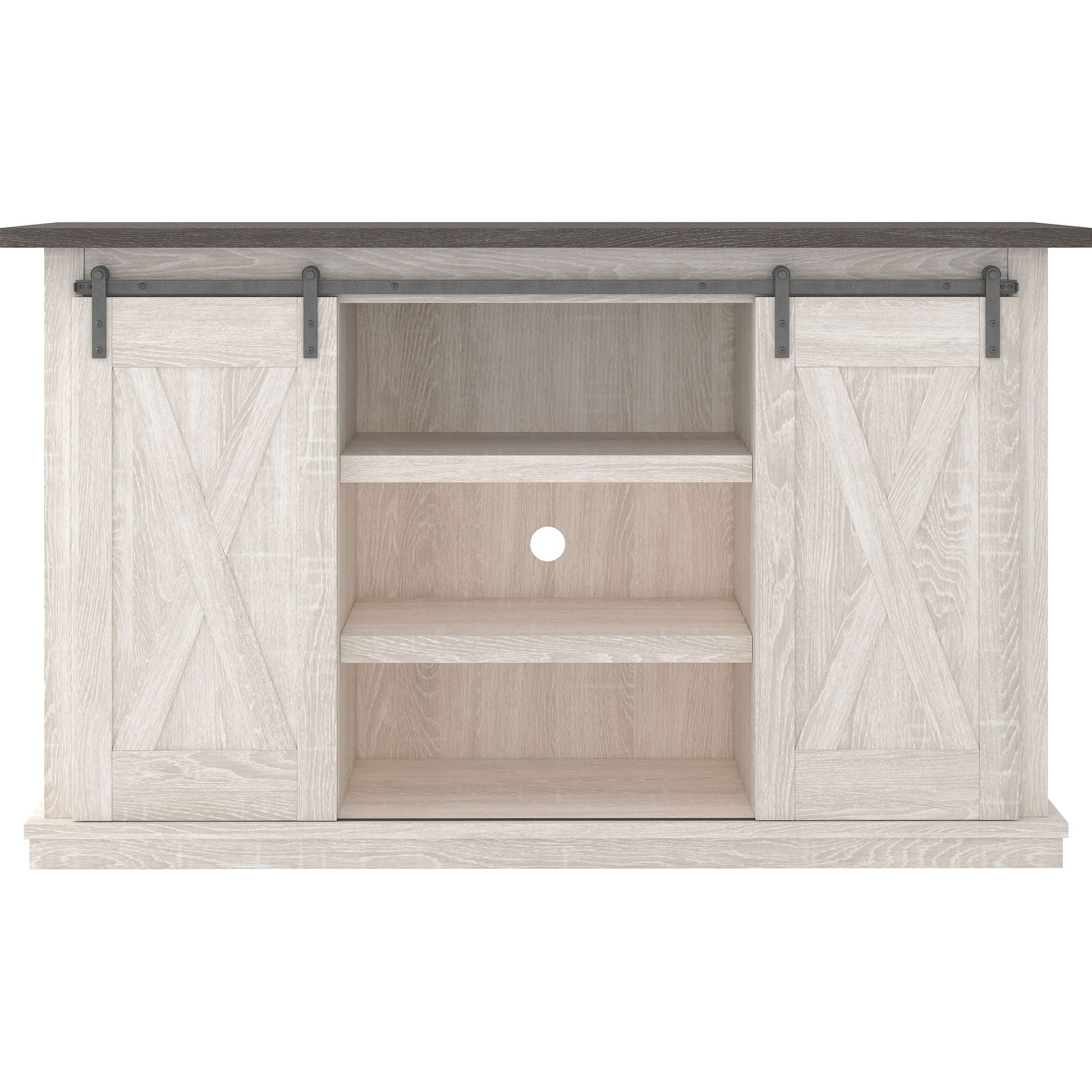 Avec sa finition bicolore, ses détails en croix et son charme authentique, ce meuble TV s'accorde parfaitement avec votre style décontracté. Conçu pour accueillir votre équipement multimédia, il est équipé d'étagères réglables, de découpes pour la gestion des câbles et, bien sûr, de deux portes coulissantes à grange centrales ou latérales. Une véritable maîtrise de la vie de campagne moderne.