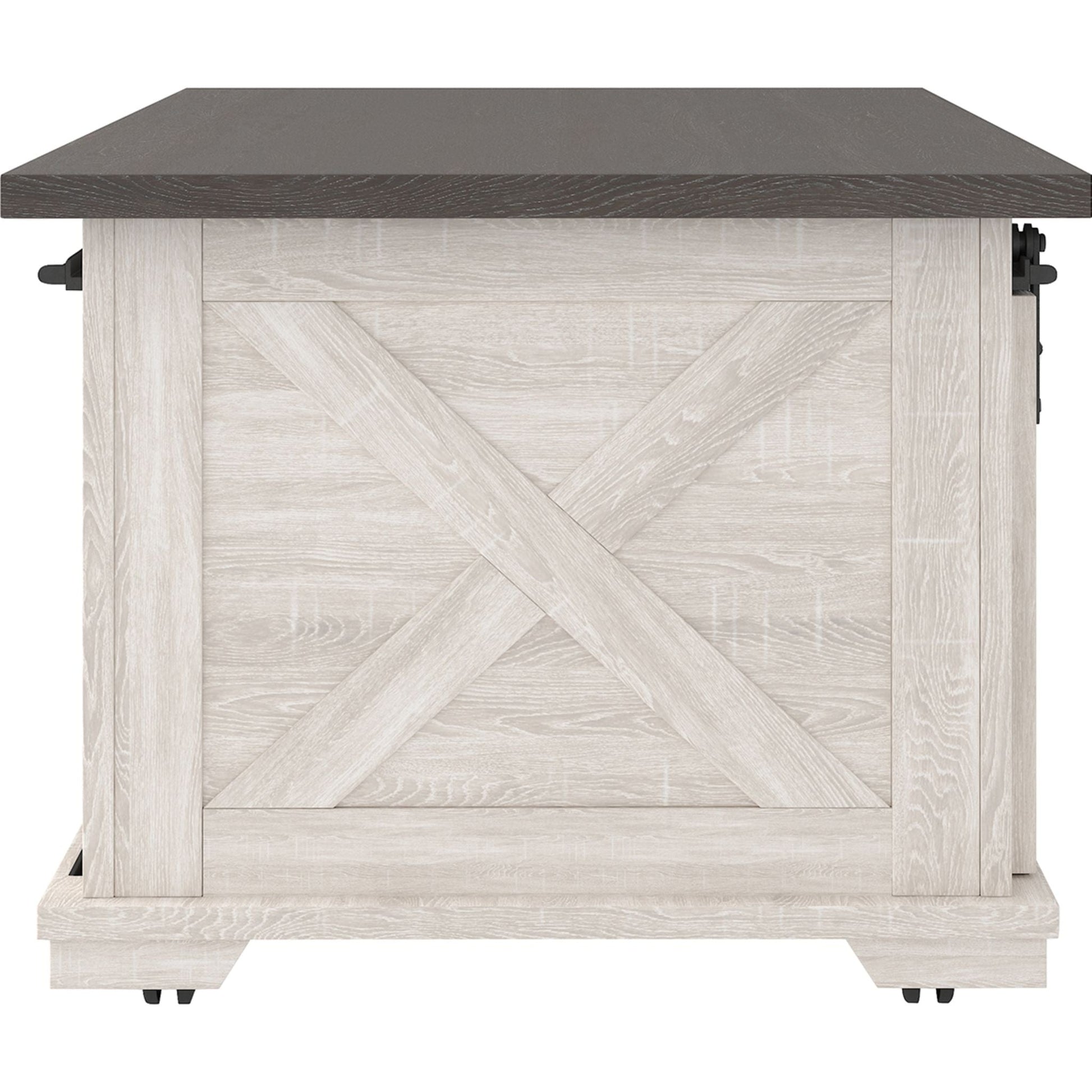 Rehaussez le style campagnard moderne avec cette table basse polyvalente. Arborant une palette bicolore, gris et blanc vieilli, et un motif en croix, sa porte coulissante unique révèle un espace de rangement à étagères. Ses roulettes pivotantes ajoutent une touche tendance et tendance.