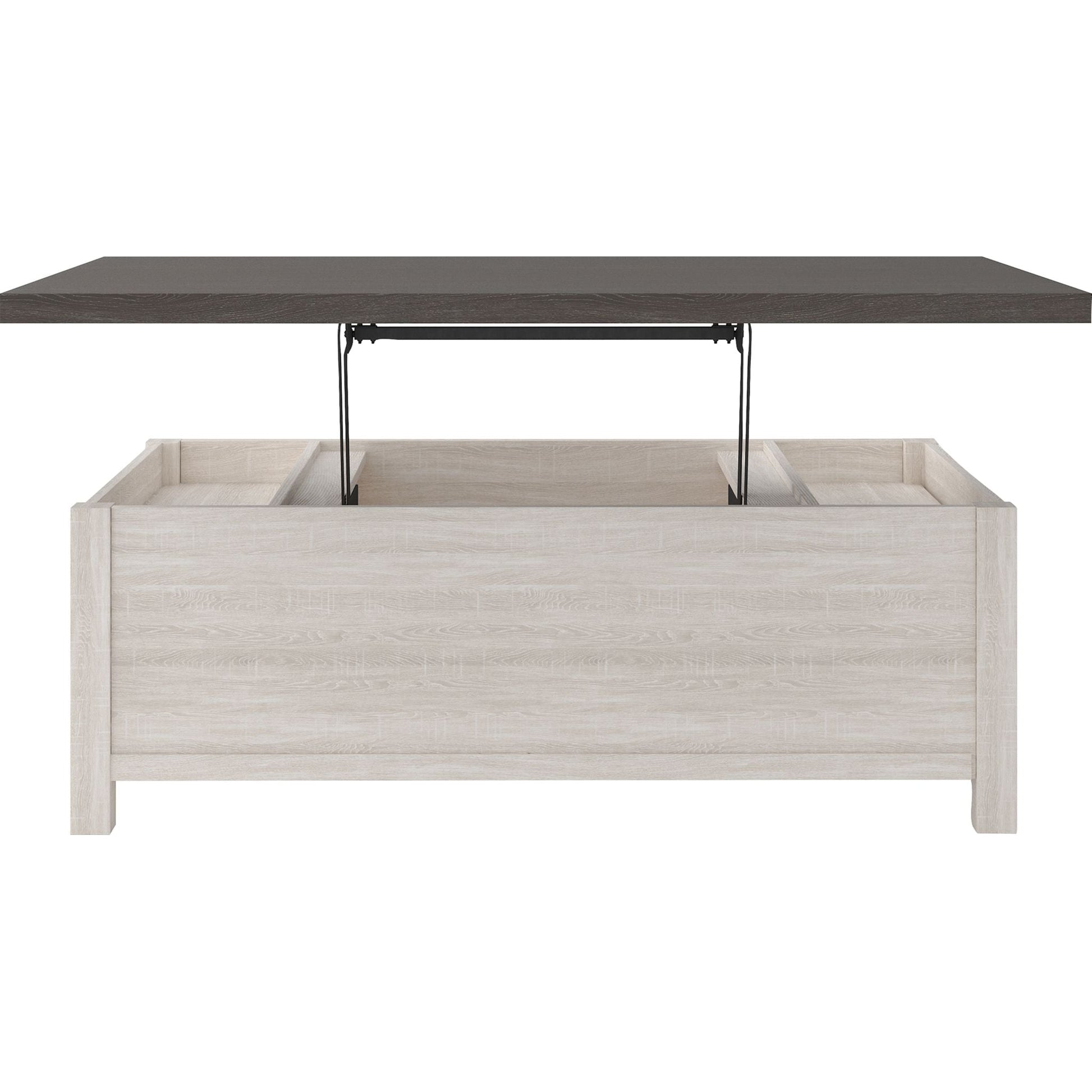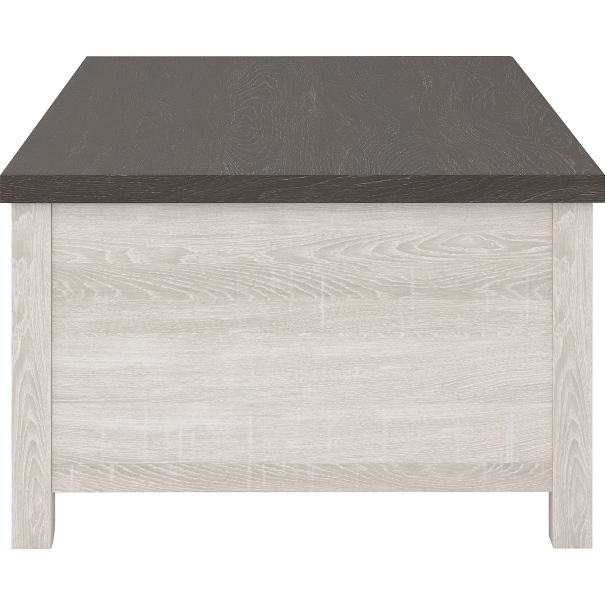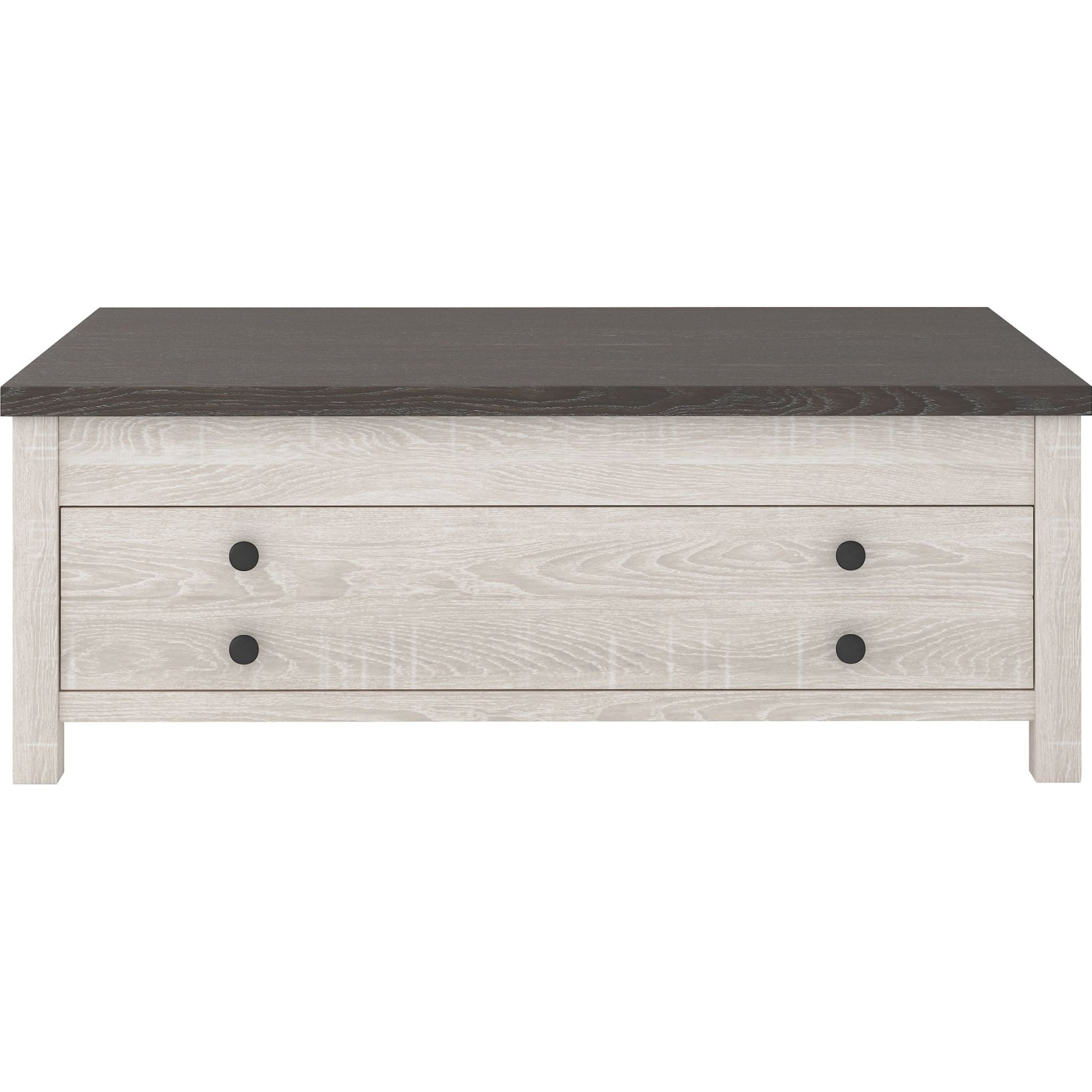 Relevez le niveau du design campagnard moderne avec cette table basse à plateau relevable. Arborant une palette de couleurs bicolore gris et blanc vieilli, cette pièce s'impose partout. Son mécanisme à ressort pratique rapproche le plateau de vous. Cette table polyvalente vous permet de manger, travailler ou jouer confortablement installé dans votre canapé.