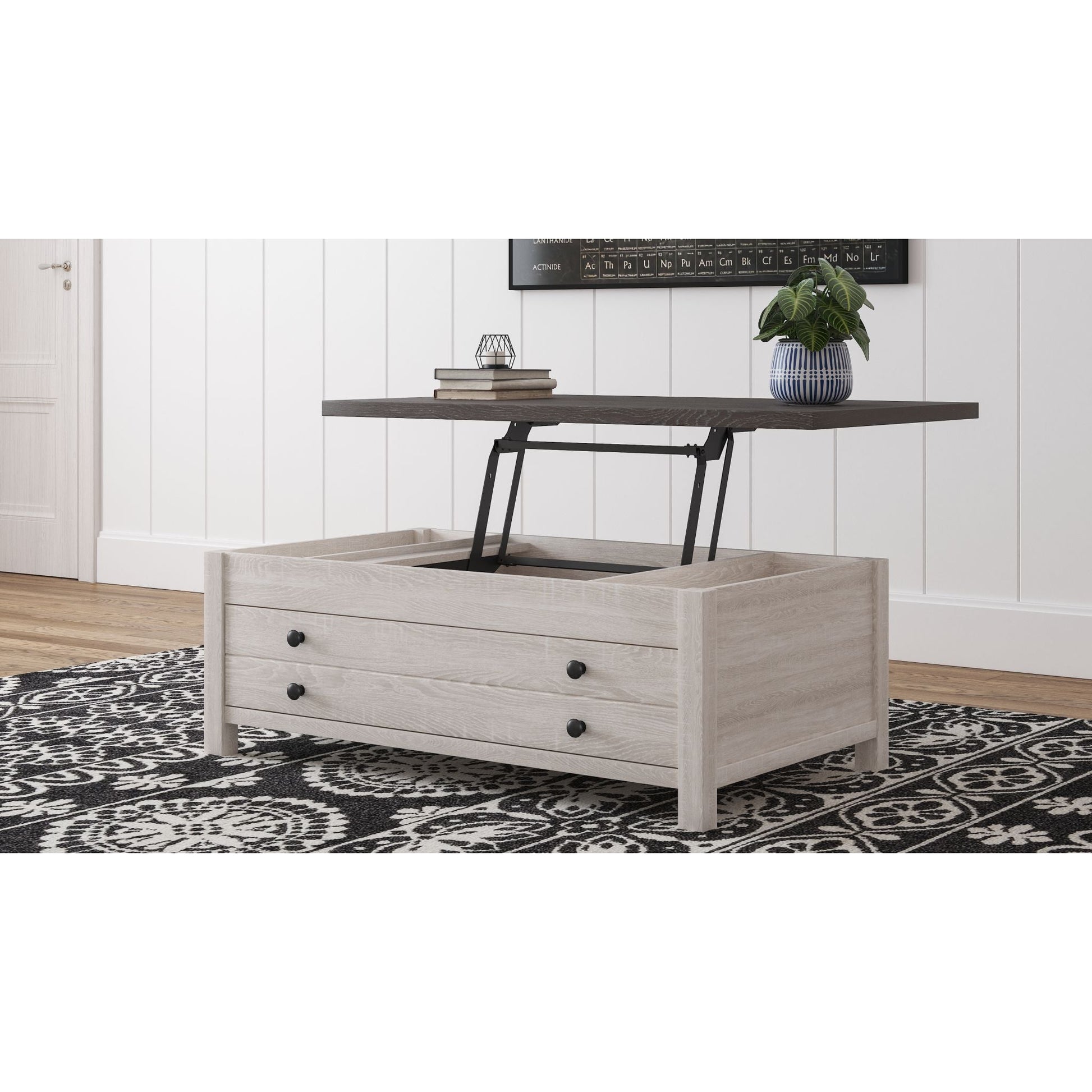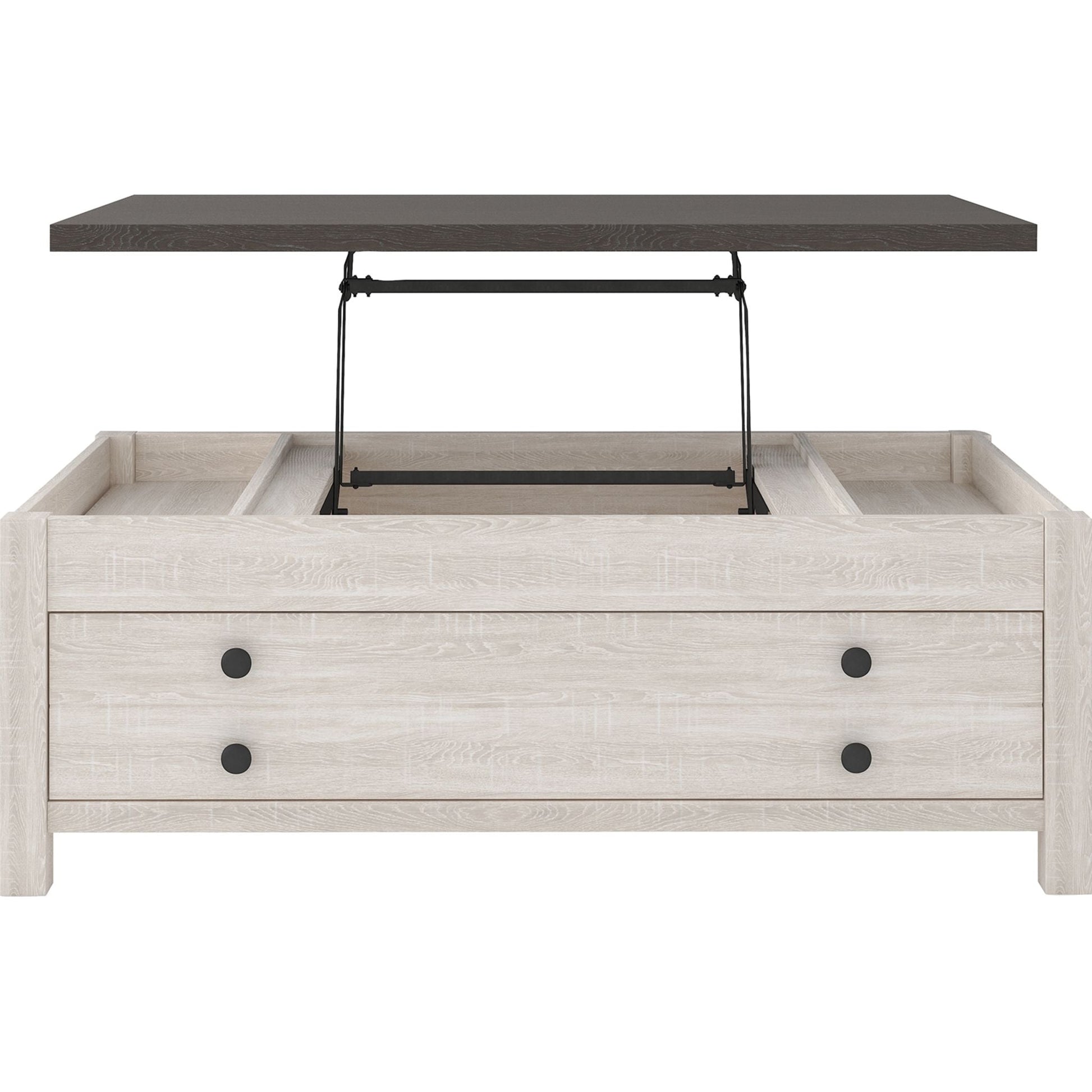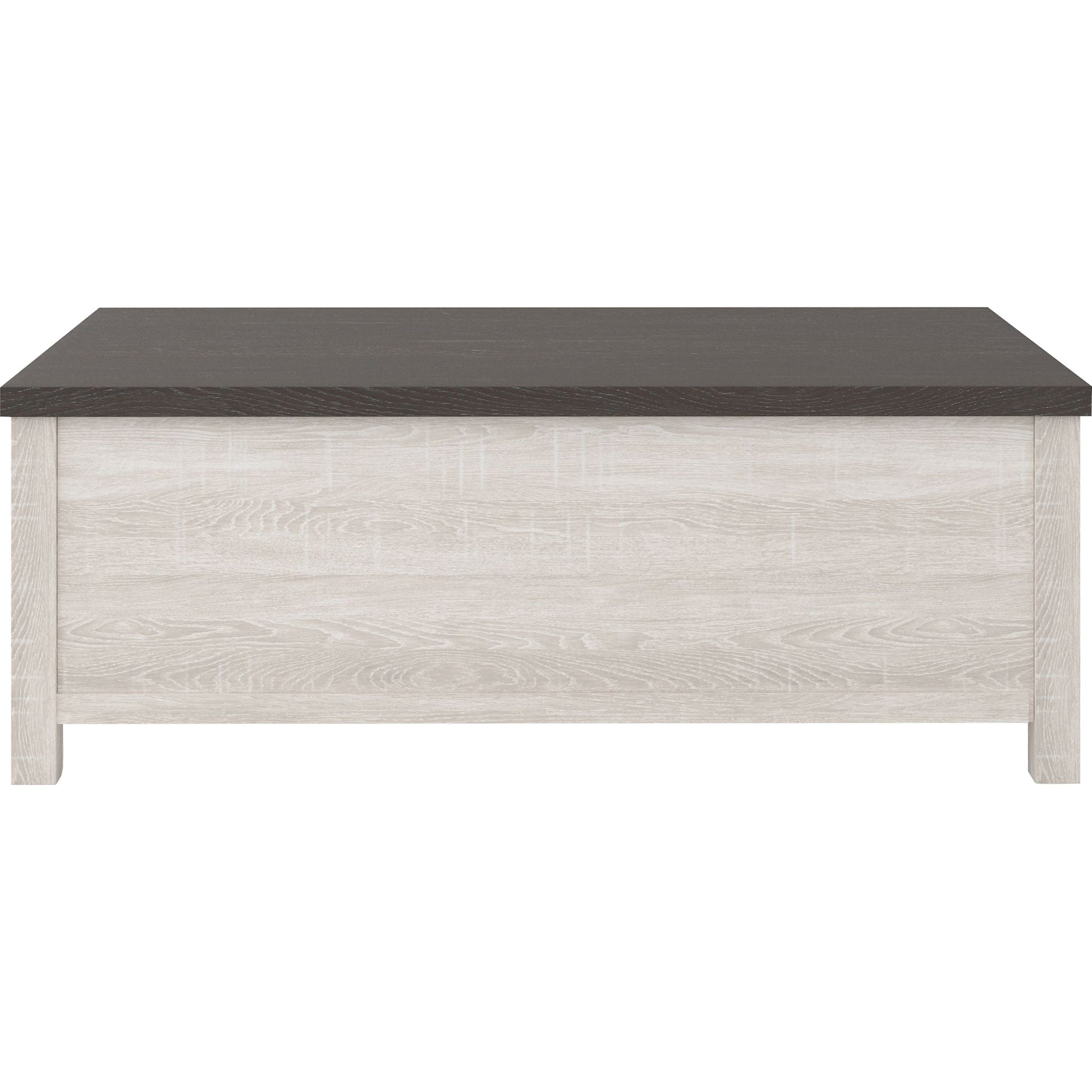 Relevez le niveau du design campagnard moderne avec cette table basse à plateau relevable. Arborant une palette de couleurs bicolore gris et blanc vieilli, cette pièce s'impose partout. Son mécanisme à ressort pratique rapproche le plateau de vous. Cette table polyvalente vous permet de manger, travailler ou jouer confortablement installé dans votre canapé.