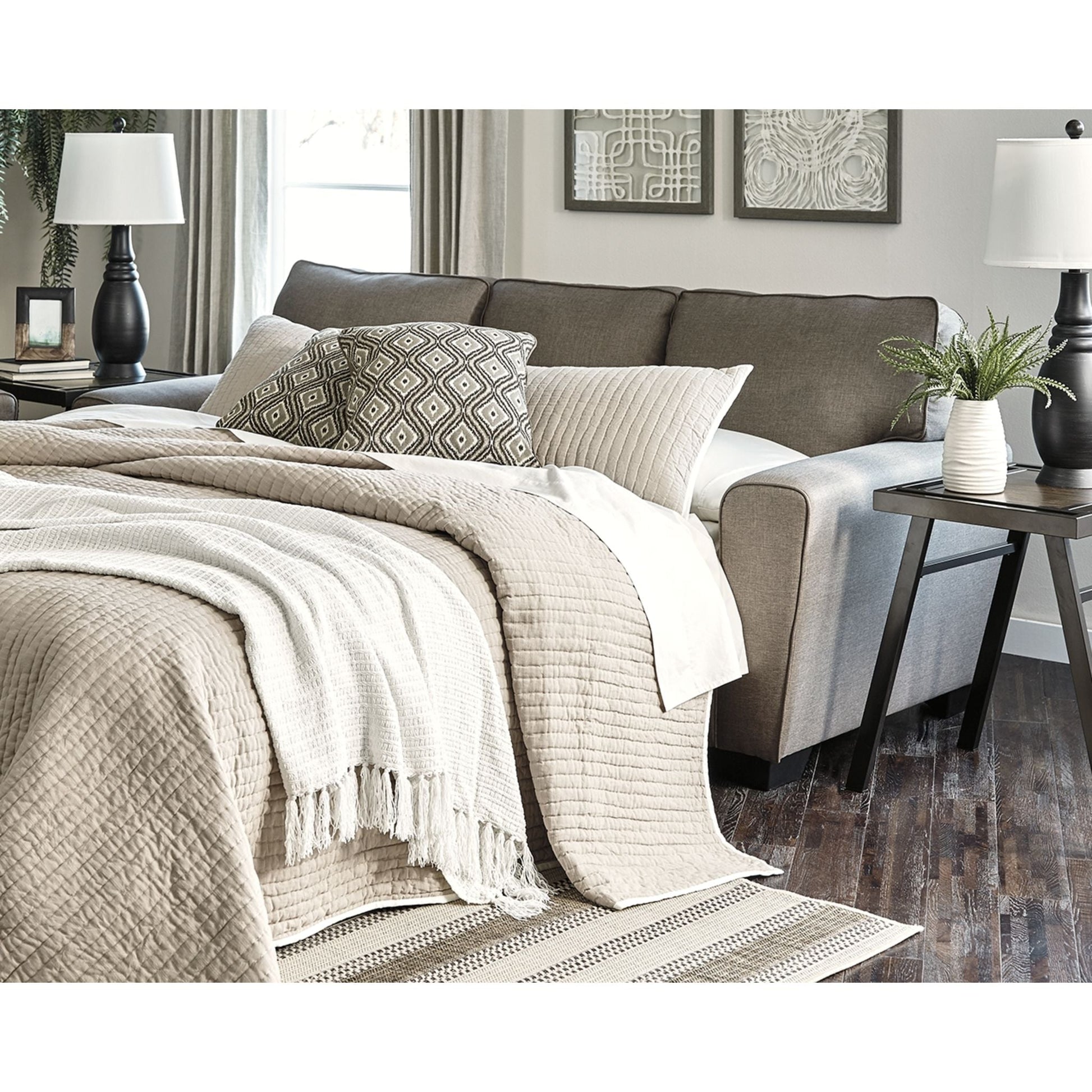 Avec ce canapé-lit, vous avez un allié sur qui vous appuyer. Recouvert d'un élégant revêtement tissé, il dégage une atmosphère contemporaine et décontractée. Installez-vous confortablement dans ses larges accoudoirs fuselés. Le motif Ikat rehausse le style des coussins marron et crème. Le matelas gigogne queen en mousse à mémoire de forme offre un confort supplémentaire aux invités qui passent la nuit.